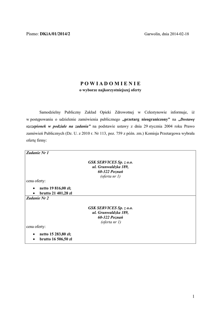 Pismo: DKiA/01/2014/2 Garwolin, dnia 2014-02-18 POWIADOMIENIE o wyborze najkorzystniejszej oferty Samodzielny Publiczny Zakład Opieki Zdrowotnej w Celestynowie informuje, iż w postępowaniu o udzielenie zamówienia publicznego „przetarg nieograniczony” na „Dostawę szczepionek w podziale na zadania” na podstawie ustawy z dnia 29 stycznia 2004 roku Prawo zamówień Publicznych (Dz. U. z 2010 r. Nr 113, poz. 759 z późn. zm.) Komisja Przetargowa wybrała ofertę firmy: Zadanie Nr 1 GSK SERVICES Sp. z o.o. ul. Grunwaldzka 189, 60-322 Poznań (oferta nr 1) cena oferty: netto 19 816,00 zł; brutto 21 401,28 zł Zadanie Nr 2 GSK SERVICES Sp. z o.o. ul. Grunwaldzka 189, 60-322 Poznań (oferta nr 1) cena oferty: netto 15 283,80 zł; brutto 16 506,50 zł 1 Zadanie Nr 3 GSK SERVICES Sp. z o.o. ul. Grunwaldzka 189, 60-322 Poznań (oferta nr 1) cena oferty: netto 20 022,00 zł; brutto 21 623,76 zł Zadanie Nr 4 GSK SERVICES Sp. z o.o. ul. Grunwaldzka 189, 60-322 Poznań (oferta nr 1) cena oferty: netto 7 810,50 zł; brutto 8 435,34 zł Zadanie Nr 6 POLYPHARM S.A. ul. Barska 33, 02-315 Warszawa (oferta nr 2) cena oferty: netto 12 153,00 zł; brutto 13 125,24 zł Zadanie Nr 7 POLYPHARM S.A. ul. Barska 33, 02-315 Warszawa (oferta nr 2) cena oferty: netto 3 704,00 zł; brutto 4 000,32 zł Zadanie Nr 9 GSK SERVICES Sp. z o.o. ul. Grunwaldzka 189, 60-322 Poznań (oferta nr 1) cena oferty: netto 3 425,40 zł; brutto 3 699,43 zł 2 Zadanie Nr 10 POLYPHARM S.A. ul. Barska 33, 02-315 Warszawa (oferta nr 2) cena oferty: netto 1 069,40 zł; brutto 1 154,95 zł Zadanie Nr 11 POLYPHARM S.A. ul. Barska 33, 02-315 Warszawa (oferta nr 2) cena oferty: netto 1 500,00 zł; brutto 1 620,00 zł Zadanie Nr 13 POLYPHARM S.A. ul. Barska 33, 02-315 Warszawa (oferta nr 2) cena oferty: netto 745,35 zł; brutto 804,98 zł Zadanie Nr 14 GSK SERVICES Sp. z o.o. ul. Grunwaldzka 189, 60-322 Poznań (oferta nr 1) cena oferty: netto 781,20 zł; brutto 843,70 zł Zadanie Nr 15 POLYPHARM S.A. ul. Barska 33, 02-315 Warszawa (oferta nr 2) cena oferty: netto 911,20 zł; brutto 984,10 zł 3 Zadanie Nr 16 POLYPHARM S.A. ul. Barska 33, 02-315 Warszawa (oferta nr 2) cena oferty: netto 841,30 zł; brutto 908,60 zł Zadanie Nr 17 GSK SERVICES Sp. z o.o. ul. Grunwaldzka 189, 60-322 Poznań (oferta nr 1) cena oferty: netto 1 468,90 zł; brutto 1 586,41 zł Zadanie Nr 18 POLYPHARM S.A. ul. Barska 33, 02-315 Warszawa (oferta nr 2) cena oferty: netto 8 044,20 zł; brutto 8 687,74 zł Uzasadnienie wyboru: Komisja Przetargowa wybrała oferty z przedstawiające najkorzystniejsze ceny, spełniające warunki udziału w postępowaniu, kompletne oraz nie podlegające odrzuceniu. Komisja Przetargowa na podstawie kryterium oceny ofert znajdującego się w SIWZ udzieliła ww. ofertom następującej punktacji: Streszczenie oceny i porównania złożonych ofert Numer oferty Pakiet (Zadanie) Nr 1 1 1 2 1 3 1 4 2 6 2 7 1 9 Nazwa (firma) i adres wykonawcy GSK SERVICES Sp. z o.o. ul. Grunwaldzka 189, 60-322 Poznań GSK SERVICES Sp. z o.o. ul. Grunwaldzka 189, 60-322 Poznań GSK SERVICES Sp. z o.o. ul. Grunwaldzka 189, 60-322 Poznań GSK SERVICES Sp. z o.o. ul. Grunwaldzka 189, 60-322 Poznań POLYPHARM S.A. ul. Barska 33, 02-315 Warszawa POLYPHARM S.A. ul. Barska 33, 02-315 Warszawa GSK SERVICES Sp. z o.o. ul. Grunwaldzka 189, 60-322 Poznań Liczba pkt w kryterium Cena – 100% Razem 100 100 100 100 100 100, 100 100 100 100 100 100 100 100 4 2 10 1 10 2 11 2 13 1 14 2 15 2 16 1 17 2 18 POLYPHARM S.A. ul. Barska 33, 02-315 Warszawa GSK SERVICES Sp. z o.o. ul. Grunwaldzka 189, 60-322 Poznań POLYPHARM S.A. ul. Barska 33, 02-315 Warszawa POLYPHARM S.A. ul. Barska 33, 02-315 Warszawa GSK SERVICES Sp. z o.o. ul. Grunwaldzka 189, 60-322 Poznań POLYPHARM S.A. ul. Barska 33, 02-315 Warszawa POLYPHARM S.A. ul. Barska 33, 02-315 Warszawa GSK SERVICES Sp. z o.o. ul. Grunwaldzka 189, 60-322 Poznań POLYPHARM S.A. ul. Barska 33, 02-315 Warszawa 100 100 74,06 74,06 100 100 100 100 100 100 100 100 100 100 100 100 100 100 W niniejszym postępowaniu nie wykluczono żadnego Wykonawcy oraz nie odrzucono żadnej oferty. Umowa w sprawie zamówienia publicznego może być zawarta po dniu 24.02.2014 r. Zamawiający unieważnił postępowanie w poniższym zakresie: Zadanie nr 5; Zadanie nr 8; Zadanie nr 12. Zadania unieważniono w trybie art. 93 ust. 1 pkt 1 ustawy z dnia 29 stycznia 2004 roku Prawo Zamówień Publicznych (Dz. U. z 2010 r. Nr 113 poz. 759 z późn. zm.) „nie złożono żadnej oferty niepodlegającej odrzuceniu albo nie wpłynął żaden wniosek o dopuszczenie do udziału w postępowaniu od wykonawcy niepodlegającego wykluczeniu, z zastrzeżeniem pkt 2 i 3”. W przedmiotowym postępowaniu w danym zadaniu nie wpłynęła żadna oferta. Jednocześnie zawiadamiamy, iż wobec czynności podjętych przez Zamawiającego w toku postępowania mają Państwo prawo wnieść odwołanie w terminach i formie określonych w art. 180 ustawy Prawo Zamówień Publicznych. ZATWIERDZAM Lech Krasieńko 5