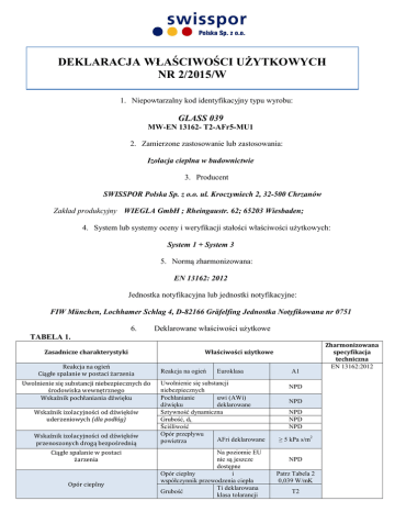 DEKLARACJA WŁAŚCIWOŚCI UŻYTKOWYCH NR 2/2015/W 1. Niepowtarzalny kod identyfikacyjny typu wyrobu: GLASS 039 MW-EN 13162- T2-AFr5-MU1 2. Zamierzone zastosowanie lub zastosowania: Izolacja cieplna w budownictwie 3. Producent SWISSPOR Polska Sp. z o.o. ul. Kroczymiech 2, 32-500 Chrzanów Zakład produkcyjny WIEGLA GmbH ; Rheingaustr. 62; 65203 Wiesbaden; 4. System lub systemy oceny i weryfikacji stałości właściwości użytkowych: System 1 + System 3 5. Normą zharmonizowana: EN 13162: 2012 Jednostka notyfikacyjna lub jednostki notyfikacyjne: FIW München, Lochhamer Schlag 4, D-82166 Gräfelfing Jednostka Notyfikowana nr 0751 6. Deklarowane właściwości użytkowe TABELA 1. Zasadnicze charakterystyki Reakcja na ogień Ciągłe spalanie w postaci żarzenia Uwolnienie się substancji niebezpiecznych do środowiska wewnętrznego Wskaźnik pochłaniania dźwięku Wskaźnik izolacyjności od dźwięków uderzeniowych (dla podłóg) Wskaźnik izolacyjności od dźwięków przenoszonych drogą bezpośrednią Ciągłe spalanie w postaci żarzenia Opór cieplny Właściwości użytkowe Reakcja na ogień Euroklasa Uwolnienie się substancji niebezpiecznych Pochłanianie αwi (AWi) dźwięku deklarowane Sztywność dynamiczna Grubość, dL Ściśliwość Opór przepływu AFri deklarowane powietrza Na poziomie EU nie są jeszcze dostępne Opór cieplny i współczynnik przewodzenia ciepła Ti deklarowana Grubość klasa tolarancji A1 NPD NPD NPD NPD NPD ≥ 5 kPa s/m2 NPD Patrz Tabela 2 0,039 W/mK T2 Zharmonizowana specyfikacja techniczna EN 13162:2012 Krótkotrwała nasiąkliwość wodą Długotrwała nasiąkliwość wodą Przepuszczalność wody Przepuszczalność pary wodnej Wytrzymałość na ściskanie NPD NPD Przenikanie pary wodnej MU1 Naprężenia ściskające lub wytrzymałość na ściskanie NPD Obciążenie punktowe NPD Trwałość reakcji na ogień w funkcji ciepła, warunków atmosferycznych, starzenia Trwałość właściwości Opór cieplny i współczynnik przewodzenia ciepła Trwałość właściwości Wytrzymałość na rozciąganie prostopadle do powierzchni czołowych Trwałość oporu cieplnego w funkcji ciepła, warunków atmosferycznych, starzenia Wytrzymałość na rozciąganie / zginanie Trwałość pełzania przy ściskaniu w funkcji starzenia Nie zmienia się w czasie Nie zmienia się w czasie NPD EN 13162:2012 NPD Pełzanie przy ściskaniu NPD Tabela 2. Grubość [mm] 10 15 20 25 30 40 50 60 70 80 90 100 110 120 125 0,25 0,35 0,50 0,60 0,75 1,00 1,25 1,50 1,75 2,05 2,30 2,55 2,80 3,05 3,20 140 150 160 175 180 200 220 240 250 260 280 300 3,55 3,80 4,10 4,45 4,60 5,10 5,60 6,15 6,40 6,65 7,15 7,65 Opór cieplny Grubość [mm] Opór cieplny Właściwości użytkowe określonego powyżej wyrobu są zgodne z zestawem deklarowanych właściwości użytkowych. Niniejsza deklaracja właściwości użytkowych wydana zostaje zgodnie z rozporządzeniem (UE) nr 305/2011 na wyłączną odpowiedzialność producenta określonego powyżej. W imieniu producenta podpisała : W Pelplinie www.swisspor.pl dnia : dnia : 24.04.2015 KARTA TECHNICZNA GLASS 039 OPIS Swisspor GLASS to lekkie maty ze szklanej wełny mineralnej do izolacji cieplnej. Głównymi surowcami używanymi do produkcji wełny szklanej są stłuczka szklana i piasek kwarcowy. Nie przyczynia się do rozprzestrzeniania ognia, nie wydziela dymu. PARAMETRY TECHNICZNEA Kod wyrobu zgodnie z EN 13162:2012 MW-EN 13162- T2-AFr5-MU1 deklarowany współczynnik przewodzenia ciepła D– 0,039 [W/mK] klasa tolerancji grubości T2 opór właściwy przepływu powietrza wg EN 29053 ≥5,0 kPa s/m2 Tabela 1. Deklarowane wartości oporu cieplnego RD Grubość [mm] 50 80 100 120 150 160 180 200 1,25 2,05 2,55 3,05 3,80 4,10 4,60 5,10 Opór cieplny ZASTOSOWANIE Izolacja cieplna w budownictwie w szczególności: - dachów skośnych, - drewnianych i metalowych ścian o konstrukcji szkieletowej, - poddaszy użytkowych i nieużytkowych, - podłóg i stropów pomiędzy legarami, - sufitów podwieszanych, - ścianek działowych, PRZECHOWYWANIE Produkty fabrycznie zapakowane mogą być składowane na otwartych przestrzeniach magazynowych pod warunkiem , że nie jest uszkodzona folia. Raz rozpakowana paleta nie daje gwarancji, że wełna nie zostanie zawilgocona. Wełny w pojedynczych rolkach należy przechowywać tylko i wyłącznie w pozycji poziomej. PAKOWANIE Tabela 2. Pakowanie Grubość [mm] 50 Szerokość [mm] długość [mm] Ilość m² w rolce [m²] Ilość rolek na palecie Ilość m² na palecie [m²] 80 100 120 150 160 180 200 1200 1200 1200 1200 1200 1200 1200 1200 14000 9000 7000 6000 4700 4500 4000 3500 16,80 10,80 8,40 7,20 5,64 5,40 4,80 4,20 24 24 24 24 24 24 24 24 403,2 259,2 201,60 172,80 135,40 129,60 115,20 100,8 WYTYCZNE APLIKACYJNE - Do montażu wełny przystępujemy wtedy kiedy w pomieszczeniach wilgotność jest zgodna z wilgotnością dopuszczalną do mocowania płyt gipsowo-kartonowych. Zgodnie z zaleceniami producenta GK - Po rozpakowaniu wełny należy odczekać kilka minut do czasu, aż się rozpręży do nominalnej grubości , w razie potrzeby wełną należy wstrząsnąć chwytając za jeden z końców. - Przed przystąpieniem do układania wełny należy dokładnie zwymiarować rozstaw krokwi, legarów na podłodze czy też stelaży w ścinakach szkieletowych. Następnie za pomocą specjalnego noża do wełny docinamy właściwe wymiary powiększone o około 2 cm , w celu zaklinowania się wełny. - Wełnę należy układać bardzo starannie i ciasno tak, aby nie tworzyć mostków termicznych. - W przypadku aplikacji wełny między krokwiami należy szczególną uwagę zwrócić na rodzaj zastosowanej membrany paroprzepuszczalnej. W przypadku folii o wysokiej paroprzepuszczalności wełnę dosuwa się bezpośrednio do niej. Gdy folia ma niską paroprzepuszczalność, wymagane jest zachowanie 3-6 cm szczeliny wentylacyjnej nad wełną. DZIAŁ OBSŁUGI SPRZEDAŻY Zakład Produkcyjny w Pelplinie Zakład Produkcyjny w Ch
