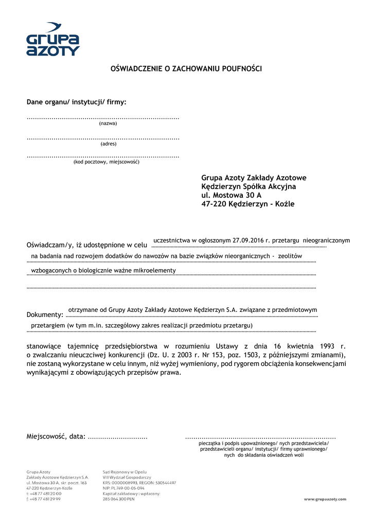 OŚWIADCZENIE O ZACHOWANIU POUFNOŚCI Dane organu/ instytucji/ firmy: .......................................................................... (nazwa) .......................................................................... (adres) .......................................................................... (kod pocztowy, miejscowość) Grupa Azoty Zakłady Azotowe Kędzierzyn Spółka Akcyjna ul. Mostowa 30 A 47-220 Kędzierzyn - Koźle uczestnictwa w ogłoszonym 27.09.2016 r. przetargu nieograniczonym Oświadczam/y, iż udostępnione w celu ………………………………………………………………………………………………………………. na badania nad rozwojem dodatków do nawozów na bazie związków nieorganicznych - zeolitów ………………………………………………………………………………………………………………………………………………………………………………………… wzbogaconych o biologicznie ważne mikroelementy ………………………………………………………………………………………………………………………………………………………………………………………… ………………………………………………………………………………………………………………………………………………………………………………………… otrzymane od Grupy Azoty Zakłady Azotowe Kędzierzyn S.A. związane z przedmiotowym Dokumenty: ………………………………………………………………………………………………………………………………………………………………… przetargiem (w tym m.in. szczegółowy zakres realizacji przedmiotu przetargu) ………………………………………………………………………………………………………………………………………………………………………………………… stanowiące tajemnicę przedsiębiorstwa w rozumieniu Ustawy z dnia 16 kwietnia 1993 r. o zwalczaniu nieuczciwej konkurencji (Dz. U. z 2003 r. Nr 153, poz. 1503, z późniejszymi zmianami), nie zostaną wykorzystane w celu innym, niż wyżej wymieniony, pod rygorem obciążenia konsekwencjami wynikającymi z obowiązujących przepisów prawa. Miejscowość, data: ............................. ......................................................................... pieczątka i podpis upoważnionego/ nych przedstawiciela/ przedstawicieli organu/ instytucji/ firmy uprawnionego/ nych do składania oświadczeń woli
