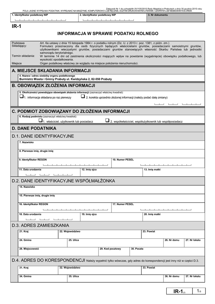 Załącznik Nr 1 do uchwałyNr XV/105/2015 Rady Miejskiej w Prabutach z dnia 30 grudnia 2015 roku POLA JASNE WYPEŁNIA PODATNIK. WYPEŁNIAĆ NA MASZYNIE, KOMPUTEROWO LUB RĘCZNIE, DUŻYMI DRUKOWANYMI LITERAMI, CZARNYM LUB NIEBIESKIM KOLOREM. 1. Identyfikator podatkowy NIP 2. Identyfikator podatkowy NIP 3. Nr dokumentu IR-1 INFORMACJA W SPRAWIE PODATKU ROLNEGO Podstawa Składający: Art. 6a ustawy z dnia 15 listopada 1984 r. o podatku rolnym (Dz. U. z 2013 r. poz. 1381, z późn. zm.) Formularz przeznaczony dla osób fizycznych będących właścicielami gruntów, posiadaczami samoistnymi gruntów, użytkownikami wieczystymi gruntów, posiadaczami gruntów stanowiących własność Skarbu Państwa lub jednostki samorządu terytorialnego. W terminie 14 dni od zaistnienia okoliczności mających wpływ na powstanie (wygaśnięcie) obowiązku podatkowego, lub wysokość opodatkowania. Organ podatkowy właściwy ze względu na miejsce położenia nieruchomości. Termin składania: Miejsce A. MIEJSCE SKŁADANIA INFORMACJI 4. Nazwa i adres siedziby organu podatkowego Burmistrz Miasta i Gminy Prabuty ul. Kwidzyńska 2, 82-550 Prabuty B. OBOWIĄZEK ZŁOŻENIA INFORMACJI 5. Okoliczności powodujące obowiązek złożenia informacji (zaznaczyć właściwy kwadrat): 1. informacja składana po raz pierwszy 2. korekta uprzednio złożonej informacji (należy podać datę zmiany) C. PODMIOT ZOBOWIĄZANY DO ZŁOŻENIA INFORMACJI 6. Rodzaj podmiotu (zaznaczyć właściwy kwadrat): 1. właściciel, użytkownik lub posiadacz 2. współwłaściciel, współużytkownik lub współposiadacz D. DANE PODATNIKA D.1. DANE IDENTYFIKACYJNE 7. Nazwisko 8. Pierwsze imię, drugie imię 9. Identyfikator REGON 10. Numer PESEL 11. Data urodzenia 12. Imię ojca 13. Imię matki D.2. DANE IDENTYFIKACYJNE WSPÓŁMAŁŻONKA 14. Nazwisko 15. Pierwsze imię, drugie imię 16. Identyfikator REGON 17. Numer PESEL 18. Data urodzenia 19. Imię ojca 20. Imię matki D.3. ADRES ZAMIESZKANIA 21. Kraj 24. Gmina 22. Województwo 23. Powiat 25. Ulica 28. Miejscowość 26. Nr domu 29. Kod pocztowy 27. Nr lokalu 30. Poczta D.4. ADRES DO KORESPONDENCJI Należy wypełnić tylko wówczas, gdy adres do korespondencji jest inny niż w części D.3. 31. Kraj 34. Gmina 32. Województwo 35. Ulica 33. Powiat 36. Nr domu 37. Nr lokalu IR-1 (2) 1/5 POLA JASNE WYPEŁNIA PODATNIK. WYPEŁNIAĆ NA MASZYNIE, KOMPUTEROWO LUB RĘCZNIE, DUŻYMI DRUKOWANYMI LITERAMI, CZARNYM LUB NIEBIESKIM KOLOREM. 38. Miejscowość 39. Kod pocztowy 40. Poczta E. DANE O GRUNTACH ROLNYCH PODLEGAJĄCYCH OPODATKOWANIU LUB ZWOLNIENIU E.1. TYTUŁ PRAWNY (zaznaczyć właściwy kwadrat): 41. Rodzaj własności 42. Rodzaj posiadania samoistnego 1. własność 2. współwłasność 1. posiadanie 43. Rodzaj użytkowania 2. współposiadanie 44. Rodzaj posiadania zależnego 1. użytkowanie wieczyste 2. współużytkowanie wieczyste 1. posiadanie 2. współposiadanie E.2. POŁOŻENIE GRUNTÓW ORAZ IDENTYFIKATORY GEODEZYJNE DZIAŁEK 45. Położenie gruntów rolnych (obręb geodezyjny) oraz identyfikatory działek E.3. KSIĘGA WIECZYSTA 46. Numer księgi wieczystej (zbioru dokumentów) 47. Nazwa sądu F. DANE DOTYCZĄCE UŻYTKÓW ROLNYCH STANOWIĄCYCH GOSPODARSTWO ROLNE1) F.1. GRUNTY ORNE Klasa użytków rolnych Powierzchnia w ha I II 48. IIIa 49. 50. IVa 51. , , IIIb , IVb 52. , 53. , , F.2. ŁĄKI I PASTWISKA Klasa użytków rolnych Powierzchnia w ha I II 54. III 55. IV 56. , 57. , , , F.3. SADY Klasa użytków rolnych Powierzchnia w ha I II 58. III, IIIa 59. , IIIb 60. , 61. , IV, IVa 62. , IVb 63. , , F.4. GRUNTY POD STAWAMI ZARYBIONYMI - łososiem, trocią, głowacicą, palią i pstrągiem Powierzchnia w ha 64. , F.5. GRUNTY POD STAWAMI ZARYBIONYMI - inne gatunki ryb Powierzchnia w ha 65. , IR-1 (2) 2/5 POLA JASNE WYPEŁNIA PODATNIK. WYPEŁNIAĆ NA MASZYNIE, KOMPUTEROWO LUB RĘCZNIE, DUŻYMI DRUKOWANYMI LITERAMI, CZARNYM LUB NIEBIESKIM KOLOREM. F.6. GRUNTY POD STAWAMI NIEZARYBIONYMI Powierzchnia w ha 66. , F.7. GRUNTY ROLNE ZABUDOWANE Powierzchnia w ha 67. , F.8. UŻYTKI ROLNE O NIEUSTALONYM PRZELICZNIKU POWIERZCHNI Powierzchnia w ha 68. , F.9. GRUNTY POD ROWAMI Powierzchnia w ha 69. , G. DANE DOTYCZĄCE UŻYTKÓW ROLNYCH NIESTANOWIĄCYCH GOSPODARSTWA 1) ROLNEGO – NIEPODLEGAJĄCYCH ZWOLNIENIU Powierzchnia w ha 70. , H. INFORMACJE DODATKOWE MMMMMMMMMMMMMMMMMMMMMMMMMMMMMMMMMMMMMMMMMMMMMMMMMMMMMMMMMMMMMMMMMMMMMMMMM MMMMMMMMMMMMMMMMMMMMMMMMMMMMMMMMMMMMMMMMMMMMMMMMMMMMMMMMMMMMMMMMMMMMMMMMM MMMMMMMMMMMMMMMMMMMMMMMMMMMMMMMMMMMMMMMMMMMMMMMMMMMMMMMMMMMMMMMMMMMMMMMMM MMMMMMMMMMMMMMMMMMMMMMMMMMMMMMMMMMMMMMMMMMMMMMMMMMMMMMMMMMMMMMMMMMMMMMMMM MMMMMMMMMMMMMMMMMMMMMMMMMMMMMMMMMMMMMMMMMMMMMMMMMMMMMMMMMMMMMMMMMMMMMMMMM I. INFORMACJA O ZAŁĄCZNIKACH (do niniejszej informacji dołączono) 71. Załącznik ZR-1/B (zaznaczyć właściwy kwadrat): tak nie J. PODPIS PODATNIKA / OSOBY REPREZENTUJĄCEJ PODATNIKA 72. Imię 73. Nazwisko 74. Data wypełnienia informacji (dzień - miesiąc - rok) 75. Podpis (pieczęć) podatnika / osoby reprezentującej podatnika2) K. ADNOTACJE ORGANU PODATKOWEGO 76. Uwagi organu podatkowego 78. Data (dzień - miesiąc - rok) 79. Podpis przyjmującego formularz . 1) 2) Należy podać z dokładnością do czterech miejsc po przecinku. Niepotrzebne skreślić. Pouczenie Za podanie nieprawdy lub zatajenie prawdy i przez to narażenie podatku na uszczuplenie grozi odpowiedzialność przewidziana w Kodeksie karnym skarbowym. IR-1 3/5 (2) POLA JASNE WYPEŁNIA PODATNIK. WYPEŁNIAĆ NA MASZYNIE, KOMPUTEROWO LUB RĘCZNIE, DUŻYMI DRUKOWANYMI LITERAMI, CZARNYM LUB NIEBIESKIM KOLOREM. 2. Identyfikator podatkowy NIP 3. Nr dokumentu ZR-1/B DANE O ZWOLNIENIACH I ULGACH PODATKOWYCH W PODATKU ROLNYM E. PRZEZNACZENIE FORMULARZA 4. Niniejszy formularz stanowi załącznik do (zaznaczyć właściwy kwadrat): 1. deklaracji DR-1 2. informacji IR-1 F. DANE PODATNIKA * - dotyczy podatnika niebędącego osobą fizyczną ** - dotyczy podatnika będącego osobą fizyczną F.1. DANE IDENTYFIKACYJNE 5. Rodza