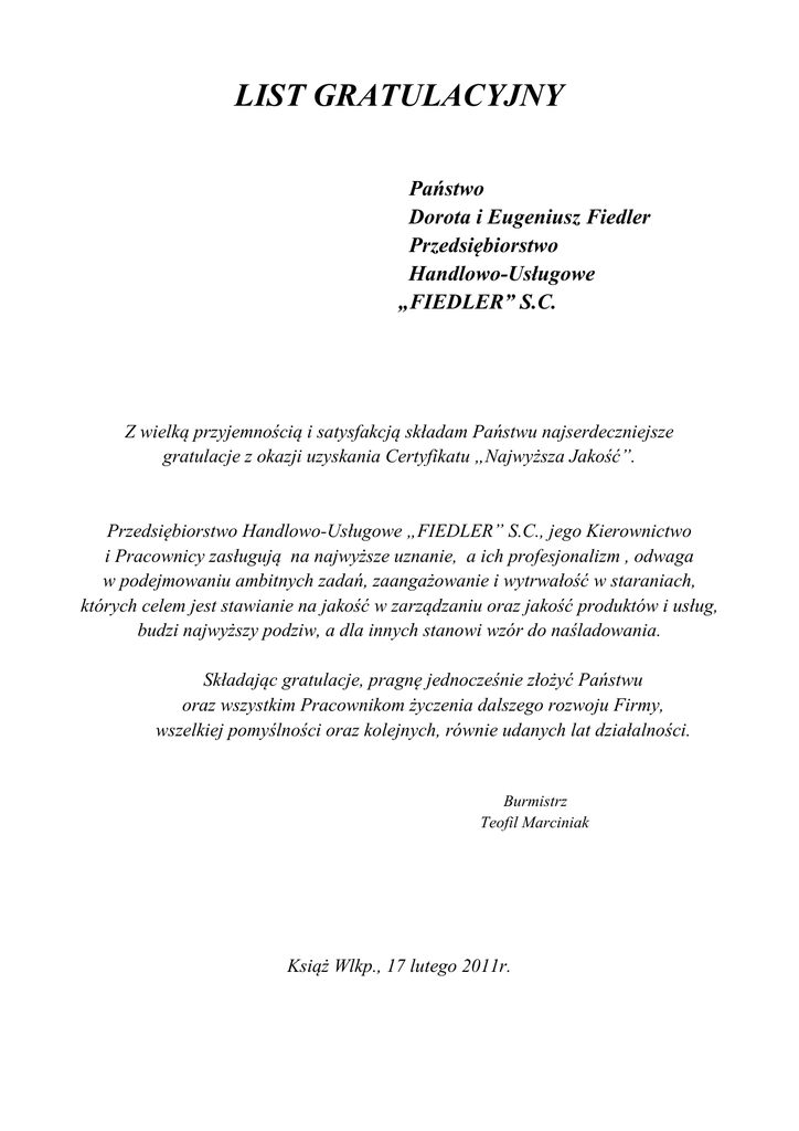 LIST GRATULACYJNY Państwo Dorota i Eugeniusz Fiedler Przedsiębiorstwo Handlowo-Usługowe „FIEDLER” S.C. Z wielką przyjemnością i satysfakcją składam Państwu najserdeczniejsze gratulacje z okazji uzyskania Certyfikatu „Najwyższa Jakość”. Przedsiębiorstwo Handlowo-Usługowe „FIEDLER” S.C., jego Kierownictwo i Pracownicy zasługują na najwyższe uznanie, a ich profesjonalizm , odwaga w podejmowaniu ambitnych zadań, zaangażowanie i wytrwałość w staraniach, których celem jest stawianie na jakość w zarządzaniu oraz jakość produktów i usług, budzi najwyższy podziw, a dla innych stanowi wzór do naśladowania. Składając gratulacje, pragnę jednocześnie złożyć Państwu oraz wszystkim Pracownikom życzenia dalszego rozwoju Firmy, wszelkiej pomyślności oraz kolejnych, równie udanych lat działalności. Burmistrz Teofil Marciniak Książ Wlkp., 17 lutego 2011r.