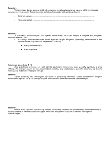 Zadanie 1. Wykorzystując dane z szeregu elektrochemicznego metali napisz schemat ogniwa, w którym elektroda cynkowa pełni rolę anody. Zapisz równanie reakcji zachodzącej w półogniwie cynkowym. Schemat ogniwa: ......................................................................................................................... Równanie reakcji: ........................................................................................................................ Zadanie 2 W warunkach standardowych SEM ogniwa metalicznego, w którym jednym z półogniw jest półogniwo srebrowe wynosi 1,20 V. W szeregu elektrochemicznym metali wyszukaj drugie półogniwo (elektrodę) zastosowane w tym ogniwie i określ, czy pełni ono rolę katody, czy anody. Półogniwo (elektroda): ............................................................................................................... Rola w ogniwie: .......................................................................................................................... Informacja do zadania 3. i 4. Dwa przedmioty wykonane ze stali pokryto powłokami ochronnymi, jeden powłoką cynkową, a drugi niklową. Po pewnym czasie na obu przedmiotach powstały rysy uszkadzające powłoki. Utworzyły się lokalne mikroogniwa metaliczne i nastąpiła korozja. Zadanie 3. Zapisz schematy obu mikroogniw opisanych w powyższej informacji. (Załóż powstawanie półogniw + metalicznych typu M│Mn ). Dla jednego z ogniw oblicz wartość SEM w warunkach standardowych. Zadanie 4. Wskaż, która z powłok, cynkowa czy niklowa, skuteczniej chroni żelazo przed korozją elektrochemiczną w sytuacji opisanej w informacji wprowadzającej. Uzasadnij swój wybór w oparciu o wartości potencjałów standardowych. Zadanie: 5 Wykorzystując podane w tabeli szeregu elektrochemicznego metali wartości potencjałów standardowych elektrod, zaprojektuj dwa różne ogniwa, w których miedź spełniać będzie rolę: Przedstaw schematy tych ogniw. a) katody, b) anody. Zadanie 6 Reakcję chemiczną zachodzącą w pewnym ogniwie opisuje równanie: Przedstaw schemat tego ogniwa i napisz równania reakcji przebiegających w jego półogniwach. Schemat ogniwa: ......................................................................................................................... Równania reakcji: ........................................................................................................................ Zadanie 7 W jednym naczyniu znajduje się 1-molowy roztwór ZnSO4, do którego zanurzono płytkę cynkową. W drugim naczyniu przygotowano 1-molowy roztwór MgSO4 i zanurzono w nim płytkę magnezową. Następnie naczynia połączono kluczem elektrolitycznym. 1. Zapisz równania reakcji zachodzących w półogniwach po zamknięciu obwodu oraz wskaż anodę i katodę w tak przygotowanym ogniwie. 2. Wskaż kierunek przepływu prądu w obwodzie zewnętrznym ogniwa. 3. Oblicz SEM tego ogniwa. Zadanie: 8 Korzystając z szeregu napięciowego metali określ jaką rolę w ogniwie chemicznym (anody, katody, elektrody ujemnej, elektrody dodatniej) pełni miedź, jeżeli drugim metalem jest cynk. Podaj zapis ogniwa z kluczem elektrolitycznym (podając roztwory konkretnych związków chemicznych). Zapisz równania reakcji elektrodowych oraz oblicz SEM tego ogniwa w warunkach standardowych. Anoda: ......................................... elektroda: .......................................... Katoda: ........................................ elektroda: .......................................... Zapis ogniwa chemicznego: ............................................................................. Równania reakcji elektrodowych: ................................ ........................................ SEM: ................................................................................................................. Zadanie 9 Poniżej przedstawiono zbiór kilku pólogniw metalicznych. Ag/Ag+, AI/Al3+, Cu/Cu2+, Mg/Mg2+, Pb/Pb2+ 3 Stężenia jonów metali we wszystkich pólogniwach są równe 1 mol/dm , a temperatura wynosi 25°C. Z powyższego zbioru pólogniw wybrano dwa, z których zbudowano ogniwo galwaniczne o maksymalnej wartości siły elektromotorycznej. Korzystając z szeregu elektrochemicznego metali, przedstaw schemat ogniwa opisanego w informacji do zadania. Zapisz w formie jonowej skróconej sumaryczne równanie reakcji zachodzącej w tym ogniwie. Schemat ogniwa:.............................................................................. Równanie reakcji:............................................................................. Oblicz siłę elektromotoryczną tego ogniwa w warunkach standardowych. Zadanie 10 Zaprojektuj ogniwo chemiczne, w którym półogniwo wodorowe SPW będzie katodą, a rolę anody będzie pełnić cynkowe półogniwo metaliczne. Podaj międzynarodowy zapis tego ogniwa z kluczem elektrolitycznym: SEM tego ogniwa w warunkach standardowych wynosi:...................................................................... 3 SEM tego ogniwa dla stężenia aktywnego kationu metalu wynoszącego 0,01 mol/dm . reakcja katodowa: ................................................................................................................................... reakcja anodowa: .................................................................................................................................... reakcja sumaryczna biegnąca w ogniwie w formie jonowej: reakcja sumaryczna biegnąca w ogniwie w formie cząsteczkowej: Zadanie: 11 Podaj schemat ogniwa Daniella, zapisz reakcje zachodzące na elektrodach oraz oblicz siłę elektromotoryczną tego ogniwa. Zadanie 12 W ogniwie galwanicznym zachodzi reakcja: 2+ 3+ 4+ 2+ Sn + 2Fe Sn + 2Fe Ułóż równania reakcji elektrodowych, wskaż anodę i katodę oraz przedstaw schemat ogniwa. Zadanie 13 Zaprojektuj dwa ogniwa galwaniczne (napisz schematy tych ogniw) tak, aby w każdym z nich jedną z elekt