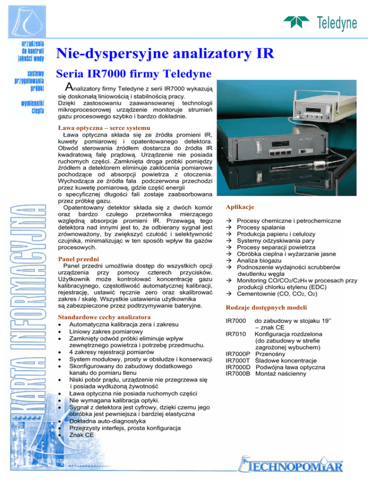 Nie-dyspersyjne analizatory IR Seria IR7000 firmy Teledyne Analizatory firmy Teledyne z serii IR7000 wykazują się doskonałą liniowością i stabilnością pracy. Dzięki zastosowaniu zaawansowanej technologii mikroprocesorowej urządzenie monitoruje strumień gazu procesowego szybko i bardzo dokładnie. Ława optyczna – serce systemu Ława optyczna składa się ze źródła promieni IR, kuwety pomiarowej i opatentowanego detektora. Obwód sterowania źródłem dostarcza do źródła IR kwadratową falę prądową. Urządzenie nie posiada ruchomych części. Zamknięta droga próbki pomiędzy źródłem a detektorem eliminuje zakłócenia pomiarowe pochodzące od absorpcji powietrza z otoczenia. Wychodząca ze źródła fala podczerwona przechodzi przez kuwetę pomiarową, gdzie część energii o specyficznej długości fali zostaje zaabsorbowana przez próbkę gazu. Opatentowany detektor składa się z dwóch komór oraz bardzo czułego przetwornika mierzącego względną absorpcje promieni IR. Przewagą tego detektora nad innymi jest to, że odbierany sygnał jest zrównoważony, by zwiększyć czułość i selektywność czujnika, minimalizując w ten sposób wpływ tła gazów procesowych. Panel przedni Panel przedni umożliwia dostęp do wszystkich opcji urządzenia przy pomocy czterech przycisków. Użytkownik może kontrolować koncentrację gazu kalibracyjnego, częstotliwość automatycznej kalibracji, rejestrację, ustawić ręcznie zero oraz skalibrować zakres / skalę. Wszystkie ustawienia użytkownika są zabezpieczone przez podtrzymywanie bateryjne. Standardowe cechy analizatora • • • • • • • • • • • • • Automatyczna kalibracja zera i zakresu Liniowy zakres pomiarowy Zamknięty odwód próbki eliminuje wpływ zewnętrznego powietrza i potrzebę przedmuchu. 4 zakresy rejestracji pomiarów System modułowy, prosty w obsłudze i konserwacji Skonfigurowany do zabudowy dodatkowego kanału do pomiaru tlenu Niski pobór prądu, urządzenie nie przegrzewa się i posiada wydłużoną żywotność Ława optyczna nie posiada ruchomych części Nie wymagana kalibracja optyki. Sygnał z detektora jest cyfrowy, dzięki czemu jego obróbka jest pewniejsza i bardziej elastyczna Dokładna auto-diagnostyka Przejrzysty interfejs, prosta konfiguracja Znak CE Aplikacje Procesy chemiczne i petrochemiczne Procesy spalania Produkcja papieru i celulozy Systemy odzyskiwania pary Procesy separacji powietrza Obróbka cieplna i wyżarzanie jasne Analiza biogazu Podnoszenie wydajności scrubberów dwutlenku węgla Æ Monitoring CO/CO2/C2H4 w procesach przy produkcji chlorku etylenu (EDC) Æ Cementownie (CO, CO2, O2) Æ Æ Æ Æ Æ Æ Æ Æ Rodzaje dostępnych modeli IR7000 IR7010 IR7000P IR7000T IR7000D IR7000B do zabudowy w stojaku 19’’ – znak CE Konfiguracja rozdzelona (do zabudowy w strefie zagrożonej wybuchem) Przenośny Śladowe koncentracje Podwójna ława optyczna Montaż naścienny Dane techniczne Metoda pomiaru: Mierzony gaz: Zakres pomiarowy: Czas odpowiedzi: (T90) Wyświetlacz: Alarmy: Wyjście analogowe: Max. impedancja: Zakresy analogowe: Pobudzanie zaworu do auto kalibracji Zasilanie: Max. pobór mocy: NDIR, pojedyncza wiązka Określony przez użytkownika Określony przez aplikację Określony przez użytkownika typowo 15 – 60s dla znamionowego przepływu Fluorescencyjno - próżniowy Dolny i górny alarm koncentracji do wyboru przez użytkownika 1 A, 60 VDC, 30 VAC 1,5 lub 10 V lub opcjonalnie izolowana galwanicznie pętla prądowa 4-20mA 500 omów, dla wyjścia 4-20 mA 4, konfigurowane w granicach pełnego zakresu. Możliwość automatycznego przełączania Sterowanie triakiem izolowanym galwanicznie. Max. obciążenie 0.6 A 120/240 VAC, 50/60Hz (Model przenośny posiada akumulatory wystarczające na 6h ciągłej pracy) zasilanie 110 VAC - 2 A zasilanie 230 VAC - 1 A 50 wat / kanał Pobór mocy: Materiały w obwodzie przepływu Szkło, złoto, buna-n, lexan, epoxy, próbki: szafir, stal nierdzewna 304 0.2 do 2.0 litrów / minutę Przepływ próbki: (Śladowa koncentracja — 5.0 - 10.0 litrów / minutę) (Przenośny z wewn. pompą) Temperatura próbki: -10° do +50°C Pozbawiona kondensatu i cząstek Stan próbki: stałych Gotowy do użytku po 60 minutach. Czas rozruchu: Optymalne działanie po 3 godz. Temperatura Pracy: Przechowywania: -10° do 50°C (bez kondensacji) -10° do 80°C (0° do 50°C dla czujnika O2) Wymiary Do montażu na stojaku oraz z podwójną ławą opt.: 571mm x 447mm x 133mm (do zabudowy w stojaku 19’’) Przenośny: 508mm x 216mm x 133mm ul. Buforowa 4C, 52-131 Wrocław tel. +4871 332 98 00, faks +4871 332 98 30 www.technopomiar.pl; [email protected] Wymiary (cd.): Naścienny: 609mm x 508mm x 152mm Masa: IR7000 IR7000P IR7000B 17.2kg 8.6kg 19.5kg Standardowe zakresy pomiarowe IR7000 / IR7000P Gaz* Typowy min. zakres* Typowy max. zakres* CO CO2 SO2 NO2 N2O CH4 Propan 0-100 do 0-1000ppm 0-30 do 0-300ppm 0-50 do 0-500ppm 0-100 do 0-1000ppm 0-100 do 0-1000ppm 0-300 do 0-3000ppm 0-100 do 0-1000ppm 0-10% do 0-100% 0-5% do 0-50% 0-10% do 0-100% 0-10% do 0-100% 0-10% do 0-100% 0-10% do 0-100% 0-10% do 0-100% Rozdzielczość: Powtarzalność: Szumy: Dokładność: 0.1% pełnego zakresu +0.1% pełnego zakresu +0.1% pełnego zakresu +0.3% pełnego zakresu zależna tylko od max. zakresu, dla pozostałych zakresów dokładność bezwzględna Zakresy pomiarowe dla śladowowych koncentr. IR7000T Gaz* CO CO2 Zakres min. 0-5 do 0-50ppm 0-2 do 0-20ppm Rozdzielczość: Powtarzalność: Szumy: Dokładność Zakres max. 0-20 do 0-200ppm 0-20 do 0-200ppm Dokładność + 0.25ppm + 0.1ppm lub lepsza z 24h 0.01% ppm +0.25% pełnego zakresu +0.1% pełnego zakresu +0.5% pełnego zakresu zależna tylko od max. zakresu, dla pozostałych zakresów dokładność bezwzględna *Dostępne są cztery zakrasy od minimum do maksimum. Np. dla CO 0-5, 0-10, 0-25, 0-50ppm, wszystkie dla wyjścia 0-1V *Maksymalny zakres w stałych warunkach Pomiar innych gazów
