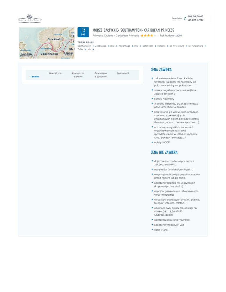 Infolinia 15 MORZE BAŁTYCKIE- SOUTHAMPTON- CARIBBEAN PRINCESS DNI Princess Cruises - Caribbean Princess 801 08 08 03 22 492 77 90 | Rok budowy: 2004 TRASA REJSU: Wewnętrzna TERMIN Southampton Zeebrugge Tallin ... dzie Zewnętrzna Zewnętrzna z oknem z balkonem dzie Kopenhaga Apartament dzie Sztokholm Helsinki St. Petersburg St. Petersburg CENA ZAWIERA zakwaterowanie w 2-os. kabinie wybranej kategorii (cena zależy od położenia kabiny na pokładzie) serwis bagażowy podczas wejścia i zejścia ze statku serwis kabinowy 3 posiłki dziennie, przekąski między posiłkami, bufet o północy korzystanie ze wszystkich urządzeń sportowo - rekreacyjnych znajdujących się na pokładzie statku (baseny, jacuzzi, boiska sportowe…) udział we wszystkich imprezach organizowanych na statku (przedstawienia w teatrze, koncerty, kino, pokazy, animacje...) opłaty NCCF CENA NIE ZAWIERA dojazdu do/z portu rozpoczęcia i zakończenia rejsu transferów (lotnisko/port/hotel...) ewentualnych dodatkowych noclegów przed rejsem lub po rejsie kosztu wycieczek fakultatywnych (kupowanych na statku) napojów gazowanych, alkoholowych, wody mineralnej wydatków osobistych (fryzjer, pralnia, fotograf, internet, telefon...) obowiązkowej opłaty dla obsługi na statku (ok. 13,50-15,50 USD/os./dzień) ubezpieczenia turystycznego kosztu wymaganych wiz opłat i taks