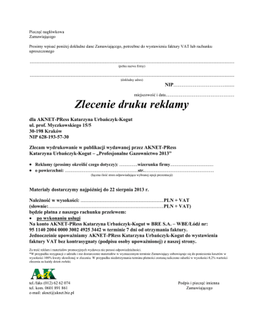 Pieczęć nagłówkowa Zamawiającego Prosimy wpisać poniżej dokładne dane Zamawiającego, potrzebne do wystawienia faktury VAT lub rachunku uproszczonego ..................................................................................................................................................................... (pełna nazwa firmy) ..................................................................................................................................................................... (dokładny adres) NIP......................................................... miejscowość i data.................................................................. Zlecenie druku reklamy dla AKNET-PRess Katarzyna Urbańczyk-Kogut ul. prof. Myczkowskiego 15/5 30-198 Kraków NIP 628-193-57-30 Zlecam wydrukowanie w publikacji wydawanej przez AKNET-PRess Katarzyna Urbańczyk-Kogut – „Profesjonalne Gazownictwo 2013” • Reklamy (prosimy określić czego dotyczy): ................wizerunku firmy...................................... • o powierzchni: ................................................................str.............................................................. (łączna ilość stron odpowiadająca wybranej opcji prezentacji) Materiały dostarczymy najpóźniej do 22 sierpnia 2013 r. Należność w wysokości: ...................................................................PLN + VAT (słownie:.............................................................................................PLN + VAT) będzie płatna z naszego rachunku przelewem: • po wykonaniu usługi Na konto AKNET-PRess Katarzyna Urbańczyk-Kogut w BRE S.A. – WBE/Łódź nr: 95 1140 2004 0000 3002 4925 3442 w terminie 7 dni od otrzymania faktury. Jednocześnie upoważniamy AKNET-PRess Katarzyna Urbańczyk-Kogut do wystawienia faktury VAT bez kontrasygnaty (podpisu osoby upoważnionej) z naszej strony. Za treść reklam i materiałów promocyjnych wydawca nie ponosi odpowiedzialności. *W przypadku rezygnacji z udziału i nie dostarczenie materiałów w wyznaczonym terminie Zamawiający zobowiązuje się do poniesienia kosztów w wysokości 100% kwoty określonej w zleceniu. W przypadku niedotrzymania terminu płatności zostaną naliczone odsetki w wysokości 0,2% wartości zlecenia za każdy dzień zwłoki. tel./faks (012) 62 62 074 tel. kom. 0601 891 861 e-mail: [email protected] Podpis i pieczęć imienna Zamawiającego