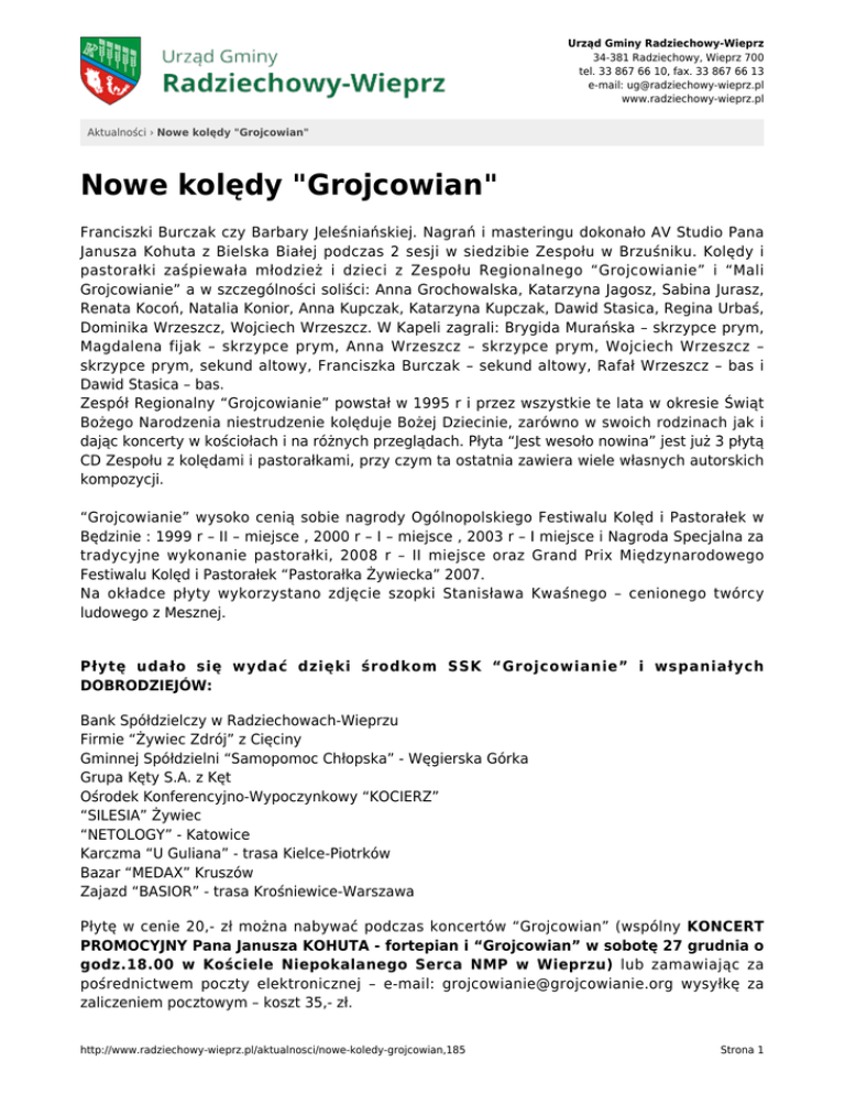Urząd Gminy Radziechowy-Wieprz 34-381 Radziechowy, Wieprz 700 tel. 33 867 66 10, fax. 33 867 66 13 e-mail: [email protected] www.radziechowy-wieprz.pl Aktualności › Nowe kolędy "Grojcowian" Nowe kolędy "Grojcowian" Franciszki Burczak czy Barbary Jeleśniańskiej. Nagrań i masteringu dokonało AV Studio Pana Janusza Kohuta z Bielska Białej podczas 2 sesji w siedzibie Zespołu w Brzuśniku. Kolędy i pastorałki zaśpiewała młodzież i dzieci z Zespołu Regionalnego “Grojcowianie” i “Mali Grojcowianie” a w szczególności soliści: Anna Grochowalska, Katarzyna Jagosz, Sabina Jurasz, Renata Kocoń, Natalia Konior, Anna Kupczak, Katarzyna Kupczak, Dawid Stasica, Regina Urbaś, Dominika Wrzeszcz, Wojciech Wrzeszcz. W Kapeli zagrali: Brygida Murańska – skrzypce prym, Magdalena fijak – skrzypce prym, Anna Wrzeszcz – skrzypce prym, Wojciech Wrzeszcz – skrzypce prym, sekund altowy, Franciszka Burczak – sekund altowy, Rafał Wrzeszcz – bas i Dawid Stasica – bas. Zespół Regionalny “Grojcowianie” powstał w 1995 r i przez wszystkie te lata w okresie Świąt Bożego Narodzenia niestrudzenie kolęduje Bożej Dziecinie, zarówno w swoich rodzinach jak i dając koncerty w kościołach i na różnych przeglądach. Płyta “Jest wesoło nowina” jest już 3 płytą CD Zespołu z kolędami i pastorałkami, przy czym ta ostatnia zawiera wiele własnych autorskich kompozycji. “Grojcowianie” wysoko cenią sobie nagrody Ogólnopolskiego Festiwalu Kolęd i Pastorałek w Będzinie : 1999 r – II – miejsce , 2000 r – I – miejsce , 2003 r – I miejsce i Nagroda Specjalna za tradycyjne wykonanie pastorałki, 2008 r – II miejsce oraz Grand Prix Międzynarodowego Festiwalu Kolęd i Pastorałek “Pastorałka Żywiecka” 2007. Na okładce płyty wykorzystano zdjęcie szopki Stanisława Kwaśnego – cenionego twórcy ludowego z Mesznej. Płytę udało się wydać dzięki środkom SSK “Grojcowianie” i wspaniałych DOBRODZIEJÓW: Bank Spółdzielczy w Radziechowach-Wieprzu Firmie “Żywiec Zdrój” z Cięciny Gminnej Spółdzielni “Samopomoc Chłopska” - Węgierska Górka Grupa Kęty S.A. z Kęt Ośrodek Konferencyjno-Wypoczynkowy “KOCIERZ” “SILESIA” Żywiec “NETOLOGY” - Katowice Karczma “U Guliana” - trasa Kielce-Piotrków Bazar “MEDAX” Kruszów Zajazd “BASIOR” - trasa Krośniewice-Warszawa Płytę w cenie 20,- zł można nabywać podczas koncertów “Grojcowian” (wspólny KONCERT PROMOCYJNY Pana Janusza KOHUTA - fortepian i “Grojcowian” w sobotę 27 grudnia o godz.18.00 w Kościele Niepokalanego Serca NMP w Wieprzu) lub zamawiając za pośrednictwem poczty elektronicznej – e-mail: [email protected] wysyłkę za zaliczeniem pocztowym – koszt 35,- zł. http://www.radziechowy-wieprz.pl/aktualnosci/nowe-koledy-grojcowian,185 Strona 1