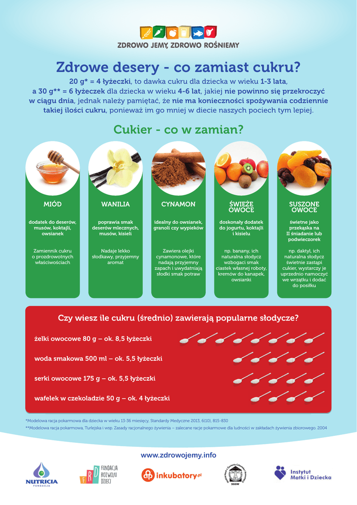 Zdrowe desery - co zamiast cukru? 20 g* = 4 łyżeczki, to dawka cukru dla dziecka w wieku 1-3 lata, a 30 g** = 6 łyżeczek dla dziecka w wieku 4-6 lat, jakiej nie powinno się przekroczyć w ciągu dnia, jednak należy pamiętać, że nie ma konieczności spożywania codziennie takiej ilości cukru, ponieważ im go mniej w diecie naszych pociech tym lepiej. Cukier - co w zamian? MIÓD WANILIA CYNAMON ŚWIEŻE OWOCE SUSZONE OWOCE dodatek do deserów, musów, koktajli, owsianek poprawia smak deserów mlecznych, musów, kisieli idealny do owsianek, granoli czy wypieków doskonały dodatek do jogurtu, koktajli i kisielu świetne jako przekąska na II śniadanie lub podwieczorek Zamiennik cukru o prozdrowotnych właściwościach Nadaje lekko słodkawy, przyjemny aromat Zawiera olejki cynamonowe, które nadają przyjemny zapach i uwydatniają słodki smak potraw np. banany, ich naturalna słodycz wzbogaci smak ciastek własnej roboty, kremów do kanapek, owsianki np. daktyl, ich naturalna słodycz świetnie zastąpi cukier, wystarczy je uprzednio namoczyć we wrzątku i dodać do posiłku Czy wiesz ile cukru (średnio) zawierają popularne słodycze? żelki owocowe 80 g – ok. 8,5 łyżeczki woda smakowa 500 ml – ok. 5,5 łyżeczki serki owocowe 175 g – ok. 5,5 łyżeczki wafelek w czekoladzie 50 g – ok. 4 łyżeczki *Modelowa racja pokarmowa dla dziecka w wieku 13-36 miesięcy, Standardy Medyczne 2013, 6(10), 815-830 **Modelowa racja pokarmowa, Turlejska i wsp. Zasady racjonalnego żywienia – zalecane racje pokarmowe dla ludności w zakładach żywienia zbiorowego. 2004 www.zdrowojemy.info