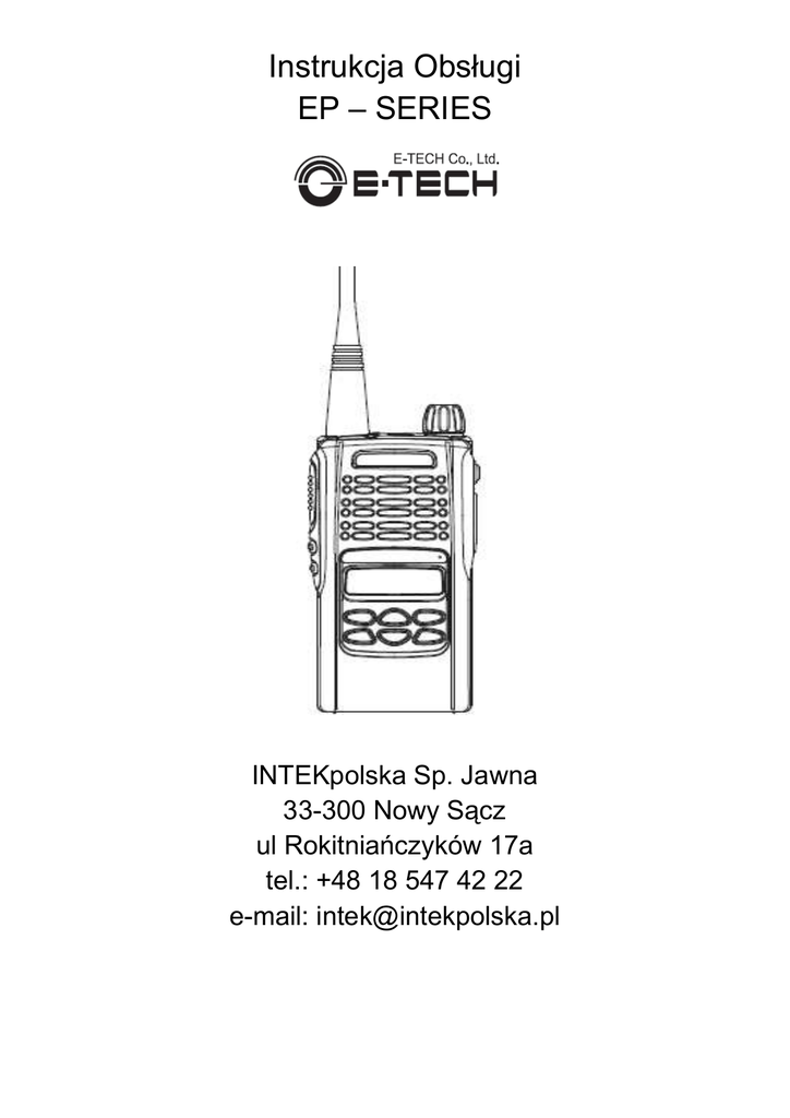 Instrukcja Obsługi EP – SERIES INTEKpolska Sp. Jawna 33-300 Nowy Sącz ul Rokitniańczyków 17a tel.: +48 18 547 42 22 e-mail: [email protected] SPIS TREŚCI Główne funkcje.......................................................................... Zawartość zestawu.................................................................... Instalacja pakietu akumulatorów ............................................... Instalacja anteny ....................................................................... Włączanie radiotelefonu ............................................................ Opis radiotelefonu ..................................................................... Wyświetlacz LCD ...................................................................... Opis MENU ............................................................................... Opis funkcji................................................................................ Wybór kanału ............................................................................ Lista nieodebranych połączeń................................................... Lista kanałów ............................................................................ „Lone worker” praca w warunkach specjalnych ........................ Regulacja mocy sygnału ........................................................... Status pracy .............................................................................. Grupy......................................................................................... Częstotliwość TX....................................................................... Częstotliwość RX ...................................................................... „Talk around” współpraca z megafonem ................................... „Scrambler”funkcja szyfrowanie mowy..................................... Ustawianie alarmu..................................................................... Blokada klawiatury .................................................................... Regulacja poziomu squelch ...................................................... Skanowanie kanałów................................................................. DTMF ........................................................................................ Układ uruchamiania nadawania głosem (VOX) ........................ Regulacja czułości (VOX).......................................................... Funkcja szeptania ..................................................................... Częstotliwości kodów CTCSS i DSC......................................... 2 GŁÓWNE FUNKCJE Profesjonalny radiotelefon charakteryzujący się pyło i wodoszczelnością • • • • • • • • • • • • • • • • • • • • • • • • • • • • • • Spełnia standardy IP-65 i ML-STD 810F 255 kanałów Wytrzymały korpus Łatwy w obsłudze Szybki i łatwy w programowaniu System uaktywnienia nadawania radiotelefonu głosem Automatyczna redukcja szumów / manualna (16 poziomów) Wskaźnik poziomu naładowania / Indywidualne lub grupowe wywołanie Informacja o stanie połączenia Programowalne przyciski Sygnalizacja ratunkowa Umożliwia wysłanie wezwania "na ratunek" do zaprogramowanego numeru odbiorcy lub grupy odbiorców Automatyczne oszczędzanie baterii Lista połączeń nieodebranych Powiadomienie o niskim poziomi baterii Trzy poziomy ustawienia mocy (L/M/H) Trzy pozycyjny wskaźnik naładowania baterii Skanowanie kanałów priorytetowych Radiotelefon posiada hasło Roger beep Specjalna funkcja dla pracy pojedynczego pracownika w trudnych warunkach polegającym na okresowym potwierdzeniu pracy aktywności radiotelefonu i powiadomieniu w razie braku potwierdzenia „lone worker” Wskaźnik LED Licznik przekroczenia czasu (TOT) Informacja o zajętym kanale (BCLO) Regulacja czułości mikrofonu Wyposażony w kody :DTMF enkoder , CTCSS, CDCSS enkoder/dekoder Funkcja mowy szeptem Funkcja zdalnego kompletnego wyłączenia radiotelefonu za pomocą kodu oraz ponownego uruchomienia Status Call Użytkownik może wywołać uprzednio uzgodniony komunikat tekstowy bez używania głosu VOICE skrambler Funkcje opcjonalne: DTMF dekoder, , Man Down 3 ZAWARTOŚĆ ZESTAWU OSTRZEŻENIE! Należy używać wyłącznie oryginalnych akcesorii. Używanie innych niż oryginalne może spowodować uszkodzenie radiotelefonu i utratę gwarancji. Przed włączeniem zestawu słuchawkowego należy zawsze ustawić głośność na minimum, aby uniknąć zniszczenia zestawu słuchawkowego czy uszkodzenia słuchu. 4 INSTALACJA PAKIETU AKUMULATORÓW Założyć pakiet na dwa zaczepy znajdujące się na dole obudowy. Dociśnij pakiet do przodu aż do zablokowania go w radiotelefonie Wyjmowanie pakietu Wyłączyć radio ! W celu wyjęcia pakietu należy pociągnąć zamki w dół i wyjąc pakiet (jak pokazano na rysunku) OSTRZEŻENIE ! 1. Należy używać wyłącznie baterii wskazanych w tym podręczniku bądź znajdującego się wyposażeniu pakietu Li-Ion. 3. Zawsze należy pamiętać o wyłączeniu (OFF) radiotelefonu przed rozpoczęciem ładowania. 4. Nie należy ładować akumulatorków dłużej niż 12-14 godzin, aby uniknąć przeładowania czy przegrzania, co może spowodować uszkodzenie urządzenia. 5. Jeśli przewidywany jest dłuższy czas nie korzystania z radiotelefonu, tj. około kilku tygodni należy wyjąc pakiet. 6. Korzystaj wyłącznie z załączonej ładowarki bądź oryginalnych ładowarek ETECH 5 Instalacja anteny Należy włożyć antenę do gniazda i lekko dokręcić w prawo , zbyt mocne dokręcenie anteny może doprowadzić do uszkodzenia gniazda. Włączanie radiotelefonu Gałkę (1) należy przekręcić w prawo do usłyszenia „kliknięcia” w tym momencie radio jest w stanie czuwania 6 OPIS RADIOTELEFONU 1. Gałka włączania/wyłączania radiotelefonu oraz regulacji głośności. Radiotelefon włącza się przez prze