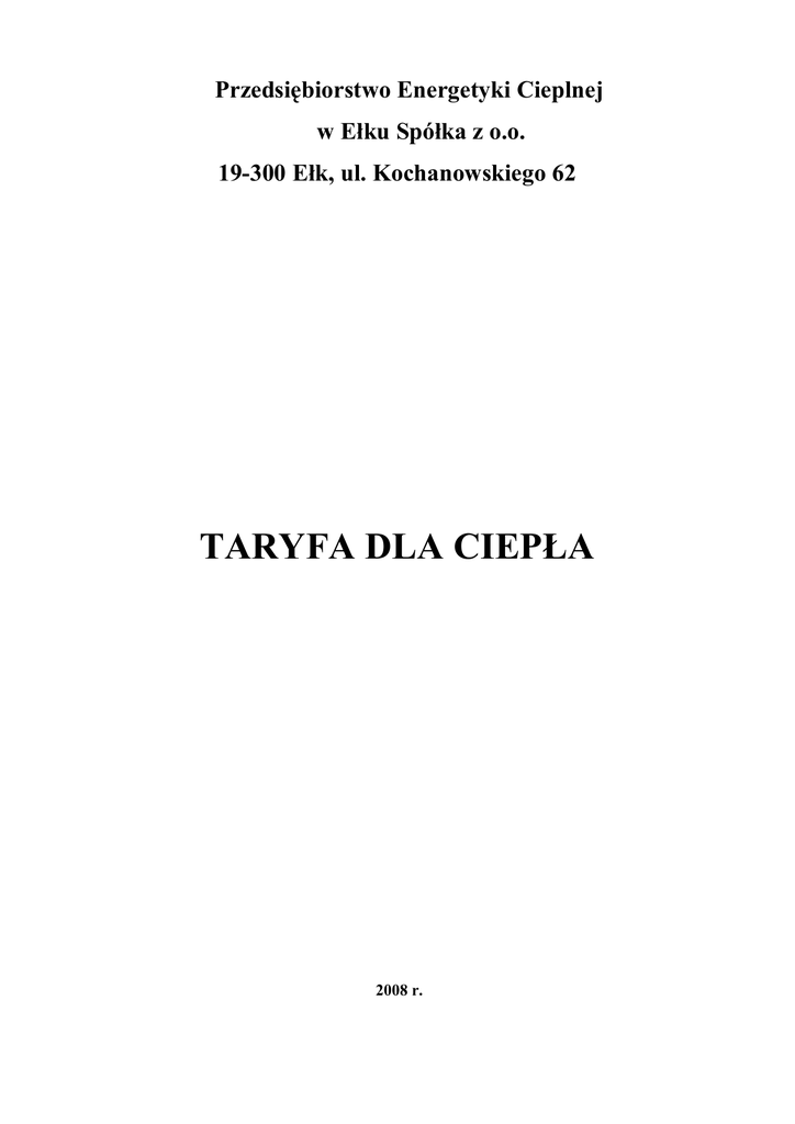 Przedsiębiorstwo Energetyki Cieplnej w Ełku Spółka z o.o. 19-300 Ełk, ul. Kochanowskiego 62 TARYFA DLA CIEPŁA 2008 r. SPIS TREŚCI strona CZĘŚĆ I Objaśnienia pojęć i skrótów uŜywanych w taryfie. 3 CZĘŚĆ II Zakres działalności gospodarczej związanej z zaopatrzeniem w ciepło. 4 CZĘŚĆ III Podział odbiorców na grupy. 4 CZĘŚĆ IV Rodzaje oraz wysokość cen i stawek opłat. 5 CZĘŚĆ V Warunki stosowania cen i stawek opłat. 6 CZĘŚĆ VI Zasady wprowadzania cen i stawek opłat. 6 2 CZĘŚĆ I Objaśnienia pojęć i skrótów uŜywanych w taryfie. A. UŜyte w taryfie pojęcia oznaczają: ♦ ustawa – ustawę z dnia 10 kwietnia 1997 r. - Prawo energetyczne (Dz. U. z 2006 r. Nr 89, poz. 625, z późn. zm.), ♦ rozporządzenie taryfowe – rozporządzenie Ministra Gospodarki z dnia 9 października 2006 r. w sprawie szczegółowych zasad kształtowania i kalkulacji taryf oraz rozliczeń z tytułu zaopatrzenia w ciepło (Dz. U. z 2006 r. Nr 193, poz. 1423), ♦ rozporządzenie przyłączeniowe – rozporządzenie Ministra Gospodarki i Pracy z dnia 15 stycznia 2007 r. w sprawie szczegółowych warunków funkcjonowania systemów ciepłowniczych (Dz. U. z 2007 r. Nr 16, poz. 92), ♦ przedsiębiorstwo ciepłownicze - przedsiębiorstwo energetyczne zajmujące się wytwarzaniem ciepła w eksploatowanych przez to przedsiębiorstwo źródłach ciepła, przesyłaniem i dystrybucją oraz sprzedaŜą ciepła wytworzonego w tych źródłach lub zakupionego od innego przedsiębiorstwa energetycznego, tj. Przedsiębiorstwo Energetyki Cieplnej w Ełku Spółka z o.o., ul. Kochanowskiego 62, 19-300 Ełk, zwane dalej „PEC Ełk”, ♦ odbiorca – kaŜdego, kto otrzymuje lub pobiera paliwa lub energię na podstawie umowy z przedsiębiorstwem energetycznym, ♦ źródło ciepła – połączone ze sobą urządzenia lub instalacje słuŜące do wytwarzania ciepła, ♦ sieć ciepłownicza – połączone ze sobą urządzenia lub instalacje, słuŜące do przesyłania i dystrybucji ciepła ze źródeł ciepła do węzłów cieplnych, ♦ węzeł cieplny – połączone ze sobą urządzenia lub instalacje słuŜące do zmiany rodzaju lub parametrów nośnika ciepła dostarczanego z przyłącza oraz regulacji ilości ciepła dostarczanego do instalacji odbiorczych, ♦ grupowy węzeł cieplny – węzeł cieplny obsługujący więcej niŜ jeden obiekt, ♦ przyłącze – odcinek sieci ciepłowniczej doprowadzający ciepło wyłącznie do jednego węzła cieplnego albo odcinek zewnętrznych instalacji odbiorczych za grupowym węzłem cieplnym lub źródłem ciepła, łączący te instalacje z instalacjami odbiorczymi w obiektach, ♦ instalacja odbiorcza – połączone ze sobą urządzenia lub instalacje, słuŜące do transportowania ciepła lub ciepłej wody z węzłów cieplnych lub źródeł ciepła do odbiorników ciepła lub punktów poboru ciepłej wody w obiekcie, ♦ zewnętrzna instalacja odbiorcza - odcinki instalacji odbiorczych łączące grupowy węzeł cieplny lub źródło ciepła z instalacjami odbiorczymi w obiektach, w tym w obiektach, w których zainstalowany jest grupowy węzeł cieplny lub źródło ciepła, ♦ obiekt – budowlę lub budynek wraz z instalacjami odbiorczymi, ♦ układ pomiarowo – rozliczeniowy – dopuszczony do stosowania, zgodnie z odrębnymi przepisami, zespół urządzeń, słuŜących do pomiaru ilości i parametrów nośnika ciepła, 3 ♦ ♦ ♦ ♦ których wskazania stanowią podstawę do obliczenia naleŜności z tytułu dostarczania ciepła, grupa taryfowa – grupę odbiorców korzystających z usług związanych z zaopatrzeniem w ciepło, z którymi rozliczenia są prowadzone na podstawie tych samych cen i stawek opłat oraz warunków ich stosowania, moc cieplna – ilość ciepła wytworzonego lub dostarczonego do podgrzania określonego nośnika ciepła albo ilość ciepła odebranego z tego nośnika w jednostce czasu, zamówiona moc cieplna - ustaloną przez odbiorcę lub podmiot ubiegający się o przyłączenie do sieci ciepłowniczej największą moc cieplną, jaka w danym obiekcie wystąpi w warunkach obliczeniowych, która zgodnie z określonymi w odrębnych przepisach warunkami technicznymi oraz wymaganiami technologicznymi dla tego obiektu jest niezbędna do zapewnienia: a) pokrycia strat ciepła w celu utrzymania normatywnej temperatury i wymiany powietrza w pomieszczeniach, b) utrzymania normatywnej temperatury ciepłej wody w punktach czerpalnych, c) prawidłowej pracy innych urządzeń lub instalacji, warunki obliczeniowe: a) obliczeniową temperaturę powietrza atmosferycznego określoną dla strefy klimatycznej, w której są zlokalizowane obiekty, do których jest dostarczane ciepło, b) normatywną temperaturę ciepłej wody. B. UŜyty w taryfie skrót oznacza: ♦ C III – źródło ciepła, zlokalizowane w Ełku przy ul. Ciepłej, w którym wytwarzane ciepło pochodzi ze spalania miału węgla kamiennego. CZĘŚĆ II Zakres działalności gospodarczej związanej z zaopatrzeniem w ciepło. PEC Ełk prowadzi działalność gospodarczą związaną z zaopatrzeniem odbiorców w ciepło na podstawie udzielonych koncesji w zakresie: - wytwarzania ciepła nr WCC/657/214/U/OT-7/98/BH z dnia 26 listopada 1998 r., zmienionej decyzjami: nr WCC/657A/214/W/3/AD z dnia 7 października 1999 r., nr WCC/657B/214/W/3/2001/RW z dnia 9 lutego 2001 r. i nr WCC/657-ZTO/ 214/W/OGD/2007/BP z dnia 28 sierpnia 2007 r., - przesyłania i dystrybucji ciepła nr PCC/690/214/U/OT-7/98/BH z dnia 26 listopada 1998 r., zmienionej decyzjami: nr PCC/690/S/214/U/3/99 z dnia 24 września 1999 r., nr PCC/690A/214/W/3/2001/RW z dnia 9 lutego 2001 r. i nr PCC/690-ZTO/ 214/W/OGD/2007/BP z dnia 28 sierpnia 2007 r. CZĘŚĆ III Podział odbiorców na grupy. GRUPA I-P1 – odbiorcy, którym ciepło, wytwarzane w źródle ciepła C III dostarczane jest do obiektów poprzez sieć ciepłowniczą i grupowe węzły cieplne, stanowiące własność 4 i eksp