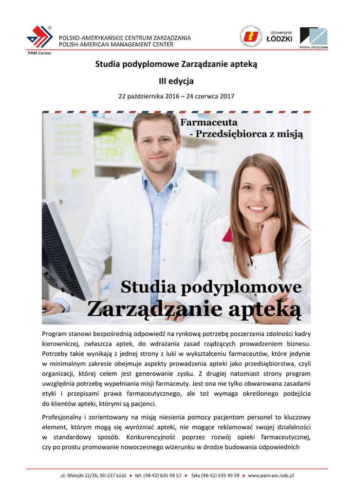 Studia podyplomowe Zarządzanie apteką III edycja 22 października 2016 – 24 czerwca 2017 Program stanowi bezpośrednią odpowiedź na rynkową potrzebę poszerzenia zdolności kadry kierowniczej, zwłaszcza aptek, do wdrażania zasad rządzących prowadzeniem biznesu. Potrzeby takie wynikają z jednej strony z luki w wykształceniu farmaceutów, które jedynie w minimalnym zakresie obejmuje aspekty prowadzenia apteki jako przedsiębiorstwa, czyli organizacji, której celem jest generowanie zysku. Z drugiej natomiast strony program uwzględnia potrzebę wypełniania misji farmaceuty. Jest ona nie tylko obwarowana zasadami etyki i przepisami prawa farmaceutycznego, ale też wymaga określonego podejścia do klientów apteki, którymi są pacjenci. Profesjonalny i zorientowany na misję niesienia pomocy pacjentom personel to kluczowy element, którym mogą się wyróżniać apteki, nie mogące reklamować swojej działalności w standardowy sposób. Konkurencyjność poprzez rozwój opieki farmaceutycznej, czy po prostu promowanie nowoczesnego wizerunku w drodze budowania odpowiednich relacji aptekarz-pacjent to jeden z kluczowych aspektów, których rozwój może mieć realny wpływ na zmianę zyskowności apteki. Zorientowane na pacjenta podejście staje się coraz powszechniej jednym z ważniejszych elementów strategii zarządzania w aptece. Takie nowoczesne, wieloaspektowe podejście do tematu zarządzania apteką pozwoli także na zmianę postaw uczestników. Program pokaże nowy aspekt pracy w aptece dla farmaceutów z dłuższym stażem pracy, u których duży opór wywołuje „sprzedażowe” i wynikowe podejście. Natomiast właściciele, zwłaszcza nie posiadająacy wykształcenia farmaceutycznego zyskają nowe - oprócz typowo ekonomicznego, spojrzenie na specyfikę biznesu, którym zarządzają. Oznacza to, że podejście wielostronne i wielopłaszczyznowe do zarządzania w branży farmaceutycznej stanie się biznesowym standardem. Program studiów uwzględnia aktualne potrzeby farmaceutycznego rynku pracy i pozwala na rozwój kluczowych w aspekcie zarządzania apteką kompetencji. Nasi absolwenci uzyskają opartą na sprawdzonych wzorcach międzynarodowych kompleksową wiedzę na temat najważniejszych aspektów prowadzenia apteki, których zrozumienie stanowi gruntowne przygotowanie do skutecznego zarządzania apteką w aktualnych realiach rynku farmaceutycznego w Polsce. Interdyscyplinarny charakter studiów zakłada rozwinięcie tematyki z różnych dziedzin mających odzwierciedlenie w codziennej praktyce menedżera/ kierownika apteki. Kształcenie w toku naszych studiów opiera się na kompleksowym zapoznaniu uczestników z problematyką zarządzania apteką i wsparciu rozwoju kwalifikacji zawodowych menedżerów w branży farmaceutycznej. W naszym programie szczególny nacisk kładziemy na osiąganie wysokich rezultatów w sprzedaży w aptekach otwartych oraz zastosowanie skutecznych technik marketingowych w zwiększaniu obrotów apteki. Studia są przeznaczone dla kadry menedżerskiej sektora farmaceutycznego, w tym farmaceutów, właścicieli i pracowników aptek, pracowników firm farmaceutycznych - dywizji sprzedażowych, Przedstawicieli medycznych/ farmaceutycznych/ handlowych, Sales/ Product Menedżerów, Area Sales Menedżerów, Field Force Menedżerów oraz osób aspirujących do pracy w sektorze farmaceutycznym. 2 Program Roczny program przewiduje 180 godzin zajęć w ramach pięciu bloków tematycznych, obejmujących strategiczne i marketingowe zarządzanie apteką, aspekty prawne, kwestie związane z rachunkowością i narzędziami informatycznymi oraz zarządzanie personelem i relacje z otoczeniem. W programie wykorzystywane są nowoczesne rozwiązania informatyczne, w tym gra symulacyjna i platforma e-learningowa. 1. Zarządzanie personelem w aptece Komunikacja - podstawowe narzędzie w pracy kierownika Skuteczne przywództwo Nie ma szefa bez zespołu Delegowanie zadań i uprawnień Wywieranie wpływu na ludzi - motywowanie 40 godz. 2. Strategiczne i marketingowe zarządzanie apteką Marketing w aptece – 16 godz. Zarządzanie apteką w praktyce – 24 godz. 40 godz. 3. Rachunkowość i narzędzia informatyczne w zarządzaniu Rachunkowość zarządcza w prowadzeniu apteki – 20 godz. Ekonomiczna gra symulacyjna (wprowadzenie i podsumowanie) - 4 godz. Systemy informatyczne w aptekach – 8 godz. 32 godz. (+12 godz. gry on-line) 4. Relacje z otoczeniem Rola farmaceuty w relacji lekarz-farmaceuta-pacjent – 8 godz. Techniki pracy z pacjentem i psychologia pacjenta - 8 godz. Merchandising apteczny – 8 godz. Jak skutecznie negocjować z firmami farmaceutycznymi – 16 godz. 40 godz. 5. Aspekty prawne zarządzania apteką Ustawodawstwo farmaceutyczne i około farmaceutyczne – 20 godz. Prawo pracy – 8 godz. 28 godz. 6. Warsztat Studium przypadku (praca dyplomowa) Razem: 180 godz. (plus 12 godz. gry on-line) 3 Studia oferują:     gruntowne wprowadzenie w teorię i praktykę skutecznego zarządzania apteką w postaci zajęć umożliwiających integrację wiedzy z różnych dziedzin, w celu dogłębnego przeanalizowania problemów napotykanych w środowisku aptecznym i identyfikacji skutecznych rozwiązań tych problemów, poznanie możliwości wprowadzania tej wiedzy do codziennej praktyki zawodowej, naukę właściwego i efektywnego zarządzania personelem oraz maksymalizowania wykorzystania personelu dodatkowego, rozwój kompetencji w zakresie zarządzania sobą i ludźmi. Główne zalety naszych studiów wynikają z oferowanych przez nie możliwości rozwoju osobistego równolegle ze zdobywaną wiedzą teoretyczną. Oprócz centralnego założenia programu, jakim jest nauka zarządzania apteką, oferujemy szereg zajęć aktywizujących, budujących umiejętności efektywnego komunikowania się z zespołem czy nawiązywania kontaktów oraz pogłębiających świadomość własnych wzorców zachowań i rozwijających zachowania pożądane w skutecznym
