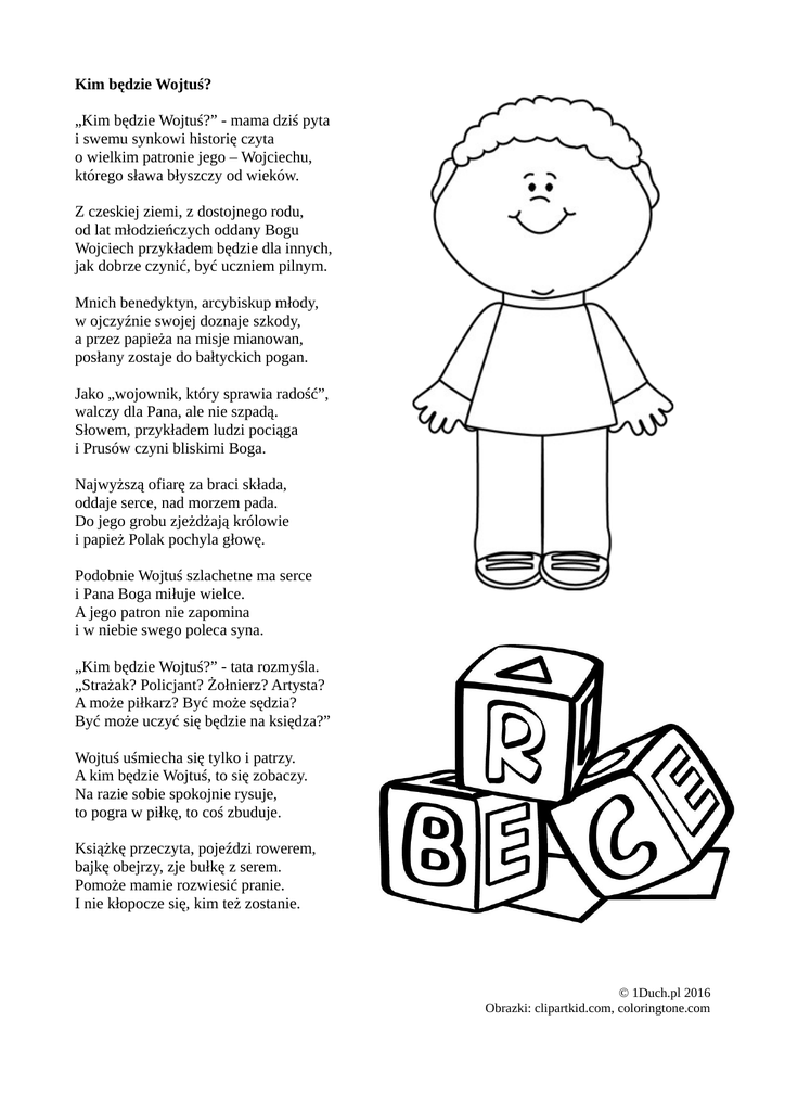 Kim będzie Wojtuś? „Kim będzie Wojtuś?” - mama dziś pyta i swemu synkowi historię czyta o wielkim patronie jego – Wojciechu, którego sława błyszczy od wieków. Z czeskiej ziemi, z dostojnego rodu, od lat młodzieńczych oddany Bogu Wojciech przykładem będzie dla innych, jak dobrze czynić, być uczniem pilnym. Mnich benedyktyn, arcybiskup młody, w ojczyźnie swojej doznaje szkody, a przez papieża na misje mianowan, posłany zostaje do bałtyckich pogan. Jako „wojownik, który sprawia radość”, walczy dla Pana, ale nie szpadą. Słowem, przykładem ludzi pociąga i Prusów czyni bliskimi Boga. Najwyższą ofiarę za braci składa, oddaje serce, nad morzem pada. Do jego grobu zjeżdżają królowie i papież Polak pochyla głowę. Podobnie Wojtuś szlachetne ma serce i Pana Boga miłuje wielce. A jego patron nie zapomina i w niebie swego poleca syna. „Kim będzie Wojtuś?” - tata rozmyśla. „Strażak? Policjant? Żołnierz? Artysta? A może piłkarz? Być może sędzia? Być może uczyć się będzie na księdza?” Wojtuś uśmiecha się tylko i patrzy. A kim będzie Wojtuś, to się zobaczy. Na razie sobie spokojnie rysuje, to pogra w piłkę, to coś zbuduje. Książkę przeczyta, pojeździ rowerem, bajkę obejrzy, zje bułkę z serem. Pomoże mamie rozwiesić pranie. I nie kłopocze się, kim też zostanie. © 1Duch.pl 2016 Obrazki: clipartkid.com, coloringtone.com