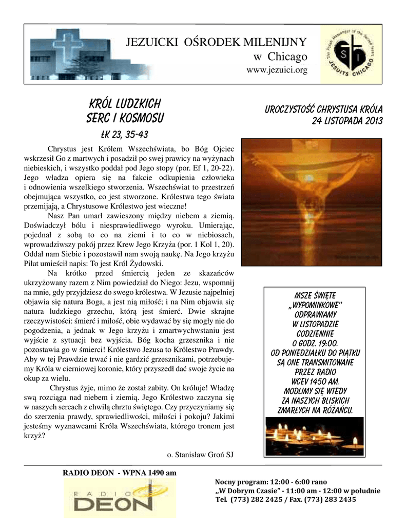 JEZUICKI OŚRODEK MILENIJNY w Chicago www.jezuici.org król ludzkich serc i kosmosu uroczystość chrystusa króla 24 listopada 2013 Łk 23, 35-43 Chrystus jest Królem Wszechświata, bo Bóg Ojciec wskrzesił Go z martwych i posadził po swej prawicy na wyżynach niebieskich, i wszystko poddał pod Jego stopy (por. Ef 1, 20-22). Jego władza opiera się na fakcie odkupienia człowieka i odnowienia wszelkiego stworzenia. Wszechświat to przestrzeń obejmująca wszystko, co jest stworzone. Królestwa tego świata przemijają, a Chrystusowe Królestwo jest wieczne! Nasz Pan umarł zawieszony między niebem a ziemią. Doświadczył bólu i niesprawiedliwego wyroku. Umierając, pojednał z sobą to co na ziemi i to co w niebiosach, wprowadziwszy pokój przez Krew Jego Krzyża (por. 1 Kol 1, 20). Oddał nam Siebie i pozostawił nam swoją naukę. Na Jego krzyżu Piłat umieścił napis: To jest Król Żydowski. Na krótko przed śmiercią jeden ze skazańców ukrzyżowany razem z Nim powiedział do Niego: Jezu, wspomnij na mnie, gdy przyjdziesz do swego królestwa. W Jezusie najpełniej objawia się natura Boga, a jest nią miłość; i na Nim objawia się natura ludzkiego grzechu, którą jest śmierć. Dwie skrajne rzeczywistości: śmierć i miłość, obie wydawać by się mogły nie do pogodzenia, a jednak w Jego krzyżu i zmartwychwstaniu jest wyjście z sytuacji bez wyjścia. Bóg kocha grzesznika i nie pozostawia go w śmierci! Królestwo Jezusa to Królestwo Prawdy. Aby w tej Prawdzie trwać i nie gardzić grzesznikami, potrzebujemy Króla w cierniowej koronie, który przyszedł dać swoje życie na okup za wielu. Chrystus żyje, mimo że został zabity. On króluje! Władzę swą rozciąga nad niebem i ziemią. Jego Królestwo zaczyna się w naszych sercach z chwilą chrztu świętego. Czy przyczyniamy się do szerzenia prawdy, sprawiedliwości, miłości i pokoju? Jakimi jesteśmy wyznawcami Króla Wszechświata, którego tronem jest krzyż? Msze Święte „wypominkowe” odprawiamy w listopadzie codziennie o godz. 19:00. Od poniedziałku do piątku są one transmitowane przez radio WCEV 1450 AM. Modlimy się wtedy za naszych bliskich zmarłych na różańcu. o. Stanisław Groń SJ RADIO DEON - WPNA 1490 am Nocny program: 12:00 - 6:00 rano ,,W Dobrym Czasie” - 11:00 am - 12:00 w południe Tel. (773) 282 2425 / Fax. (773) 283 2435 PORZĄDEK MSZY ŚWIĘTYCH Poniedziałek - pi¹tek: 8:00, 18:00, 19:00 (radiowa: WCEV 1450) I piątek miesiąca: 8:00, 19:00, 20:30 Środa: 19:00 - nowenna do Matki Bożej Nieustającej Pomocy Sobota: 8:00, tylko w I sobotę miesiąca o 17:00 dla chorych, 19:00 Niedziela: 8:00 (radiowa), 9:30, 11:00, 13:00, 19:00, 20:30 INTENCJE MSZY ŚWIĘTYCH Niedziela, 24 XI 2013 8:00 + Michał Matkowski 9:30 Zbiorowa 11:00 + Jan Polek w 12. rocznicę śmierci 13:00 + Ewa Kuszewska 19:00 Wypominkowa 20:30 + Józef i Helena Króliccy -=- SpowiedŸ św.: od poniedziałku do soboty - 7:30 i 18:30, w niedzielę - pó³ godziny przed ka¿d¹ Msz¹ Œwiêt¹, w1. pi¹tek miesi¹ca - od 18:30 do 21:00 Adoracja Najświętszego Sakramentu - od poniedziałku do czwartku - od 18:30 do 19:00 sobota - od 18:00 do 19:00 Sanktuarium Najświętszego Serca Pana Jezusa Jezuicki Ośrodek Milenijny 5835 W. Irving Park Rd.; Chicago, IL 60634, Tel. 773 777 7000; fax 773 427 0126 www.jezuici.org e-mail: [email protected] Audycje Radia DEON: tel. 773 282 2425 Fax. 773 283 2435 Biuro czynne: od poniedziałku do piątku: 8:30 - 9:00, 15:30 - 20:30 sobota: 9:30 - 20:30, niedziela: 8:30 - 14:30, 18:30 - 21:30 Biblioteka czynna: sobota: 18:00 - 19:00; niedziela: 10:30 - 14:30; 19:00 - 21:00 Kawiarenka czynna: niedz.: 10:00 - 15:00, 19:00 - 22:00 Sacred Heart Mission House 4105 N. Avers Ave., Chicago, IL 60618 Tel. 773 588 74 76; fax 773 588 65 17 Rektor Sanktuarium i Przełożony Jezuitów o. Jerzy Sermak, SJ (773-588-7476 - ext. 224) o. Józef Birecki, SJ (773-777-7000 - ext. 121) o. Jerzy Mordarski, SJ (773-588-7476 - ext. 234) o. Jerzy Karpiński, SJ (773-588-7476 - ext. 237) o. Piotr Kochanowicz, SJ (773-588-7476 - ext. 227) br. Adam Poręba, SJ (773-777-7000 - ext. 122) Wszelkie ofiary i donacje prosimy kierowaæ na adres Sanktuarium. Donacje s¹ wolne od podatku i mo¿na je odpisywaæ przy rozliczeniu z IRS. TRANSMISJE RADIOWE I INTERNETOWE od poniedziałku do piątku,transmisja Mszy Św. z godz. 19:00 Radio WCEV 1450 (www.wcev1450.com) w niedziele: godz 8-9, Radio WCEV 1450, oraz Polskie Radio Chicago 1030 WNVR (www.polskieradio.com) Codziennie przez całą dobę: Kamera internetowa z Sanktuarium (obraz i dźwięk; używać Internet Explorer): www.jezuici.org - link „Transmisje na żywo” – wpisać jako użytkownik i hasło: 5835 Poniedziałek, 25 XI 8:00 + + Stefania, Jan i Władysław Semczyszyn 18:00 Zbiorowa 19:00 Wypominkowa Wtorek, 26 XI - św. Jana Berchmansa, patrona ministrantów 8:00 + Stanisław Handzel 18:00 Zbiorowa 19:00 Wypominkowa Środa, 27 XI 8:00 Za Dobroczyńców Jezuickiego Ośrodka Milenijnego 18:00 Zbiorowa 19:00 Wypominkowa Czwartek, 28 XI 8:00 Zbiorowa 11:00 Dziękczynna za otrzymane łaski w minionym roku 19:00 Wypominkowa Piątek, 29 XI 8:00 + Kazimierz Przybylski w rocznicę śmierci 18:00 Zbiorowa 19:00 Wypominki Sobota, 30 XI - św. Andrzeja Apostoła 8:00 Zbiorowa 19:00 Wypominki Bezpłatny kurs biurowo-komputerowy Początek w styczniu w godzinach wieczornych Wymagane jest pozwolenie na pracę,”zielona karta” lub obywatelstwo, zamieszkanie w Chicago. Konieczna jest dobra znajomość angielskiego. Pomoc przy znalezieniu pracy. Więcej informacji tel. 773 481 5401 www.polish.org Różaniec Rodzinny - przez tydzień w każdej rodzinie Zgłoszenia przyjmują: Teresa tel. 773 308 4998 lub Małgorzata tel. 773 38733 32 Fundacja Sponsor fundacji: „Strong Peruki lekkie, Family włosy na grzebieniach Silna Rodzina” tel. 847 966 5200 www.strongfamily.co 7900 N. Milwaukee, Niles Słuchaj! RadioDeon.com - WPNA 1490 AM - pon.-pt. 12:00 - 6:00 i 11:00 - 12:00 