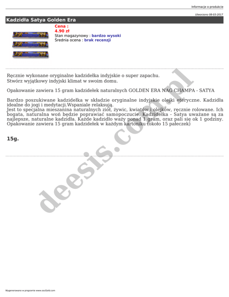 Informacje o produkcie Utworzono 08-03-2017 Kadzidła Satya Golden Era Cena : 4.90 zł Stan magazynowy : bardzo wysoki Średnia ocena : brak recenzji m .p l Ręcznie wykonane oryginalne kadzidełka indyjskie o super zapachu. Stwórz wyjątkowy indyjski klimat w swoim domu. Opakowanie zawiera 15 gram kadzidełek naturalnych GOLDEN ERA NAG CHAMPA - SATYA .c o Bardzo poszukiwane kadzidełka w składzie oryginalne indyjskie olejki eteryczne. Kadzidła idealne do jogi i medytacji.Wspaniale relaksują. Jest to specjalna mieszanina naturalnych ziół, żywic, kwiatów i olejków, ręcznie rolowane. Ich bogata, naturalna woń będzie poprawiać samopoczucie. Kadzidełka - Satya uważane są za najlepsze, naturalne kadzidła. Każde kadzidło waży ponad 1 gram, oraz pali się ok 1 godziny. Opakowanie zawiera 15 gram kadzidełek w każdym kartoniku (około 15 pałeczek) de es is 15g. Wygenerowano w programie www.oscGold.com