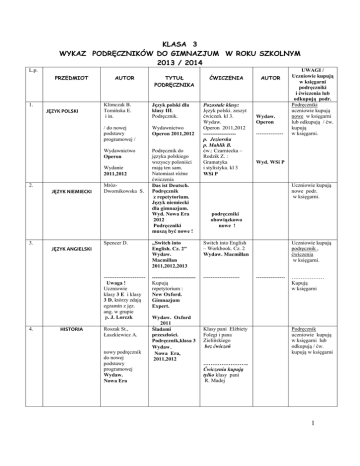 KLASA 3 WYKAZ PODRĘCZNIKÓW DO GIMNAZJUM W ROKU SZKOLNYM 2013 / 2014 L.p. PRZEDMIOT 1. JĘZYK POLSKI AUTOR Klimczak B. Tomińska E. i in. Język polski dla klasy III. Podręcznik. / do nowej podstawy programowej / Wydawnictwo Operon 2011,2012 Wydawnictwo Operon Podręcznik do języka polskiego wszyscy poloniści mają ten sam. Natomiast różne ćwiczenia Das ist Deutsch. Podręcznik z repetytorium. Język niemiecki dla gimnazjum. Wyd. Nowa Era 2012 Podręczniki muszą być nowe ! Wydanie 2011,2012 2. JĘZYK NIEMIECKI 3. MrózDwornikowska S. HISTORIA ĆWICZENIA Pozostałe klasy: Język polski. zeszyt ćwiczeń. kl 3. Wydaw. Operon 2011,2012 -----------------p. Jeziorska p. Mahlik B. ćw.: Czarniecka – Rodzik Z. : Gramatyka i stylistyka. kl 3 WSi P Switch into English – Workbook. Cz. 2 Wydaw. Macmillan ----------------------Uwaga ! Uczniowie klasy 3 E i klasy 3 D, którzy zdają egzamin z jęz. ang. w grupie p. J. Lorczk -----------------------Kupują repetytorium : New Oxford. Gimnazjum Expert. -------------------- Roszak St., Łaszkiewicz A. nowy podręcznik do nowej podstawy programowej Wydaw. Nowa Era Wydaw. Operon --------------- Wyd. WSi P podręczniki obowiązkowo nowe ! „Switch into English. Cz. 2” Wydaw. Macmillan 2011,2012,2013 Wydaw. Oxford 2011 Śladami przeszłości. Podręcznik,klasa 3 Wydaw. Nowa Era, 2011,2012 AUTOR Uczniowie kupują nowe podr. w księgarni. Spencer D. JĘZYK ANGIELSKI 4. TYTUŁ PODRĘCZNIKA UWAGI / Uczniowie kupują w księgarni podręczniki i ćwiczenia lub odkupują podr. Podręczniki uczniowie kupują nowe w księgarni lub odkupują / ćw. kupują w księgarni. Klasy pani Elżbiety Folegi i pana Zielińskiego bez ćwiczeń Uczniowie kupują podręcznik , ćwiczenia w księgarni. ---------------- ……………… Kupują w księgarni Podręcznik uczniowie kupują w księgarni lub odkupują / ćw. kupują w księgarni ……………………. Ćwiczenia kupują tylko klasy pani R. Madej 1 5. EDUKACJA DLA BEZPIECZEŃSTWA 6. BIOLOGIA 7. GEOGRAFIA Słoma J., Zając G. wydaw. Nowa Era 2011,2012 Sągin B., Boczarowski A., Sęktas M. Wyd. 2011,2012 Szubert M. Wyd. 2011,2012 Nowa Era 8. FIZYKA Ziemicki S., Puchowska K. Wyd. 2009,2010, 2011 - podręcznik 9. CHEMIA WSiP Kulawik J., Kulawik T. i in. wydanie – 2011, 2012 10. MATEMATYKA Nowa Era Dobrowolska M. Wydanie 2011, 2012 11. 12. 13. 14. ZAJĘCIA ARTYSTYCZNE ( zamiast muzyki ) ZAJĘCIA ARTYSTYCZNE ( p. Pieczka ) TECHNIKA RELIGIA Wachowiak E. Wydaw. GAWA Rybarska M. Wydawnictwo Operon Praca zbiorowa. W drodze do Emaus. Wydaw. WAM Kraków . Edukacja dla bezpieczeństwa. Żyję i działam bezpiecznie. Podręcznik z ćw. dla klas 1- 3 Wydaw. Nowa Era gimnazjum. Puls życia . Cz. 3 Wydaw. Nowa Era. Do nowej podstawy programowej ! Planeta Nowa 3. Podręcznik do geografii. (od września do czerwca – dokończenie z kl II) Wydaw. Nowa Era. / dopisek – do nowej podstawy programowej/ Bliżej fizyki. Cz. 2 + cz. 3. (kontynuacja cz. 2 + cz. 3 ) Wydaw. WSiP ucz. kupują w księgarni nie kupują ćwiczeń ! Uczniowie kupują podręcznik Planeta Nowa 3 . Zeszyt ćwiczeń. ( od września do czerwca – dokończenie / dopisek – zgodny z nową podstawą programową/ Wydaw. Nowa Era Ćwiklińska E. i in. Wyd. Ćwiczenia Bliżej fizyki. Cz. 2 + cz. 3 / kontynuacja cz. 2 + cz. 3 / Wydaw. WSiP Cz. 2 ćw. – wydanie 2009 Cz. 3 ćw. – wydanie2011 mają z klasy II 2011, 2012 Nowa Era Podręcznik Odkupują lub kupują w księg., ćwicz. uczniowie kupują w księg. Chemia Nowej Ery. Cz. 3. (kontynuacja cz. 2. + cz. 3. ) klasy p. Przytarskiego: ćw. cz. 3 do 3 części podręcznika klasy p. Kłosowskiej: bez ćwiczeń Ucz. podręczniki kupują lub odkupują w księg., ćw. kupują w księgarni. Matematyka 3. Podręcznik dla gimnazjum. Gdańskie Wydawnictwo Oświatowe Muzyka. Podręcznik do zajęć artystycznych w gimnazjum. Podręcznik z ćw. Podręcznik do nowej podstawy programowej Wydanie 2011, 2012 Podręczniki w księgarni lub odkupują Zajęcia kulinarne. Zeszyt tematyczny z ćwiczeniami dla ucznia. Jezus prowadzi i zbawia. W drodze do Emaus. Wydanie od roku 2005 kolor okładki niebieski Klasy 3A i 3B zamiast muzyki Klasy 3C,3D, 3E bez podręcznika zamiast plastyki Kupują w księgarni Uczniowie kupują w księgarni Uczniowie kupują w księgarni lub odkupują Biblioteka szkolna 2 3