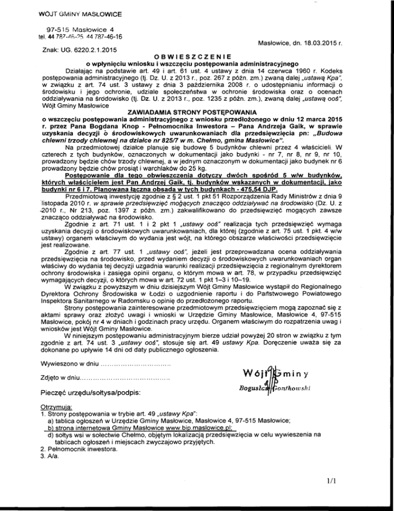 WÓJT GMINY MASŁOWICE 9 7 -5 1 5 M a s ło w ic e 4 tel, 44 44 7 8 7 -4 6 -1 6 Masłowice, dn. 18.03.2015 r. Znak: UG. 6220.2.1.2015 OBWIESZCZENIE o wpłynięciu wniosku i wszczęciu postępowania administracyjnego Działając na podstawie art. 49 postępowania administracyjnego (tj. Dz. w związku z art. 74 ust. 3 ustawy z środowisku i jego ochronie, udziale oddziaływania na śrtidow isko (tj. Dz. U. W ójt Gminy Masłowice i art. 61 ust. 4 ustawy z dnia 14 czerwca 1960 r. Kodeks U. z 2013 r., poz. 267 z późn. zm.) zwaną dalej „ustawą Kpa’’, dnia 3 października 2008 r. o udostępnianiu informacji o społeczeństwa w ochronie środowiska oraz o ocenach z 2013 r., poz. 1235 z późn. zm.), zwaną dalej „ustawą ooś”, ZAWIADAMIA STRONY POSTĘPOWANIA o wszczęciu postępowania administracyjnego z wniosku przedłożonego w dniu 12 marca 2015 r. przez Pana Bogdana Knop - Pełnomocnika Inwestora - Pana Andrzeja Gaik, w sprawie uzyskania decyzji ó środowiskowych uwarunkowaniach dla przedsięwzięcia pn: „Budowa chlewni trzody chlewnej na działce nr 825/7 w m. Chełmo, gmina Masłowice”. Na przedmiotowej działce planuje się budowę 5 budynków chlewni przez 4 właścicieli. W czterech z tych budynków, oznaczonych w dokumentacji jako budynki - nr 7, nr 8, nr 9, nr 10, prowadzony będzie chów trzody chlewnej, a w jednym oznaczonym w dokumentacji jako budynek nr 6 prowadzony będzie chów prosiąt i warchlaków do 25 kg. Postępowanie dla tego obwieszczenia dotyczy dwóch spośród 5 w/w budynków, których właścicielem jest Pan Andrzej Gaik, ti. budynków wskazanych w dokumentacji, jako budynki nr 6 i 7. Planowana łączna obsada w tych budynkach - 475.54 DJP. Przedmiotową inwestycję zgodnie z § 2 ust. 1 pkt 51 Rozporządzenia Rady Ministrów z dnia 9 listopada 2010 r. w sprawie przedsięwzięć mogących znacząco oddziaływać na środowisko (Dz. U. z -2010 r., Nr 213, poz. 1397 z późn. zm.) zakwalifikowano do przedsięwzięć mogących zawsze znacząco oddziaływać na środowisko. Zgodnie z art. 71 ust. 1 i 2 pkt 1 „ustawy ooś” realizacja tych przedsięwzięć wymaga uzyskania decyzji o środowiskowych uwarunkowaniach, dla której (zgodnie z art. 75 ust. 1 pkt. 4 w/w ustawy) organem właściwym do wydania jest wójt, na którego obszarze właściwości przedsięwzięcie jest realizowane. Zgodnie z art. 77 ust. 1 „ustaw y ooś", jeżeli jest przeprowadzana ocena oddziaływania przedsięwzięcia na środowisko, przed wydaniem decyzji o środowiskowych uwarunkowaniach organ właściwy do wydania tej decyzji uzgadnia warunki realizacji przedsięwzięcia z regionalnym dyrektorem ochrony środowiska i zasięga opinii organu, o którym mowa w art. 78, w przypadku przedsięwzięć wymagających decyzji, o których mowa w art. 72 ust. 1 pkt 1 -3 i 10-19. W związku z powyższym w dniu dzisiejszym W ójt Gminy Masłowice wystąpił do Regionalnego Dyrektora Ochrony Środowiska w Łodzi o uzgodnienie raportu i do Państwowego Powiatowego Inspektora Sanitarnego w Radomsku o opinię do przedłożonego raportu. Strony postępowania zainteresowane przedmiotowym przedsięwzięciem mogą zapoznać się z aktami sprawy oraz złożyć uwagi i wnioski w Urzędzie Gminy Masłowice, Masłowice 4, 97-515 Masłowice, pokój nr 4 w dniach i godzinach pracy urzędu. Organem właściwym do rozpatrzenia uwag i wniosków jest W ójt Gminy Masłowice. W niniejszym postępowaniu administracyjnym bierze udział powyżej 20 stron w związku z tym zgodnie z art. 74 ust. 3 „ustaw y ooś”, stosuje się art. 49 ustawy Kpa. Doręczenie uważa się za dokonane po upływie 14 dni od daty publicznego ogłoszenia. W ywieszono w d n iu ......................................... Zdjęto w dniu..................................................... P ie c z ę ć u rz ę d u /s o łty s a /p o d p is : W ó jM ^ jfe m in y B o g u s lc a rlp o n /k o iu s h i Otrzymują: 1. Strony postępowania w trybie art. 49 „ustawy Kpa”: a) tablica ogłoszeń w Urzędzie Gminy Masłowice, Masłowice 4, 97-515 Masłowice; bl strona internetowa Gminy Masłowice www.bip.maslowice.pl: d) sołtys wsi w sołectwie Chełmo, objętym lokalizacją przedsięwzięcia w celu wywieszenia na tablicach ogłoszeń i miejscach zwyczajowo przyjętych. 2. Pełnomocnik inwestora. 3. A/a. 1/1 W 0J7 GMINY MASŁOWICE 9 7 -S 15 M a s ło w ic e 4 cel, 44 44 7 8 7 -4 6 -1 6 Masłowice, dn. 18.03.2015 r. Znak: UG. 6220.3.1.2015 OBWIESZCZENIE o wpłynięciu wniosku i wszczęciu postępowania administracyjnego Działając na podstawie art. 49 postępowania administracyjnego (tj. Dz. w związku z art. 74 ust. 3 ustawy z środowisku i jego ochronie, udziale oddziaływania na środowisko (tj. Dz. U. W ójt Gminy Masłowice i art. 61 ust. 4 ustawy z dnia 14 czerwca 1960 r. Kodeks U. z 2013 r., poz. 267 z późn. zm.) zwaną dalej „ustawą Kpa", dnia 3 października 2008 r. o udostępnianiu informacji o społeczeństwa w ochronie środowiska oraz o ocenach z 2013 r., poz. 1235 z późn. zm.), zwaną dalej „ustawą o oś”, ZAWIADAMIA STRONY POSTĘPOWANIA o wszczęciu postępowania administracyjnego z wniosku przedłożonego w dniu 12 marca 2015 r. przez Pana Bogdana Knop - Pełnomocnika Inwestora - Pana Bartosza Gaik, w sprawie uzyskania decyzji'o środowiskowych uwarunkowaniach dla przedsięwzięcia pn: „Budowa chlewni trzody chlewnej na działce nr 825/7 w m. Chełmo, gmina Masłowice”. Na przedmiotowej działce planuje się budowę 5 budynków chlewni przez 4 właścicieli. W czterech z tych budynków, oznaczonych w dokumentacji, jako budynki - nr 7, nr 8, nr 9, nr 10, prowadzony będzie chów trzody chlewnej, a w jednym oznaczonym jako budynek nr 6 prowadzony będzie chów prosiąt i warchlaków do 25 kg. Postępowanie dla tego obwieszczenia dotyczy jednego spośród 5 w/w budynków, którego właścicielem jest Pan Bartosz Gaik, ti. budynku wskazanego w dokumentacji jako budynek nr 10. Planowana obsada w tvm budynku - 26