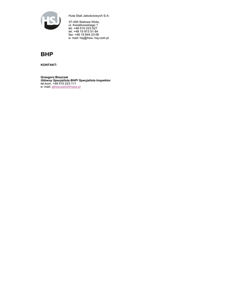 Huta Stali Jakościowych S.A. 37-450 Stalowa Wola, ul. Kwiatkowskiego 1 tel. +48 510 223 527 tel. +48 15 813 51 84 fax: +48 15 844 23 06 e- mail: hsj@hsw- hsj.com.pl BHP KONTAKT: Grzegorz Biszczat Główny Specjalista BHP/ Specjalista Inspektor tel.kom. +48 510 223 111 e- mail: gbiszczat(at)hsjsa.pl