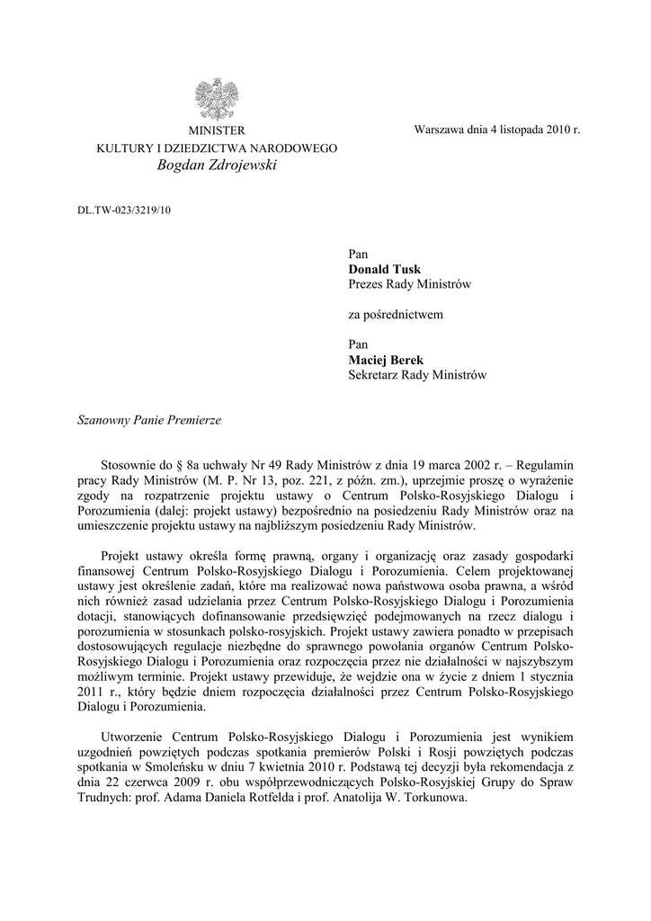 MINISTER KULTURY I DZIEDZICTWA NARODOWEGO Warszawa dnia 4 listopada 2010 r. Bogdan Zdrojewski DL.TW-023/3219/10 Pan Donald Tusk Prezes Rady Ministrów za pośrednictwem Pan Maciej Berek Sekretarz Rady Ministrów Szanowny Panie Premierze Stosownie do § 8a uchwały Nr 49 Rady Ministrów z dnia 19 marca 2002 r. – Regulamin pracy Rady Ministrów (M. P. Nr 13, poz. 221, z późn. zm.), uprzejmie proszę o wyraŜenie zgody na rozpatrzenie projektu ustawy o Centrum Polsko-Rosyjskiego Dialogu i Porozumienia (dalej: projekt ustawy) bezpośrednio na posiedzeniu Rady Ministrów oraz na umieszczenie projektu ustawy na najbliŜszym posiedzeniu Rady Ministrów. Projekt ustawy określa formę prawną, organy i organizację oraz zasady gospodarki finansowej Centrum Polsko-Rosyjskiego Dialogu i Porozumienia. Celem projektowanej ustawy jest określenie zadań, które ma realizować nowa państwowa osoba prawna, a wśród nich równieŜ zasad udzielania przez Centrum Polsko-Rosyjskiego Dialogu i Porozumienia dotacji, stanowiących dofinansowanie przedsięwzięć podejmowanych na rzecz dialogu i porozumienia w stosunkach polsko-rosyjskich. Projekt ustawy zawiera ponadto w przepisach dostosowujących regulacje niezbędne do sprawnego powołania organów Centrum PolskoRosyjskiego Dialogu i Porozumienia oraz rozpoczęcia przez nie działalności w najszybszym moŜliwym terminie. Projekt ustawy przewiduje, Ŝe wejdzie ona w Ŝycie z dniem 1 stycznia 2011 r., który będzie dniem rozpoczęcia działalności przez Centrum Polsko-Rosyjskiego Dialogu i Porozumienia. Utworzenie Centrum Polsko-Rosyjskiego Dialogu i Porozumienia jest wynikiem uzgodnień powziętych podczas spotkania premierów Polski i Rosji powziętych podczas spotkania w Smoleńsku w dniu 7 kwietnia 2010 r. Podstawą tej decyzji była rekomendacja z dnia 22 czerwca 2009 r. obu współprzewodniczących Polsko-Rosyjskiej Grupy do Spraw Trudnych: prof. Adama Daniela Rotfelda i prof. Anatolija W. Torkunowa. Zgodnie z polsko-rosyjskimi ustaleniami w obu krajach zostaną utworzone centra dialogu, działające pod auspicjami ministrów kultury, których celem będzie wspieranie i inspirowanie badań naukowych oraz organizowanie dialogu między Polską a Rosją w zakresie historii, kultury i dziedzictwa obu narodów. W toku realizacji podjętych ustaleń Minister Kultury i Dziedzictwa Narodowego powołał swojego pełnomocnika, do którego zadań naleŜy w szczególności opracowanie projektu ustawy o Centrum Polsko-Rosyjskiego Pojednania i Porozumienia. Prezes Rady Ministrów wyraził zgodę na odstąpienie od wymogu opracowania i uzgodnienia załoŜeń do projektu ustawy. Opracowanie projektu ustawy jest ujęte w Programie prac legislacyjnych Rady Ministrów w okresie lipiec – grudzień 2010 r. (projekty ustaw). Projekt ustawy był przedmiotem uzgodnień w Ministerstwie Kultury i Dziedzictwa Narodowego, a zgłoszone uwagi zostały w większości uwzględnione. Zgodnie z ustaleniami wszystkich zaangaŜowanych stron, Centrum Polsko-Rosyjskiego Dialogu i Porozumienia powinno być gotowe do podjęcia działalności juŜ z dniem 1 stycznia 2011 r. Akceptacja wyraŜonego na wstępie wniosku pozwoli na przyspieszenie chwili przyjęcia projektu ustawy przez Radę Ministrów, a następnie skierowanie go do Sejmu w terminie pozwalającym na wejście ustawy w Ŝycie w moŜliwie najszybszym terminie. Minister Kultury i Dziedzictwa Narodowego Bogdan Zdrojewski Załączniki: 1) 45 egzemplarzy projektu ustawy wraz z uzasadnieniem 2) 45 egzemplarzy wstępnych projektów aktów wykonawczych