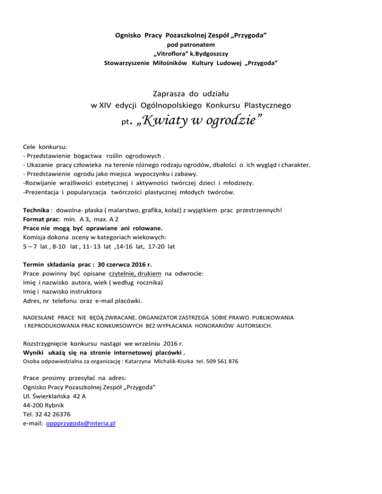 Ognisko Pracy Pozaszkolnej Zespół „Przygoda” pod patronatem „Vitroflora” k.Bydgoszczy Stowarzyszenie Miłośników Kultury Ludowej „Przygoda” Zaprasza do udziału w XIV edycji Ogólnopolskiego Konkursu Plastycznego . „Kwiaty w ogrodzie” pt Cele konkursu: - Przedstawienie bogactwa roślin ogrodowych . - Ukazanie pracy człowieka na terenie różnego rodzaju ogrodów, dbałości o ich wygląd i charakter. - Przedstawienie ogrodu jako miejsca wypoczynku i zabawy. -Rozwijanie wrażliwości estetycznej i aktywności twórczej dzieci i młodzieży. -Prezentacja i popularyzacja twórczości plastycznej młodych twórców. Technika : dowolna- płaska ( malarstwo, grafika, kolaż) z wyjątkiem prac przestrzennych! Format prac: min. A 3, max. A 2 Prace nie mogą być oprawiane ani rolowane. Komisja dokona oceny w kategoriach wiekowych: 5 – 7 lat , 8-10 lat , 11- 13 lat ,14-16 lat, 17-20 lat Termin składania prac : 30 czerwca 2016 r. Prace powinny być opisane czytelnie, drukiem na odwrocie: Imię i nazwisko autora, wiek ( według rocznika) Imię i nazwisko instruktora Adres, nr telefonu oraz e-mail placówki. NADESŁANE PRACE NIE BĘDĄ ZWRACANE. ORGANIZATOR ZASTRZEGA SOBIE PRAWO PUBLIKOWANIA I REPRODUKOWANIA PRAC KONKURSOWYCH BEZ WYPŁACANIA HONORARIÓW AUTORSKICH. Rozstrzygnięcie konkursu nastąpi we wrześniu 2016 r. Wyniki ukażą się na stronie internetowej placówki . Osoba odpowiedzialna za organizację : Katarzyna Michalik-Kiszka tel. 509 561 876 Prace prosimy przesyłać na adres: Ognisko Pracy Pozaszkolnej Zespół „Przygoda” Ul. Świerklańska 42 A 44-200 Rybnik Tel. 32 42 26376 e-mail: [email protected]