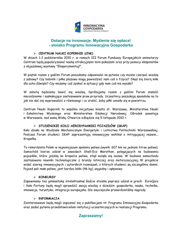 Dotacje na innowacje. Myślenie się opłaca! - stoisko Programu Innowacyjna Gospodarka CENTRUM NAUKI KOPERNIK (CNK) W dniach 1-2 października 2010 r. w ramach III Forum Funduszy Europejskich animatorzy Centrum będą popularyzować naukę atrakcyjnymi mini-pokazami oraz przy pomocy eksponatów z objazdowej wystawy "Eksperymentuj!". W piątek razem z gośćmi Forum poszukamy odpowiedzi na pytanie czy moŜna czerpać wiedzę z zabawy? Czy balonik i piłka plaŜowa mogą powiedzieć nam coś o fizyce? Skąd się biorą miłe dla ucha dźwięki? Czy moŜemy coś zyskać w sytuacji gdy nam coś nie wyszło? W sobotę będziemy bawić się wiedzą. Spróbujemy razem z gośćmi Forum znaleźć niecodzienne i zaskakujące zastosowanie praw przyrody. Uczestnicy poszukają sposobów na to jak nie dać się wyprowadzić z równowagi i co zrobić, Ŝeby piłki unosiły się w powietrzu. Centrum Nauki Kopernik to wspólna inicjatywa miasta st. Warszawy, Ministerstwa Nauki i Szkolnictwa WyŜszego oraz Ministerstwa Edukacji Narodowej. Ośrodek powstaje w Warszawie, nad samą Wisłą. Otwarcie odbędzie się 5 listopada 2010 r. STUDENCKIE KOŁO AERODYNAMIKI POJAZDÓW (SKAP) Koło działa na Wydziale Mechanicznym Energetyki i Lotnictwa Politechniki Warszawskiej. Podczas Forum studenci SKAP zaprezentują innowacyjny wehikuł o intrygującej nazwie... Kropelka. To rekordzista Polski w najmniejszym spalaniu paliwa (wynik: 607 km na jednym litrze paliwa). Samochód bierze udział w zawodach Shell-Eco Marathon, polegających na budowaniu pojazdów, które jeŜdŜą na kropelce paliwa, stąd wzięła się nazwa. W budowie samochodu zastosowano nowinki technologiczne z branŜy lotniczej oraz motoryzacyjnej. W projekcie widać szereg innowacyjnych i autorskich rozwiązań, z których studenci są szczególnie dumni. Pojazd pali mało paliwa, jest bardzo lekki (46 kg), wygodny i opływowy. KONKURSY Zapewniamy teŜ gimnastykę intelektualną! Goście stoiska poprzez udział w grach: EuroQuiz i Koło Fortuny będą mogli sprawdzić swoją wiedzę z dziedzin: gospodarka, nauka, technika, innowacje, turystyka, integracja europejska. Dla zwycięzców przewidzieliśmy nagrody. INFORMACJA Zainteresowani będą mogli zapoznać się z publikacjami nt. Programu Innowacyjna Gospodarka oraz zadać pytania przedstawicielom instytucji uczestniczących w realizacji Programu. Zapraszamy!