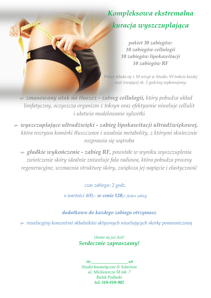 Kompleksowa ekstremalna kuracja wyszczuplająca pakiet 30 zabiegów: 10 zabiegów cellulogii 10 zabiegów lipokawitacji 10 zabiegów RF Pakiet składa się z 10 wizyt w Studio. W trakcie każdej sesji trwającej ok. 2 godziny wykonujemy: zmasowany atak na tłuszcz - zabieg cellulogii, który pobudza układ limfatyczny, oczyszcza organizm z toksyn oraz efektywnie niweluje cellulit i ułatwia modelowanie sylwetki wyszczuplające ultradźwięki - zabieg lipokawitacji ultradźwiękowej, która rozrywa komórki tłuszczowe i uwalnia metabolity, z którymi skutecznie rozprawia się wątroba gładkie wykończenie - zabieg RF, powstałe w wyniku wyszczuplenia zwiotczenie skóry idealnie zniweluje fala radiowa, która pobudza procesy regeneracyjne, wzmacnia strukturę skóry, zwiększa jej napięcie i elastyczność czas zabiegu: 2 godz. o wartości 400,- w cenie 120,- /jeden zabieg dodatkowo do każdego zabiegu otrzymasz rewelacyjny koncentrat składników aktywnych niwelujących skórkę pomarańczową Umów się już dziś! Serdecznie zapraszamy! _______________ Studio kosmetyczne & Solarium ul. Mickiewicza 58 lok. 7 Bielsk Podlaski tel. 510-810-902