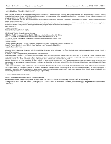 Miasto i Gmina Siewierz - http://www.siewierz.pl/ Data umieszczenia informacji: 2013-05-24 13:02:59 RAJD SILESIA - TRASA SIEWIERSKA Rajd Silesia to największe przedsięwzięcie edukacyjno-turystyczne Chorągwi Śląskiej Związku Harcerstwa Polskiego. Na przełomie maja i czerwca kilkuset turystów będzie przemierzać szlaki Górnego Śląska, regionu wchodzącego w skład województwa śląskiego i opolskiego, aby po 4 dniach niesamowitej przygody spotkać się w jednym ze śląskich miast. W rajdzie biorą udział harcerze, kluby turystyczne, rodziny i nieformalne grupy przyjaciół. Rajd Silesia jest niezwykłą przygodą w mało rozpowszechnionym nurcie turystyki kulturowej. W dniach 30-31 maja odbędzie się Trasa Siewierska Rajdu Silesia, na którą organizatorzy przygotowali kilka atrakcji. Zwycięzcy Rajdu otrzymają Puchar Burmistrza Miasta i Gminy Siewierz. Poniżej przedstawiamy program Rajdu wraz z krótkimi informacjami: Rajd Silesia 2013 Trasa III Siewierska Szlakiem biskupim po Górnym Śląsku KOMENDANT TRASY: dh. pwd. Andrea Krawczyk OBSŁUGA TRASY: Przedstawicielstwo Śląskie WDG wraz z środowiskiem hufca ZHP Zabrze WIEK UCZESTNIKÓW: Trasa przeznaczona dla dzieci i młodzieży w wieku 13- 25 lat TYP TRASY: Piesza, z odcinkiem kajakowym i kolejowym, przygodowa typu Indiana Jones PRZEBIEG TRASY: 1 dzień.: Siewierz 2 dzień.: Siewierz- Krawce- (Odcinek kajakowy)- Przeczyce- (autokar)- Świerklaniec –Piekary Śląskie ( 8 km) 3 dzień.: Piekary Śląskie- Bytom (10 km)- (Kolej Wąskotorowa)- Tarnowskie Góry (5 km) 4 dzień.: Tarnowskie Góry ATRAKCJE TRASY: Zamek w Siewierzu, kościół romański w Siewierzu, spływ kajakowy, Park Świerklaniecki, Kolej Wąskotorowa, Kopalnia Srebra, Zamek w Starych Tarnowicach. BOHATER TRASY: Książę siewierski Jan Rzeszowski biskup krakowski. WPROWADZENIE: Ciemną nocą, pomiędzy starymi murami snują się ponure postacie, cienie minionych wydarzeń. Cicho szepczą- „Zmów, Zdrowaś, jeden, czterdzieści i cztery, trzy…”. Czy ponure zjawy to dawni właściciele zamczyska, dusze czyśćcowe proszące o modlitwę, ukarane za przewinienia dokonane na ziemskim padole, albo łotrzy zamknięci niegdyś w tutejszym lochu, odsiadujący w nim surowe wyroki? Czy coś wspólnego ze sobą ma napis „BITOM” wyryty na wrocławskim Tympanonie Jaksy z dzisiejszym Bytomiem? Jakie znaczenie mają ciągi cyfr namalowane na wewnętrznych ścianach jednego z najstarszych kościołów na ziemiach polskich? To tylko niektóre z wielu tajemnic trasy III Siewierskiej Rajdu Silesia 2013. „Tutaj staniecie twarzą w twarz ze śmiercią, poznacie mroczne oblicza surowych książąt siewierskich, biskupów krakowskich. Trasa III Siewierska Rajdu Silesia 2013 pokaże Wam, że choć średniowiecze na pierwszy rzut oka ma mało wspólnego z teraźniejszością, to te dwa oddzielone setkami lat okresy są ze sobą w niezwykły i tajemniczy sposób powiązane, a wydarzenia z odległych czasów trwają po dziś dzień. Otwórz oczy, wyostrz słuch, dotknij, a wszystko będzie inne niż mogłoby się wydawać.” - reklamują przedsięwzięcie organizatorzy. W samym Siewierzu uczestnicy Rajdu: ■ ■ ■ będą zwiedzali siewierski Zamek z przewodnikiem, dla mieszkańców zorganizują tańce integracyjne (30 maja, 15:00-16:00 - nauka poloneza i tańca belgijskiego) zorganizują teatr cieni na Zamku (30 maja, godz. 21:00-22:00: 30-minutowy spektakl, przedstawiający fragmenty z historii zamku i miasta) Urząd Miasta i Gminy Siewierz, 42-470 Siewierz, ul. Żwirki i WIgury 16, tel. 32 64 99 400, e-mail: [email protected] Burmistrz Miasta i Gminy Siewierz mgr Zdzisław Banaś