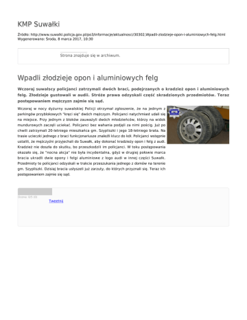 KMP Suwałki Źródło: http://www.suwalki.policja.gov.pl/po3/informacje/aktualnosci/30302,Wpadli-zlodzieje-opon-i-aluminiowych-felg.html Wygenerowano: Środa, 8 marca 2017, 10:30 Strona znajduje się w archiwum. Wpadli złodzieje opon i aluminiowych felg Wczoraj suwalscy policjanci zatrzymali dwóch braci, podejrzanych o kradzież opon i aluminiowych felg. Złodzieje gustowali w audii. Stróże prawa odzyskali część skradzionych przedmiotów. Teraz postępowaniem mężczyzn zajmie się sąd. Wczoraj w nocy dyżurny suwalskiej Policji otrzymał zgłoszenie, że na jednym z parkingów przyblokowych "kręci się" dwóch mężczyzn. Policjanci natychmiast udali się na miejsce. Przy jednym z bloków zauważyli dwóch młodzieńców, którzy na widok mundurowych zaczęli uciekać. Policjanci bez wahania podjęli za nimi pościg. Już po chwili zatrzymali 20-letniego mieszkańca gm. Szypliszki i jego 18-letniego brata. Na trasie ucieczki jednego z braci funkcjonariusze znaleźli klucz do kół. Policjanci wstępnie ustalili, że mężczyźni przyjechali do Suwałk, aby dokonać kradzieży opon i felg z audi. Kradzież nie doszła do skutku, bo przeszkodzili im policjanci. W toku postępowania okazało się, że "nocna akcja" nie była incydentalna, gdyż w drugiej połowie marca bracia ukradli dwie opony i felgi aluminiowe z logo audi w innej części Suwałk. Przedmioty te policjanci odzyskali w trakcie przeszukania jednego z domów na terenie gm. Szypliszki. Dzisiaj bracia usłyszeli już zarzuty, do których przyznali się. Teraz ich postępowaniem zajmie się sąd. Ocena: 0/5 (0) Tweetnij