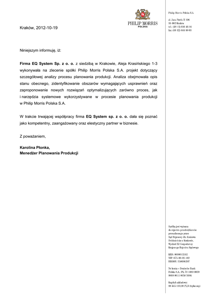 Kraków, 2012-10-19 Niniejszym informuję, iż: Firma EQ System Sp. z o. o. z siedzibą w Krakowie, Aleja Krasińskiego 1-3 wykonywała na zlecenie spółki Philip Morris Polska S.A. projekt dotyczący szczegółowej analizy procesu planowania produkcji. Analiza obejmowała opis stanu obecnego, zidentyfikowanie obszarów wymagających usprawnień oraz zaproponowanie nowych rozwiązań optymalizujących zarówno proces, jak i narzędzia systemowe wykorzystywane w procesie planowania produkcji w Philip Morris Polska S.A. W trakcie trwającej współpracy firma EQ System sp. z o. o. dała się poznać jako kompetentny, zaangażowany oraz elestyczny partner w biznesie. Z poważaniem, Karolina Płonka, Menedżer Planowania Produkcji