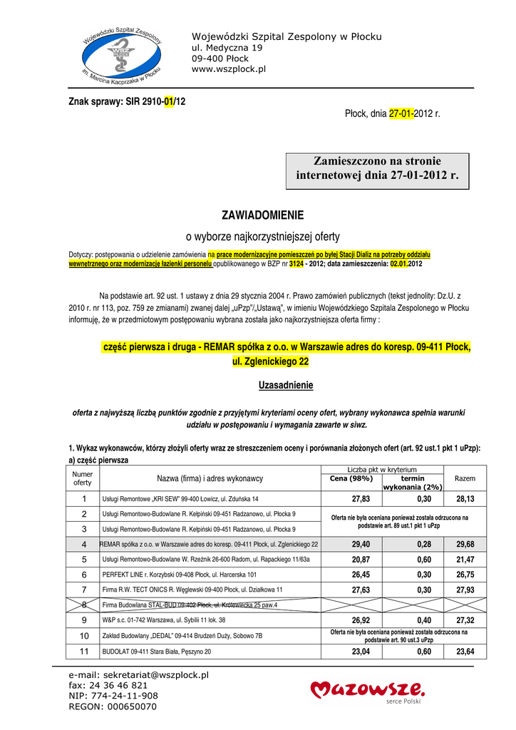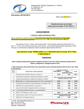Wojewódzki Szpital Zespolony w Płocku ul. Medyczna 19 09-400 Płock www.wszplock.pl Znak sprawy: SIR 2910-01/12 Płock, dnia 27-01-2012 r. Zamieszczono na stronie internetowej dnia 27-01-2012 r. Wg rozdzielnika ZAWIADOMIENIE o wyborze najkorzystniejszej oferty Dotyczy: postępowania o udzielenie zamówienia na prace modernizacyjne pomieszczeń po byłej Stacji Dializ na potrzeby oddziału wewnętrznego oraz modernizację łazienki personelu opublikowanego w BZP nr 3124 - 2012; data zamieszczenia: 02.01.2012 Na podstawie art. 92 ust. 1 ustawy z dnia 29 stycznia 2004 r. Prawo zamówień publicznych (tekst jednolity: Dz.U. z 2010 r. nr 113, poz. 759 ze zmianami) zwanej dalej „uPzp”/„Ustawą”, w imieniu Wojewódzkiego Szpitala Zespolonego w Płocku informuję, że w przedmiotowym postępowaniu wybrana została jako najkorzystniejsza oferta firmy : część pierwsza i druga - REMAR spółka z o.o. w Warszawie adres do koresp. 09-411 Płock, ul. Zglenickiego 22 Uzasadnienie oferta z najwyższą liczbą punktów zgodnie z przyjętymi kryteriami oceny ofert, wybrany wykonawca spełnia warunki udziału w postępowaniu i wymagania zawarte w siwz. 1. Wykaz wykonawców, którzy złożyli oferty wraz ze streszczeniem oceny i porównania złożonych ofert (art. 92 ust.1 pkt 1 uPzp): a) część pierwsza Numer oferty Nazwa (firma) i adres wykonawcy 1 Usługi Remontowe „KRI SEW” 99-400 Łowicz, ul. Zduńska 14 2 Usługi Remontowo-Budowlane R. Kełpiński 09-451 Radzanowo, ul. Płocka 9 3 Usługi Remontowo-Budowlane R. Kełpiński 09-451 Radzanowo, ul. Płocka 9 4 REMAR spółka z o.o. w Warszawie adres do koresp. 09-411 Płock, ul. Zglenickiego 22 Liczba pkt w kryterium Cena (98%) termin wykonania (2%) 27,83 0,30 Razem 28,13 Oferta nie była oceniana ponieważ została odrzucona na podstawie art. 89 ust.1 pkt 1 uPzp 29,40 0,28 29,68 5 Usługi Remontowo-Budowlane W. Rzeżnik 26-600 Radom, ul. Rapackiego 11/63a 20,87 0,60 21,47 6 PERFEKT LINE r. Korzybski 09-408 Płock, ul. Harcerska 101 26,45 0,30 26,75 7 Firma R.W. TECT ONICS R. Węglewski 09-400 Płock, ul. Działkowa 11 27,63 0,30 27,93 8 Firma Budowlana STAL-BUD 09-402 Płock, ul. Królewiecka 25 paw.4 9 W&P s.c. 01-742 Warszawa, ul. Sybilii 11 lok. 38 26,92 0,40 27,32 10 Zakład Budowlany „DEDAL” 09-414 Brudzeń Duży, Sobowo 7B 11 BUDOŁAT 09-411 Stara Biała, Pęszyno 20 e-mail: [email protected] fax: 24 36 46 821 NIP: 774-24-11-908 REGON: 000650070 Oferta nie była oceniana ponieważ została odrzucona na podstawie art. 90 ust.3 uPzp 23,04 0,60 23,64 Wojewódzki Szpital Zespolony w Płocku ul. Medyczna 19 09-400 Płock www.wszplock.pl b) część druga Numer oferty 1 Usługi Remontowe „KRI SEW” 99-400 Łowicz, ul. Zduńska 14 2 Usługi Remontowo-Budowlane R. Kełpiński 09-451 Radzanowo, ul. Płocka 9 3 Usługi Remontowo-Budowlane R. Kełpiński 09-451 Radzanowo, ul. Płocka 9 4 Liczba pkt w kryterium Cena (98%) termin wykonania (2%) Nazwa (firma) i adres wykonawcy 18,18 0,30 Razem 18,48 Oferta nie była oceniana ponieważ została odrzucona na podstawie art. 89 ust.1 pkt 1 uPzp REMAR spółka z o.o. w Warszawie adres do koresp. 09-411 Płock, ul. Zglenickiego 22 29,40 0,14 29,54 5 Usługi Remontowo-Budowlane W. Rzeżnik 26-600 Radom, ul. Rapackiego 11/63a 23,11 0,30 23,41 6 PERFEKT LINE r. Korzybski 09-408 Płock, ul. Harcerska 101 27,24 0,15 27,39 7 Firma R.W. TECT ONICS R. Węglewski 09-400 Płock, ul. Działkowa 11 8 Firma Budowlana STAL-BUD 09-402 Płock, ul. Królewiecka 25 paw.4 26,68 0,14 26,82 9 W&P s.c. 01-742 Warszawa, ul. Sybilii 11 lok. 38 18,27 0,60 18,87 10 Zakład Budowlany „DEDAL” 09-414 Brudzeń Duży, Sobowo 7B 27,86 0,14 28,00 11 BUDOŁAT 09-411 Stara Biała, Pęszyno 20 21,36 0,20 21,56 2. Informacja o odrzuceniu ofert z udziału w postępowaniu (art. 92 ust.1 pkt 2 uPzp): a) zgodnie z zapisami art. 82 ust. 1 uPzp - w jednym postępowaniu o udzielenie zamówienia publicznego wykonawca może złożyć tylko jedną ofertę. Wykonawca firma Usługi Remontowo-Budowlane R. Kełpiński 09-451 Radzanowo, ul. Płocka 9 w przedmiotowym postępowaniu złożył dwie oferty na każdą z części zamówienia (dwie koperty oznakowane identycznie : przetarg – stacja dializ nie otwierać przed 17-01-2012r.). Zgodnie z Ustawą złożenie większej liczby ofert przez tego samego wykonawcę skutkuje odrzuceniem wszystkich z nich, jako niezgodnych z ustawą (art. 89 ust. 1 pkt 1 uPzp). b) Zamawiający działając na podstawie art.90 ust.1 Ustawy zwrócił się do wykonawcy Zakładu Budowlananego „DEDAL” 09-414 Brudzeń Duży, Sobowo 7B o wyjaśnień elementów oferty złożonej na część pierwszą przedmiotowego zamówienia mających wpływ na wysokość ceny. Wykonawca we wskazanym przez Zmawiającego terminie wyjaśnień nie złożył. Oferta wykonawcy w części pierwszej przedmiotowego zamówienia została odrzucona na podstawie art.90 ust.3 uPzp. 3. Informacja o wykonawcach wykluczonych z udziału w postępowaniu (art. 92 ust.1 pkt 3 uPzp): nie dotyczy Jednocześnie informuję, że zgodnie z art. 94 ust. 1 pkt. 2 uPzp umowa w sprawie zamówienia publicznego może być zawarta po upływie pięciu dni od przesłania niniejszego zawiadomienia. Podpisał: Dyrektor WSZ w Płocku mgr Stanisław Kwiatkowski e-mail: [email protected] fax: 24 36 46 821 NIP: 774-24-11-908 REGON: 000650070