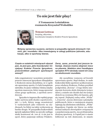 „Nowa Konfederacja” nr 39, 3–9 lipca 2014 To nie jest fair play! www.nowakonfederacja.pl Z Tomaszem Leśniakiem rozmawia Krzysztof Wołodźko TomasZ LeśniaK Socjolog, aktywista, koordynator inicjatywy Kraków Przeciw Igrzyskom Motywy sprzeciwu są jasne, zarówno w przypadku igrzysk zimowych i letnich, jak i mundialu: albo inwestujemy w usługi publiczne (zdrowie, edukacja), albo w sportowy biznes. Często w ostatnich miesiącach słyszał pan, że jest pan, jako koordynator inicjatywy Kraków Przeciw Igrzyskom, przeciwnikiem pięknych sportowych emocji? Zaraz, zaraz, przecież jest jeszcze telewizja. Zawsze można obejrzeć mecz na plazmie. Niektóre sieci handlujące sprzętem RTV obniżały nawet ich ceny na okoliczność mundialu. Jako organizatorzy i uczestnicy protestów przeciw zimowym igrzyskom olimpijskim w Krakowie nieraz słyszeliśmy, że w ogóle nie uprawiamy sportu. Co było kompletnie nietrafne, bo jasno widzimy różnicę między sportem masowym, który mogą uprawiać różne grupy społeczne, a sportem zawodowym. Igrzyska to impreza dla wąskiej grupy ludzi: zarówno jeśli chodzi o sportowców, jak i o tych, którzy mogą uczestniczyć w wydarzeniach jako widzowie na stadionach, bo bilety na takie wydarzenia są bardzo drogie. W przypadku krakowskich igrzysk najtańsze bilety na zawody carlingu miały kosztować ok. 100 zł. A nie jest to sport, który pasjonuje miliony Polaków. Ale zaczęliśmy rozmowę od kwestii uprawiania sportu. Stąd dodam, że małe krakowskie kluby sportowe są lekceważone przez włodarzy Krakowa. Podam przykład podgórskiej „Korony”. Z tego klubu miesięcznie korzysta około dziesięciu tysięcy dzieci, a miasto nie chciało dać stu tysięcy złotych na wymianę filtra do basenu, gdy się zepsuł. Najlepiej radzą sobie „Wisła” i „Cracovia”, mocno dotowane z pieniędzy publicznych, które w mniejszym stopniu zajmują się szkoleniem młodzieży. „Wisła” Bogusława Cupiała nie bierze na siebie niemal żadnych obowiązków związanych z popularyzacją sportu, ma profesjonalną drużynę sportową. A Cupiał jest w stanie lobbować na tyle skutecznie, że miasto 1 „Nowa Konfederacja” nr 39, 3–9 lipca 2014 www.nowakonfederacja.pl za 540 mln zł zbudowało mu stadion. I okazało się, że to w większości mieszkańcy Krakowa płacą dziś z podatków koszta utrzymania całej infrastruktury. Jednak nie dotyczy to tylko Polski. Badania przeprowadzone w Londynie pokazują, że przeznaczanie dużych środków finansowych na igrzyska powoduje, iż tracą małe kluby sportowe, szkolenia młodzieży. Zatem efekt igrzysk dla sportu masowego, amatorskiego jest negatywny. przy pesymistycznym scenariuszu, mogłyby kosztować ok. 17 mld zł (a to same koszty organizacyjne!). A do nas, do Krakowa Przeciw Igrzyskom, anonimowo pisali ludzie z rodzimego środowiska biathlonowego, że są przeciwni zimowym igrzyskom w Krakowie, ponieważ widzieli, co się działo po Euro 2012: związki sportowe, oprócz PZPN, dostały mniej pieniędzy choćby na szkolenie. mKoL jest bardzo sprytną Ile kosztują sportowe czy ściślej: sportowo-komercyjne emocje związane z igrzyskami? instytucją. W Karcie olimpijskiej mamy wyraźny Jako KPI przyglądaliśmy się zimowym igrzyskom w Vancouver, Nagano, Turynie. Koszty związane z organizacją imprezy, budową obiektów sportowych na jej potrzeby i obiektów pozasportowych, typu wioska olimpijska, to kwota pomiędzy 7 a 12 mld zł. Zwykle zakładano dużo mniej. Bardzo rzadko jednak liczy się koszty utrzymania dużych obiektów po zakończeniu imprezy. W Krakowie planowano choćby tor do łyżwiarstwa szybkiego, który miał być później utrzymywany z pieniędzy ministerialnych. To był bardzo nierozsądny pomysł na inwestycję, bo w Zakopanem wystarczyło zadaszyć istniejący tor za dużo mniejsze pieniądze, żeby służył na cele szkoleniowe. Miały także powstać hale dla „Wisły” i „Cracovii”. Koszt ich utrzymania szacowano razem na 20 mln zł rocznie. Istotne jest to, że oba kluby nie podjęły żadnych formalnych zobowiązań co do tych obiektów. Miały je rzekomo utrzymywać, ale wspomniałem już, jak wygląda sytuacja ze stadionem „Wisły”. Deklaracje niewiele znaczą i niewiele kosztują. Wiemy ponadto, że faktyczne koszta igrzysk są wyższe o średnio 135 proc. od szacowanych. Zatem igrzyska w Krakowie, zapis o tym, że różnice między szacunkami a kosztami faktycznymi zobowiązane są pokryć miasto i komitet organizacyjny igrzysk Przesadza pan ze złymi wiadomościami. Niekoniecznie. Wspomnę jeszcze o infrastrukturze, związanej choćby z drogami. Sytuacja z Euro 2012 pokazała, że gdy duże inwestycje realizuje się w krótkim czasie, to rosną różnorakie koszta. Problemem jest nie tylko jakość infrastruktury – wielka wpadka na Stadionie Narodowym, gdy podczas meczu Polska–Anglia nie zamknął się dach, obrosła legendą. Problemem były także bankructwa firm, które początkowo zaniżały koszta, żeby wygrać przetarg. Bardzo szybko rosły ceny ziemi i artykułów budowlanych. To dość mocno destabilizowało rynek budowlany. 2 „Nowa Konfederacja” nr 39, 3–9 lipca 2014 www.nowakonfederacja.pl Ponadto niemal wszystkie duże inwestycje przy okazji Euro 2012 były przeprowadzane praktycznie bez pomysłu na późniejsze zagospodarowanie. Dopiero po czasie miasta zastanawiały się, co zrobić z wybudowanymi obiektami. Efekt jest taki, że Warszawa, Wrocław, Poznań, Gdańsk mają duże problemy nawet z wyjściem na zero w kwestii utrzymania tych obiektów. A to zwyczajowo przekłada się na duże cięcia w usługach publicznych, które dotyczą przede wszystkim edukacji. pis o tym, że różnice między szacunkami a kosztami faktycznymi zobowiązane są pokryć miasto i komitet organizacyjny igrzysk. I bardzo często zobowiązania finansowe po olimpiadach spadają właśnie na instytucje publiczne. Ale miasta, które organizują duże wyda