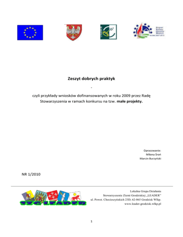 Zeszyt dobrych praktyk czyli przykłady wniosków dofinansowanych w roku 2009 przez Radę Stowarzyszenia w ramach konkursu na tzw. małe projekty. Opracowanie: Milena Śroń Marcin Burzyński NR 1/2010 Lokalna Grupa Działania Stowarzyszenie Ziemi Grodziskiej „LEADER” ul. Powst. Chocieszyńskich 23D; 62-065 62 Grodzisk Wlkp. www.leader-grodzisk.wlkp.pl www.leader 1 Tytuł: Prace konserwatorskie przy obiektach zabytkowych wchodzących w skład wyposażenia kościoła parafialnego p.w. Św. Mikołaja w Prochach. Celem operacji jest wykonanie prac konserwatorskich przy obiektach zabytkowych wchodzących w skład kościoła parafialnego w celu zachowania dziedzictwa kulturowego oraz atrakcyjności regionu. Autor: Parafia Rzymsko –Katolicka p.w. Św. Mikołaja w Prochach Tytuł: Kultywowanie miejscowych tradycji i zwyczajów w czterech porach roku w gminie Rakoniewice Celem operacji jest zorganizowanie w różnych porach roku imprez, które mają na celu promowanie zdolności mieszkańców gminy Rakoniewice przez przeprowadzenie szkoleń, warsztatów i pokazów prac wykonanych przez mieszkańców jak również promocja lokalnego dziedzictwa kulinarnego. Autor: Stowarzyszenie Gospodyń Wiejskich Gminy Rakoniewice Tytuł: Plener malarski z wystawa prac Celem operacji jest zorganizowanie imprezy kulturowej z udziałem mieszkańców gminy Grodzisk Wielkopolski promującej teren gminy, która ma pomóc w podnoszeniu jakości życia społeczności oraz rozwijać zainteresowania związane z malarstwem oraz rzeźbiarstwem. Autor: LEXXIT MEBEL PRODUCTION & TRADING SPÓŁKA Z O.O. Tytuł: V Powiatowy rajd rowerowy – Jubileuszowy Chopinowski Celem operacji jest organizacja rajdu rowerowego dla młodzieży z terenu Powiatu Grodziskiego. Podczas rajdu odbędą się konkursy związane z twórczością i życiem Fryderyka Chopina. Młodzież również będzie mogła pogłębić swoją wiedze na temat Bezpieczeństwa Ruchu Drogowego oraz udzielania Pierwszej Pomocy. Autor : Powiat Grodziski 2 Tytuł: Organizacja imprezy sportowo – pożarniczej Celem operacji jest promowanie sportu wśród młodzieży szkolnej z gminy Kamieniec, zachęcanie młodzieży do aktywnego i zdrowego spędzania czasu wolnego oraz do edukacji przez zabawę. Autor: Ochotnicza Straż Pożarna w Kamieńcu Tytuł: Organizacja imprezy rekreacyjno - sportowej „Turniej Wsi” Celem operacji jest promowanie sportu wśród mieszkańców gminy Kamieniec oraz prezentacja poszczególnych sołectw poprzez sportową aktywność jej reprezentantów. Autor: Towarzystwo Sportowe Gminy Kamieniec Tytuł: Nasze kulturowe i kulinarne dziedzictwo Celem operacji jest integracja i aktywizacja społeczności lokalnej Powiatu Grodziskiego poprzez pokazy florystyczne, szkolenia oraz konkursy i programy artystyczne. Autor: Gmina Kamieniec Tytuł: Promowanie Drezyny Celem operacji jest podniesienie świadomości na temat lokalnej atrakcji turystycznej, jaką są drezyny poprzez organizacje szkoleń związanych z kierowaniem ruchem drogowym na niezabezpieczonych przejazdach kolejowych oraz wydanie folderu, broszur i pocztówek promujących Grodziską Kolej Drezynową. Autor: Grodziska Kolej Drezynowa Tytuł: „Nasz Region” – mapa turystyczna gminy Wielichowo Celem operacji jest wzrost atrakcyjności turystycznej gminy Wielichowo jako miejsca posiadającego cenny zasób dóbr kulturowych i przyrodniczych, poprzez wydanie publikacji w postaci mapy turystycznej obejmującej obszar gminy Wielichowo. Autor: Gmina Wielichowo 3 Tytuł: „ Na dobry Początek” Celem operacji jest stworzenie placu zabaw dla dzieci z wsi Grąblewo, Strzelce, Kurowo, Pantaleonowo i osiedli domków jednorodzinnych w Grodzisku Wielkopolskim, znajdujących się od strony drogi do Grąblewa. Plac ma być miejscem wypoczynku i spędzania czasu wolnego przez dzieci. Autor: Stowarzyszenie „Bezpieczna Wieś Grąblewo” Tytuł: Kwalifikowany Ratownik KSRG Celem operacji jest przeprowadzenie szkoleń z zakresu Kwalifikowanej Pierwszej Pomocy. Szkolenie wykorzystuje lokalną aktywność strażaków-mieszkańców. Autor: Ochotnicza Straż Pożarna w Granowie Tytuł: Wakacyjny turniej piłki nożnej Celem operacji jest promowanie sportu wśród młodzieży szkół podstawowych, gimnazjalnych i ponadgimnazjalnych oraz młodych mieszkańców gminy Granowo przez organizacje turnieju piłki nożnej. Autor: Gmina Granowo Tytuł: Nitką malowane – warsztaty tkania gobelinów wraz z wydaniem publikacji promującej działalność Pracowni Gobelinu w Granowie Celem operacji jest promowanie różnych form aktywności wśród mieszkańców gminy Granowo oraz gmin z nią sąsiadujących w szczególności poprzez zachęcanie mieszkańców, dzieci i młodzieży do czynnego uczestnictwa w działalności Pracowni Gobelinu. Autor: Gmina Granowo 4 Tytuł: Plener malarsko – gobeliniarski w Kotowie Celem operacji jest promowanie prostych form twórczości artystycznej wśród mieszkańców Gminy Granowo i gmin sąsiednich, poprzez malowanie na jedwabiu i wykonywanie unikatowych tkanin. Autor: Gmina Granowo Tytuł: Granowo na ludowo Celem operacji jest promowanie różnych form aktywności artystycznej poprzez organizacje festynu ludowego pt. „Granowo na ludowo” oraz zapoznanie z historią działalności Kółka Rolniczego w Granowie. Autor: Kółko Rolnicze w Granowie Tytuł: Wernisaż talentów mieszkańców gminy Kamieniec Celem operacji jest umożliwienie prezentacji umiejętności artystycznych dzieci, młodzieży oraz dorosłych mieszkańców gminy Kamieniec. Mieszkańcy będą mieć szanse zaprezentowania regionalnej gwary oraz umiejętności związanych z tradycyjnymi zawodami i lokalnym rzemiosłem. Autor: Gmina Biblioteka Publiczna Tytuł: WEB- KIOSKI Celem operacji jest stworzenie multimedialnych kiosków w których będzie można uzyskać darmowy dostęp do Internetu, jak również informacje na temat Grodziska Wielkopolskiego (informacje nt. bazy noclegowej i gastronomicznej, baza i