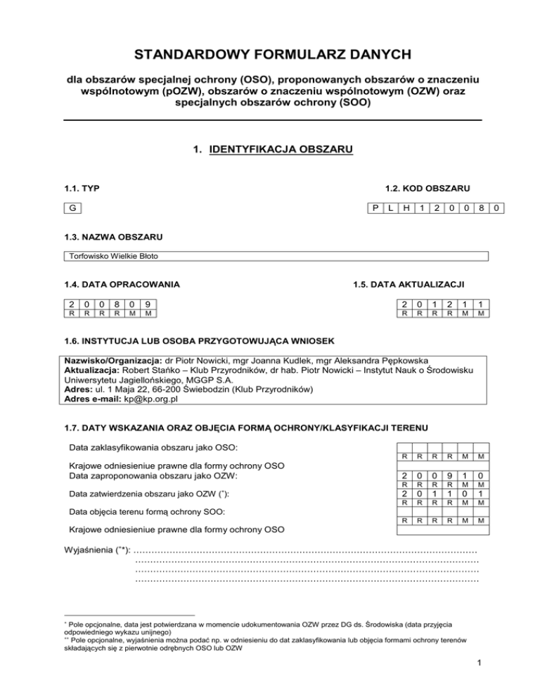 STANDARDOWY FORMULARZ DANYCH dla obszarów specjalnej ochrony (OSO), proponowanych obszarów o znaczeniu wspólnotowym (pOZW), obszarów o znaczeniu wspólnotowym (OZW) oraz specjalnych obszarów ochrony (SOO) 1. IDENTYFIKACJA OBSZARU 1.1. TYP 1.2. KOD OBSZARU G P L H 1 2 0 0 8 1.3. NAZWA OBSZARU Torfowisko Wielkie Błoto 1.4. DATA OPRACOWANIA 1.5. DATA AKTUALIZACJI 2 0 0 8 0 9 2 0 1 2 1 1 R R R R M M R R R R M M 1.6. INSTYTUCJA LUB OSOBA PRZYGOTOWUJĄCA WNIOSEK Nazwisko/Organizacja: dr Piotr Nowicki, mgr Joanna Kudlek, mgr Aleksandra Pępkowska Aktualizacja: Robert Stańko – Klub Przyrodników, dr hab. Piotr Nowicki – Instytut Nauk o Środowisku Uniwersytetu Jagiellońskiego, MGGP S.A. Adres: ul. 1 Maja 22, 66-200 Świebodzin (Klub Przyrodników) Adres e-mail: [email protected] 1.7. DATY WSKAZANIA ORAZ OBJĘCIA FORMĄ OCHRONY/KLASYFIKACJI TERENU Data zaklasyfikowania obszaru jako OSO: Krajowe odniesieniue prawne dla formy ochrony OSO Data zaproponowania obszaru jako OZW: Data zatwierdzenia obszaru jako OZW (): R R R R M M 2 0 0 9 1 0 R R R R M M 2 0 1 1 0 1 R R R R M M R R R R M M Data objęcia terenu formą ochrony SOO: Krajowe odniesieniue prawne dla formy ochrony OSO Wyjaśnienia (*): …………………………………………………………………………………………………… …………………………………………………………………………………………………… …………………………………………………………………………………………………… …………………………………………………………………………………………………… Pole opcjonalne, data jest potwierdzana w momencie udokumentowania OZW przez DG ds. Środowiska (data przyjęcia odpowiedniego wykazu unijnego) Pole opcjonalne, wyjaśnienia można podać np. w odniesieniu do dat zaklasyfikowania lub objęcia formami ochrony terenów składających się z pierwotnie odrębnych OSO lub OZW 1 0 2. POŁOŻENIE OBSZARU 2.1. POŁOŻENIE CENTRALNEGO PUNKTU OBSZARU Długość geograficzna E 20˚ 16’ 30” Szerokość geograficzna N 50 ˚ 1’ 7” 2.2. POWIERZCHNIA OBSZARU [ha]: 350,2 2.3. OBSZAR MORSKI [%] 2.4. DŁUGOŚĆ OBSZARU [km] 2.5. KOD I NAZWA REGIONU ADMINISTRACYJNEGO Kod poziomu NUTS 2 P L 2 1 Nazwa regionu małopolskie 2.6. REGION BIOGEOGRAFICZNY Alpejski Atlantycki Czarnomorski % % % X Borealny Kontynentalny Makaronezyjski Dodatkowe informacje na temat regionów morskich Morski atlantycki % Morski czarnomorski % Morski bałtycki % % % % Śródziemnomorski Panoński Stepowy Morski śródziemnomorski Morski makronezyjski % % % % % Jeśli teren jest zlokalizowany w większej liczbie regionów niż jeden, należy podać (opcjonalnie) wartość procentową pokrycia w odniesieniu do danego regionu Wskazanie regionów morskich wynika z przyczyn praktycznych/technicznych i dotyczy tych państw członkowskich, w których jeden lądowy obszar biogeograficzny graniczy z dwoma regionami morskimi 2 3. INFORMACJA PRZYRODNICZA 3.1. TYPY SIEDLISK PRZYRODNICZYCH WYSTĘPUJĄCYCH NA TERENIE OBSZARU I OCENA ZNACZENIA OBSZARU DLA TYCH SIEDLISK Kod PF: NP. Pokrycie: Jaskinie: Jakość danych: PF Typy siedlisk wymienione w załączniku I NP Pokrycie Jaskinie [ha] [liczba] Jakość danych G/M/P A/B/C/D Reprezentatywność Ocena obszaru A/B/C Powierzchnia Stan względna zachowania Ocena ogólna dla typów siedlisk, do których mogą odnosić się zarówno formy priorytetowe, jak i niepriorytetowe (6210, 7130, 9430) należy wpisać „x” w kolumnie PF celem wskazania formy priorytetowej. jeśli dany typ siedliska nie istnieje już na danym terenie, należy wpisać „x” (opcjonalnie). można wpisywać z dokładnością do wartości dziesiętnych. w przypadku siedlisk typu 8310 i 8330 (jaskinie) należy podać liczbę jaskiń, jeśli nie są dostępne szacunkowe dane na temat powierzchni. G = „wysoka” (np. na podstawie badań); M = „przeciętna” (np. na podstawie częściowych danych i ekstrapolacji); P = „niska” (np. zgrubne dane szacunkowe). 3 3.2. GATUNKI OBJĘTE ART. 4 DYREKTYWY 2009/147/WE I GATUNKI WYMIENIONE W ZAŁĄCZNIKU II DO DYREKTYWY 92/43/EWG ORAZ OCENA ZNACZENIA OBSZARU DLA TYCH GATUNKÓW Grupa I I I Kod 6179 6177 1060 Gatunek Nazwa naukowa Phengaris nausithous Phengaris teleius Lycaena dispar S NP Typ P P P Populacja w obszarze Wielkość Jednostka Kategoria Min Max C/R/V/P G/M/P/DD Jakość danych A/B/C/D Populacja G G G C C C Ocena obszaru A/B/C Stan Izolacja zachowania B C B C B C Ocena ogólna B B B A = płazy, B = ptaki, F = ryby, I = bezkręgowce, M = ssaki, P = rośliny, R = gady. jeśli dane o gatunku są szczególnie chronione i nie mogą być udostępnione publicznie, należy wpisać „tak”. jeśli dany gatunek nie występuje już na danym terenie, należy wpisać „x” (opcjonalnie). p = osiadłe, r = wydające potomstwo, c = przelotne, w = zimujące (w przypadku roślin i gatunków niemigrujących należy użyć terminu „osiadłe”). i = osobniki pojedyncze, p = pary lub inne jednostki według standardowego wykazu jednostek i kodów zgodnego ze sprawozdawczością na podstawie art. 12 i 17 (zob. portal referencyjny). Kategorie liczebności (kategoria): C = powszechne, R = rzadkie, V = bardzo rzadkie, P = obecne – wypełnić, jeżeli brak jest danych (DD), lub jako uzupełnienie informacji o wielkości populacji. Jakość danych: G = „wysoka” (np. na podstawie badań); M = „przeciętna” (np. na podstawie częściowych danych i ekstrapolacji); P = „niska” (np. zgrubne dane szacunkowe); DD = brak danych (kategorię tę należy stosować wyłącznie, jeśli nie da się dokonać nawet zgrubnej oceny wielkości populacji – w takiej sytuacji można pozostawić puste pole dotyczące wielkości populacji, jednak pole „Kategorie liczebności” musi być wypełnione). Grupa: S: NP: Typ: Jednostka: 4 3.3 INNE WAŻNE GATUNKI FAUNY I FLORY (OPCJONALNIE) Grupa Kod Grupa: KOD: S: 