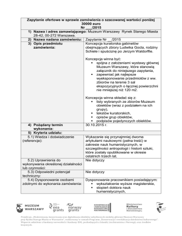 Zapytanie ofertowe w sprawie zamówienia o szacowanej wartości poniżej 30000 euro Nr ___/2015 1) Nazwa i adres zamawiającego: Muzeum Warszawy Rynek Starego Miasta 28-42, 00-272 Warszawa. 2) Nazwa nadana zamówieniu: Zapytanie Nr __/2015 3) Opis przedmiotu Koncepcja kuratorska gabinetów zamówienia: obejmujących zbiory Ludwika Gocla, rodziny Schiele i spuściznę po Jerzym Waldorffie. Koncepcja winna być: spójna z założeniami wystawy głównej Muzeum Warszawy, które stanowią załącznik do niniejszego zapytania, zapewniać jak najlepsze wyeksponowanie przedmiotów z ww. zbiorów na terenie 3 sal ekspozycyjnych o łącznej powierzchni nie mniejszej niż 120 m2. 4) Pożądany termin wykonania: 5) Kryteria udziału: 5.1) Wiedza i doświadczenie (referencje): Koncepcja winna składać się z: listy wybranych ze zbiorów Muzeum obiektów (wraz z podziałem na ich grupy), tekstów kuratorskich, opisów grup obiektów, podpisów pojedynczych obiektów. 30.10.2015 r. Wykazanie się przynajmniej dwoma artykułami naukowymi (pełna treść) w zakresie nauk humanistycznych, w szczególności antropologii i historii sztuki, które zostały opublikowane w okresie ostatnich trzech lat. Nie dotyczy 5.2) Uprawnienia do wykonywania określonej działalności lub czynności: 5.3) Odpowiedni potencjał Nie dotyczy techniczny: 5.4) Dysponowanie osobami Dysponowanie pracownikiem posiadającym: zdolnymi do wykonania zamówienia: wykształcenie wyższe magisterskie, stopień doktora nauk humanistycznych, Projekt pn. „Modernizacja, konserwacja oraz digitalizacja obiektów zabytkowych siedziby głównej Muzeum Warszawy przy Rynku Starego Miasta w Warszawie”, realizowany w ramach Programu „Konserwacja i rewitalizacja dziedzictwa kulturowego”. Wsparcie udzielone z funduszy norweskich i funduszy EOG, pochodzących z Islandii, Liechtensteinu i Norwegii, oraz środków krajowych. przynajmniej 3-letnie doświadczenie w pracy naukowo-badawczej. Nie dotyczy 5.5) Sytuacja ekonomiczna i finansowa 6) Miejsce i forma składania ofert: W siedzibie w godzinach pracy Muzeum lub e-mail: [email protected] 7) Termin składania ofert: 8) Kryteria wyboru 1. 2. 3. 4. Do dnia 20.05.2015 r. 50% doświadczenie, 50% cena Ocenie podlegać będą dwa przedstawione artykuły naukowe, w tym: umiejętność posługiwania się aparatem naukowym 0-10 pkt za każdy artykuł, zbieżność zainteresowań badawczych z postawionym zadaniem 0-10 pkt za każdy artykuł. 9) Osoba do kontaktu ze Jakub Supera strony zamawiającego: [email protected] Muzeum Warszawy w przypadku zaakceptowania zakupu przez kierownika jednostki i zagwarantowania finansowania realizacji zamówienia, spośród prawidłowo zgłoszonych kandydatur wybierze podmiot, któremu powierzy realizację zamówienia. Muzeum Warszawy zastrzega sobie prawo kontaktu jedynie z wybranymi podmiotami. Niniejsze ogłoszenie nie stanowi oferty w rozumieniu kodeksu cywilnego i nie może stanowić podstawy do wysuwania roszczeń względem Muzeum Warszawy Muzeum nie ponosi kosztów sporządzenia oferty. Formularz ofertowy i założenia do wystawy głównej W ZAŁĄCZENIU Projekt pn. „Modernizacja, konserwacja oraz digitalizacja obiektów zabytkowych siedziby głównej Muzeum Warszawy przy Rynku Starego Miasta w Warszawie”, realizowany w ramach Programu „Konserwacja i rewitalizacja dziedzictwa kulturowego”. Wsparcie udzielone z funduszy norweskich i funduszy EOG, pochodzących z Islandii, Liechtensteinu i Norwegii, oraz środków krajowych. Założenia nowej wystawy głównej Muzeum Warszawy Podejmując prace zmierzające do stworzenia nowej wystawy głównej naszego Muzeum stajemy wobec najważniejszego wyzwania w całym procesie o d n o wy instytucji. Mając tego świadomość wybraliśmy drogę długą, z licznymi przystankami, ale pozwalającą działać rozważnie i zatrzymać się z namysłem nad każdą rodzącą się w naszym zespole ideą. Ten sposób dochodzenia do celu pozwoli nam – w co głęboko wierzę – uniknąć mielizn populizmu i pułapek wystawienniczych mód. 1965–2017 Nasze położenie podobne jest do tego, w którym znalazło się Muzeum w latach 1955-1965 – w czasie tworzenia pierwszej powojennej ekspozycji stałej. Ówczesny dyrektor – Janusz Durko, relacjonując ten proces w 1969 roku, pisał: „Dzieje Warszawy na przestrzeni siedmiu wieków istnienia to zarówno dzieje polityczne miasta, jak i gospodarcze, społeczne, kulturalne oraz rozwoju przestrzennego. Pragnieniem historyka-muzeologa jest powiedzenie wszystkiego, co da się na te tematy powiedzieć”1. Tak. I dziś podzielamy obawę przed pominięciem istotnych wątków, postaci czy wydarzeń, przed zatrzymaniem w magazynach zbyt wielu przedmiotów. Durko kontynuuje: „Określona powierzchnia sal muzealnych stwarza granice tych możliwości. To dobrze! Nie sposób bowiem nie liczyć się z odbiorcą, z granicą chłonności umysłu ludzkiego”2. To niezaprzeczalne. Na etapie prac na jakim się obecnie znajdujemy (grudzień 2013 r.) staramy się jednak jeszcze nie krępować myśleniem o przestrzeni, o „powierzchni sal muzealnych”. Myślimy o wystawie nie jako o materii (stelażu i przedmiotach na nim/w nim umieszczonych), ale jako idei. wystawa jako centrum życia Muzeum Od początku prac naszego zespołu z rozmysłem posługuję się określeniem wy s t a wa g łó wn a , nie zaś wy s t a wa s t a ła . Stałość wystawy ewokuje jej niezmienność, trwałość, która wobec postępów badań historycznych oraz intelektualnych przewartościowań zmieniających naszą perspektywę, zdaje się balastem – nie zaletą. Wszyscy bez trudu wymienić możemy muzea, które istnieją o b o k swoich s t a ły c h ekspozycji, zastygłych w momencie otwarcia. Trwanie ekspozycji na uboczu życia muzeum skazuje je na skostnienie, a niekiedy wręcz zapomnienie. Trudno uniknąć tego losu, jeśli buduje się wystawę s t a łą raz na wiele lat – co oznacza „niemal na zawsze”. Wysta
