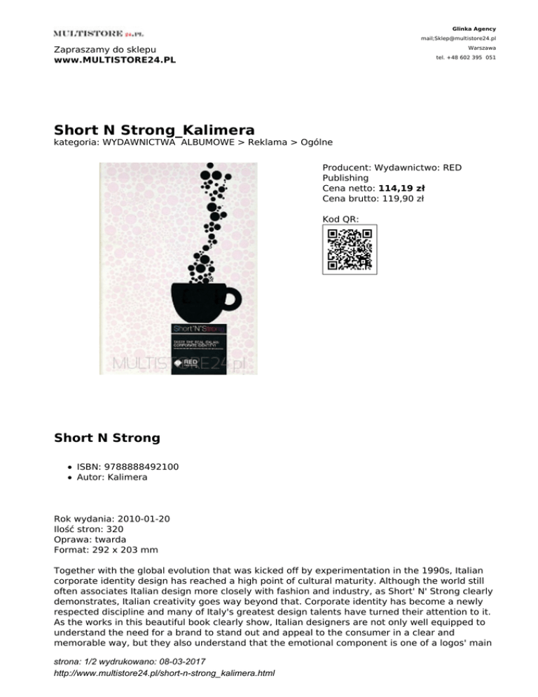Glinka Agency mail;[email protected] Zapraszamy do sklepu www.MULTISTORE24.PL Warszawa tel. +48 602 395 051 Short N Strong_Kalimera kategoria: WYDAWNICTWA ALBUMOWE > Reklama > Ogólne Producent: Wydawnictwo: RED Publishing Cena netto: 114,19 zł Cena brutto: 119,90 zł Kod QR: Short N Strong ISBN: 9788888492100 Autor: Kalimera Rok wydania: 2010-01-20 Ilość stron: 320 Oprawa: twarda Format: 292 x 203 mm Together with the global evolution that was kicked off by experimentation in the 1990s, Italian corporate identity design has reached a high point of cultural maturity. Although the world still often associates Italian design more closely with fashion and industry, as Short' N' Strong clearly demonstrates, Italian creativity goes way beyond that. Corporate identity has become a newly respected discipline and many of Italy's greatest design talents have turned their attention to it. As the works in this beautiful book clearly show, Italian designers are not only well equipped to understand the need for a brand to stand out and appeal to the consumer in a clear and memorable way, but they also understand that the emotional component is one of a logos' main strona: 1/2 wydrukowano: 08-03-2017 http://www.multistore24.pl/short-n-strong_kalimera.html functions. strona: 2/2 wydrukowano: 08-03-2017 http://www.multistore24.pl/short-n-strong_kalimera.html