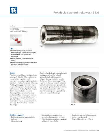 Pęknięcia sworzni tłokowych | 3.6 3.6.2 Pęknięty sworzeń tłokowy Rys. 1 Opis • Poprzeczne pęknięcie sworznia tłokowego (rys. 1) na przejściu między korbowodem i piastą sworznia tłokowego. • Rozszczepienie podłużne krótszej części. • Powierzchnie pęknięcia mają charakter pęknięcia zmęczeniowego. Ocena Pęknięcia sworzni tłokowych są skutkiem przeciążeń. Wskutek deformacji owalnej sworznia tłokowego i otworach przeciążenie powoduje najpierw podłużne pęknięcie na końcach sworznia tłokowego. Punkt wyjściowy pęknięcia może się znajdować na powierzchni zewnętrznej, jak i wewnątrz otworu. Pęknięcie biegnie dalej w kierunku środka sworznia tłokowego. W obszarze największego obciążenia siłami ścinającymi i gnącymi między otworem sworznia tłokowego i główką korbowodu kierunek pęknięcia przechodzi w poprzeczny, co ostatecznie powoduje złamanie całego sworznia tłokowego. Możliwe przyczyny • Zakłócenia spalania, często spalanie stukowe. • Uderzenia cieczy. Rys. 2 pokazuje, że pierwsze naderwanie może powstać nie tylko wskutek przeciążenia, lecz także wskutek nieprawidłowego montażu sworznia tłokowego. Strona czołowa pękniętego sworznia tłokowego wyraźnie wskazuje, że naderwanie materiału spowodowało uszkodzenie (przez uderzenie młotkiem). Takie naderwanie może także przy normalnym obciążeniu spowodować złamanie sworznia tłokowego. Rys. 2 • Nieprawidłowe postępowanie ze sworzniem tłokowym przy montażu. • Przeciążenia sworznia tłokowego przez zwiększenie mocy silnika. • Osłabienie sworznia tłokowego przez tuning (redukcja masy). • Nieprawidłowy sworzeń tłokowy. Uszkodzenia tłoków – rozpoznawanie i usuwanie | 53
