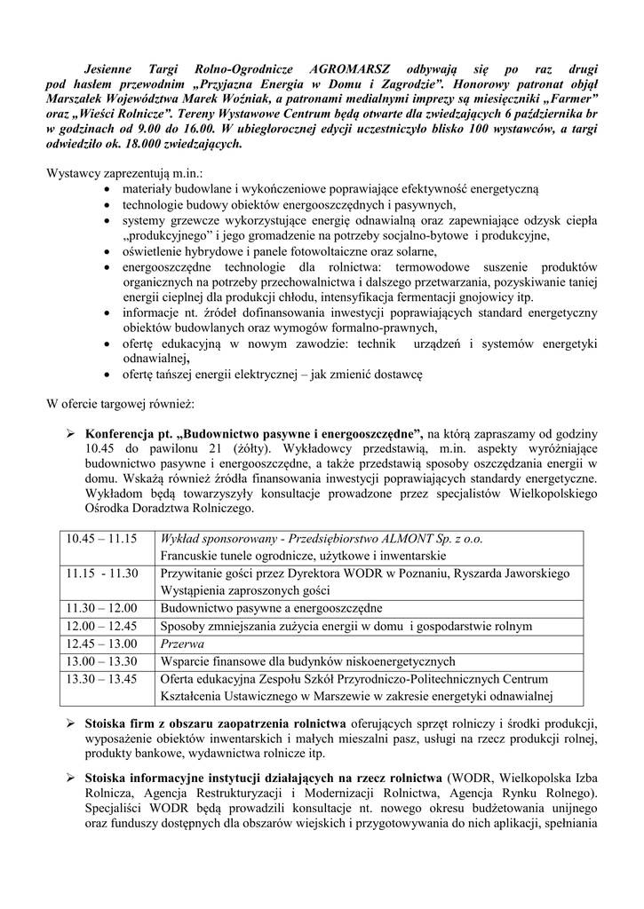 Jesienne Targi Rolno-Ogrodnicze AGROMARSZ odbywają się po raz drugi pod hasłem przewodnim „Przyjazna Energia w Domu i Zagrodzie”. Honorowy patronat objął Marszałek Województwa Marek Woźniak, a patronami medialnymi imprezy są miesięczniki „Farmer” oraz „Wieści Rolnicze”. Tereny Wystawowe Centrum będą otwarte dla zwiedzających 6 października br w godzinach od 9.00 do 16.00. W ubiegłorocznej edycji uczestniczyło blisko 100 wystawców, a targi odwiedziło ok. 18.000 zwiedzających. Wystawcy zaprezentują m.in.: materiały budowlane i wykończeniowe poprawiające efektywność energetyczną technologie budowy obiektów energooszczędnych i pasywnych, systemy grzewcze wykorzystujące energię odnawialną oraz zapewniające odzysk ciepła „produkcyjnego” i jego gromadzenie na potrzeby socjalno-bytowe i produkcyjne, oświetlenie hybrydowe i panele fotowoltaiczne oraz solarne, energooszczędne technologie dla rolnictwa: termowodowe suszenie produktów organicznych na potrzeby przechowalnictwa i dalszego przetwarzania, pozyskiwanie taniej energii cieplnej dla produkcji chłodu, intensyfikacja fermentacji gnojowicy itp. informacje nt. źródeł dofinansowania inwestycji poprawiających standard energetyczny obiektów budowlanych oraz wymogów formalno-prawnych, ofertę edukacyjną w nowym zawodzie: technik urządzeń i systemów energetyki odnawialnej, ofertę tańszej energii elektrycznej – jak zmienić dostawcę W ofercie targowej również: Konferencja pt. „Budownictwo pasywne i energooszczędne”, na którą zapraszamy od godziny 10.45 do pawilonu 21 (żółty). Wykładowcy przedstawią, m.in. aspekty wyróżniające budownictwo pasywne i energooszczędne, a także przedstawią sposoby oszczędzania energii w domu. Wskażą również źródła finansowania inwestycji poprawiających standardy energetyczne. Wykładom będą towarzyszyły konsultacje prowadzone przez specjalistów Wielkopolskiego Ośrodka Doradztwa Rolniczego. 10.45 – 11.15 11.15 - 11.30 11.30 – 12.00 12.00 – 12.45 12.45 – 13.00 13.00 – 13.30 13.30 – 13.45 Wykład sponsorowany - Przedsiębiorstwo ALMONT Sp. z o.o. Francuskie tunele ogrodnicze, użytkowe i inwentarskie Przywitanie gości przez Dyrektora WODR w Poznaniu, Ryszarda Jaworskiego Wystąpienia zaproszonych gości Budownictwo pasywne a energooszczędne Sposoby zmniejszania zużycia energii w domu i gospodarstwie rolnym Przerwa Wsparcie finansowe dla budynków niskoenergetycznych Oferta edukacyjna Zespołu Szkół Przyrodniczo-Politechnicznych Centrum Kształcenia Ustawicznego w Marszewie w zakresie energetyki odnawialnej Stoiska firm z obszaru zaopatrzenia rolnictwa oferujących sprzęt rolniczy i środki produkcji, wyposażenie obiektów inwentarskich i małych mieszalni pasz, usługi na rzecz produkcji rolnej, produkty bankowe, wydawnictwa rolnicze itp. Stoiska informacyjne instytucji działających na rzecz rolnictwa (WODR, Wielkopolska Izba Rolnicza, Agencja Restrukturyzacji i Modernizacji Rolnictwa, Agencja Rynku Rolnego). Specjaliści WODR będą prowadzili konsultacje nt. nowego okresu budżetowania unijnego oraz funduszy dostępnych dla obszarów wiejskich i przygotowywania do nich aplikacji, spełniania wymogów zasady wzajemnej zgodności (cross compliance), podatków i ubezpieczeń oraz działania grup producenckich, itp. Stoiska promocyjne powiatów i gmin z południowej Wielkopolski współpracujących z WODR w zakresie rozwoju obszarów wiejskich Kiermasz ogrodniczy Dzień Otwarty organizuje Zespół Szkół Przyrodniczo-Politechnicznych Centrum Kształcenia Ustawicznego w Marszewie. Do odwiedzenia szkoły w tym dniu i zapoznania się z ofertą edukacyjną zapraszają uczniowie i nauczyciele. ZAPRASZAMY