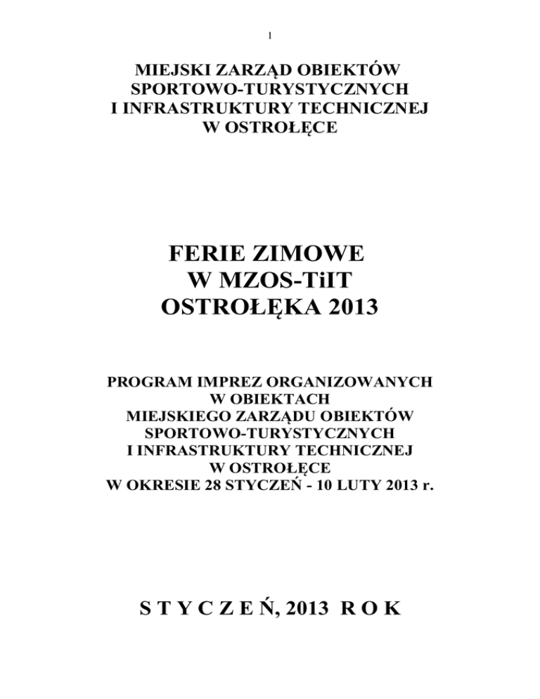 1 MIEJSKI ZARZĄD OBIEKTÓW SPORTOWO-TURYSTYCZNYCH I INFRASTRUKTURY TECHNICZNEJ W OSTROŁĘCE FERIE ZIMOWE W MZOS-TiIT OSTROŁĘKA 2013 PROGRAM IMPREZ ORGANIZOWANYCH W OBIEKTACH MIEJSKIEGO ZARZĄDU OBIEKTÓW SPORTOWO-TURYSTYCZNYCH I INFRASTRUKTURY TECHNICZNEJ W OSTROŁĘCE W OKRESIE 28 STYCZEŃ - 10 LUTY 2013 r. S T Y C Z E Ń, 2013 R O K 2 Lp Nazwa imprezy . 1 2 1. Zgrupowanie sportowe w piłce nożnej Victoria Sulejówek 3. Turniej halowej piłki nożnej dzikich drużyn, rocznik 2000 i młodsi 4. Gry rekreacyjne – tenis stołowy 5. Jazda rekreacyjna na łyżwach Godz. Obiekt 3 4 10.00-11.30 5 Boisko ze sztuczną trawą ul. Witosa 1 Hala ul. Traugutta 1 Hala ul. Partyzantów 3 28 STYCZEŃ PONIEDZIAŁEK 2. Turniej „dzikich drużyn” w koszykówkę Termin 16.00-17.30 10.00-14.00 9.00-10.30 Hala ul. Traugutta 1 10.00-14.00 9.00-21.00 Lodowisko ul. Witosa 1 6. Wypożyczalnia sprzętu zimowego 12.00-20.00 Hotel ul. Witosa 1 1. Zgrupowanie sportowe w piłce nożnej Victoria Sulejówek 10.00-11.30 Boisko ze sztuczną trawą ul. Witosa 1 Hala ul. Traugutta 1 Hala ul. Traugutta 1 16.00-17.30 9.00-14.00 2. Turniej halowej piłki nożnej dzikich drużyn, rocznik 1998-1999 Gry i zabawy na lodowisku: - slalom z prowadzeniem krążka hokejowego - wyścig australijski na łyżwach - bieg na łyżwach na czas 29 STYCZEŃ WTOREK 3. Gry rekreacyjne – tenis stołowy 4. Jazda rekreacyjna na łyżwach 10.00-14.00 9.00-21.00 Lodowisko ul. Witosa 1 11.00-12.00 5. Wypożyczalnia sprzętu zimowego 12.00-20.00 Hotel ul. Witosa 1 1. Zgrupowanie sportowe w piłce nożnej Victoria Sulejówek 10.00-11.30 Boisko ze sztuczną trawą ul. Witosa 1 Hala ul. Traugutta 1 4. Ferie z tenisem, rocznik 1997 i młodsi 5. Jazda rekreacyjna na łyżwach 6. Wypożyczalnia sprzętu zimowego 30 STYCZŃ ŚRODA 2. Turniej dzikich drużyn w piłce siatkowej OPEN 3. Gry rekreacyjne - tenis stołowy 16.00-17.30 9.30-14.00 Hala ul. Traugutta 1 10.00-14.00 10.00-14.00 Hala ul. Partyzantów 3 9.00-21.00 Lodowisko ul. Witosa 1 12.00-20.00 Hotel ul. Witosa 1 3 1. Zgrupowanie sportowe w piłce nożnej Victoria Sulejówek Gry i zabawy na lodowisku: - slalom z prowadzeniem krążka hokejowego - wyścig australijski na łyżwach - bieg na łyżwach na czas 31 STYCZEŃ 3. Jazda rekreacyjna na łyżwach CZWARTEK 2. Turniej tenisa stołowego dziewcząt i chłopców OPEN 10.00-11.30 Boisko ze sztuczną trawą ul. Witosa 1 16.00-17.30 10.00-14.00 Hala ul. Traugutta 1 Hala ul. Traugutta 9.00-21.00 Lodowisko ul. Witosa 1 11.00-12.00 12.00-20.00 Hotel ul. Witosa 1 1. Zgrupowanie sportowe w piłce nożnej Victoria Sulejówek 10.00-11.30 16.00-17.30 Boisko ze sztuczną trawą ul. Witosa 1 Hala ul. Traugutta 1 9.00-21.00 Lodowisko ul. Witosa 1 2. Jazda rekreacyjna na łyżwach 3. Kulig dla dzieci z ogniskiem 1 LUTY PIĄTEK 4. Wypożyczalnia sprzętu zimowego 11.00-13.00 Stadion ul. Witosa 1 4. Wypożyczalnia sprzętu zimowego 12.00-20.00 Hotel ul. Witosa 1 1. Zgrupowanie sportowe w piłce nożnej Victoria Sulejówek 10.00-11.30 Boisko ze sztuczną trawą ul. Witosa 1 1. Jazda rekreacyjna na łyżwach 9.00-21.00 Lodowisko ul. Witosa 1 9.00-18.00 Hotel ul. Witosa 1 3 LU 3. Wypożyczalnia sprzętu zimowego 2 LUTY SOBOTA 2. Jazda rekreacyjna na lodowisku 12.00-20.00 Lodowisko ul. Witosa 4 2. Wypożyczalnia sprzętu zimowego Hotel ul. Witosa 1 1. Turniej dzikich drużyn TRIO BASKET 10.00-14.00 Hala ul. Partyzantów 3 2. Turniej halowej piłki nożnej dzikich drużyn, rocznik 1995-1997 10.00-15.00 3. Gry i zabawy rekreacyjne na lodowisku - slalom z prowadzeniem krążka, - bieg na łyżwach na czas - wyścig australijski na łyżwach 4. Wypożyczalnia sprzętu zimowego 4 LUTY PONIEDZIAŁEK Gry rekreacyjne - tenis stołowy Jazda rekreacyjna na łyżwach TY NIEDZ IELA 9.00-18.00 11.00-12.00 Lodowisko ul. Witosa 1 Hotel ul. Witosa 1 10.00-14.00 5 LUTY WTOREK 2. Jazda rekreacyjna na łyżwach 10.00-14.00 9.00-21.00 12.00-19.00 1. Turniej halowej piłki nożnej dzikich drużyn, rocznik 1995-1997-finał Gry rekreacyjne w tenisie stołowym Hala ul. Traugutta 1 Hala ul. Traugutta 1 10.00-15.00 Lodowisko ul. Witosa 1 3. Wypożyczalnia sprzętu zimowego 12.00-19.00 Hotel ul. Witosa 1 1. Tenisowe zabawy dla dzieci rocz.1997 i młodsi 2. Gry rekreacyjne – piłka siatkowa 10.00-14.00 Hala ul. Partyzantów 3 Gry rekreacyjne - tenis stołowy 3. Jazda rekreacyjna na łyżwach 4. Wypożyczalnia sprzętu zimowego 6 LUTY ŚRODA 9.00-21.00 1. Gry rekreacyjne - tenis stołowy 3. Wypożyczalnia sprzętu zimowego 8 L 1. Gry rekreacyjne - tenis stołowy Hala ul. Traugutta 1 10.00-14.00 9.00-21.00 Lodowisko ul. Witosa 1 12.00-19.00 Hotel ul. Witosa 1 10.00-14.00 7 LUTY 2011r. CZWARTEK Zajęcia rekreacyjne – piłka nożna 2. Jazda rekreacyjna na łyżwach 10.00-14.00 Hala ul. Traugutta 1 10.00-14.00 9.00-21.00 Lodowisko ul. Witosa 12.00-19.00 Hotel ul. Witosa 1 10.00-14.00 5 Hala ul. Traugutta Gry rekreacyjne – siatkówka, piłka nożna 2. Ferie z tenisem, rocznik 1997 i młodsi 4. Kulig dla dzieci z ogniskiem i kiełbaską 5. Wypożyczalnia sprzętu zimowego 2. Wypożyczalnia sprzętu zimowego 2. Wypożyczalnia sprzętu zimowego 10 LUTY NIEDZIELA 1. Jazda rekreacyjna na łyżwach 9 LUTY SOBOTA 1. Jazda rekreacyjna na łyżwach UTY PIĄTEK 3. Jazda rekreacyjna na łyżwach 10.00-14.00 10.00-14.00 Hala ul. Partyzantów 3 9.00-21.00 Lodowisko ul. Witosa 1 11.00 Stadion ul. Witosa 1 12.00-19.00 Hotel ul. Witosa 1 9.00-21.00 Lodowisko ul. Witosa 1 9.00-18.00 Hotel ul. Witosa 1 9.00-21.00 Lodowisko ul. Witosa 1 9.00-18.00 Hotel ul. Witosa 1 UWAGI DO PROGRAMU 1. Wszystkie imprezy na śniegu i lodowisku będą przeprowadzane, gdy pozwolą na to warunki atmosferyczne. 2. Zgłoszenia do wszystkich imprez przyjmowane będą do dnia poprzedzającego imprezę do godz. 12.00. 3. W turniejach piłki nożnej biorą udział drużyny 6-osobowe /5 + bramkarz/. Osoby biorące udział w turniejach z podziałem na roczniki zobowiązani są do posiadania legitymacji szkolnych. 4. Zwycięzcy otrzym