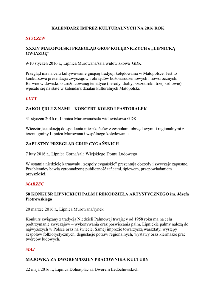 KALENDARZ IMPREZ KULTURALNYCH NA 2016 ROK STYCZEŃ XXXIV MAŁOPOLSKI PRZEGLĄD GRUP KOLĘDNICZYCH o „LIPNICKĄ GWIAZDĘ” 9-10 styczeń 2016 r., Lipnica Murowana/sala widowiskowa GDK Przegląd ma na celu kultywowanie ginącej tradycji kolędowania w Małopolsce. Jest to konkursowa prezentacja zwyczajów i obrzędów bożonarodzeniowych i noworocznych. Barwne widowisko o zróżnicowanej tematyce (herody, draby, szczodroki, trzej królowie) wpisało się na stałe w kalendarz działań kulturalnych Małopolski. LUTY ZAKOLĘDUJ Z NAMI – KONCERT KOLĘD I PASTORAŁEK 31 styczeń 2016 r., Lipnica Murowana/sala widowiskowa GDK Wieczór jest okazją do spotkania mieszkańców z zespołami obrzędowymi i regionalnymi z terenu gminy Lipnica Murowana i wspólnego kolędowania. ZAPUSTNY PRZEGLĄD GRUP CYGAŃSKICH 7 luty 2016 r., Lipnica Górna/sala Wiejskiego Domu Ludowego W ostatnią niedzielę karnawału „zespoły cygańskie” prezentują obrzędy i zwyczaje zapustne. Przebierańcy bawią zgromadzoną publiczność tańcami, śpiewem, przepowiadaniem przyszłości. MARZEC 58 KONKUSR LIPNICKICH PALM I RĘKODZIEŁA ARTYSTYCZNEGO im. Józefa Piotrowskiego 20 marzec 2016 r., Lipnica Murowana/rynek Konkurs związany z tradycją Niedzieli Palmowej trwający od 1958 roku ma na celu podtrzymanie zwyczajów – wykonywania oraz poświęcania palm. Lipnickie palmy należą do najwyższych w Polsce oraz na świecie. Samej imprezie towarzyszą warsztaty, występy zespołów folklorystycznych, degustacje potraw regionalnych, wystawy oraz kiermasze prac twórców ludowych. MAJ MAJÓWKA ZA DWOREM/DZIEŃ PRACOWNIKA KULTURY 22 maja 2016 r., Lipnica Dolna/plac za Dworem Ledóchowskich Pracownicy jednostek, które na co dzień zajmują się animacją kultury w naszej gminie spotykają się na majówce za Dworem Ledóchowskich połączonej z ogniskiem. CZERWIEC ŚWIĘTO TRUSKAWKI 12 czerwiec 2016 r., Rajbrot/plac obok Wiejskiego Domu Ludowego Przedsięwzięcie plenerowe z mnóstwem atrakcji – degustacja truskawkowych smakołyków, konkursy i zabawy z nagrodami, liczne występy orkiestr oraz zespołów. Zakończenie imprezy stanowi trwający do samej północy festyn pod gwiazdami. LIPIEC XXVII PRZEGLĄD PIOSENKI RELIGIJNEJ o „Statuetkę św. Szymona” 24 lipiec 2016 r., Lipnica Murowana/dziedziniec kościoła parafialnego pw. św. Andrzeja Ap. Przegląd jest uwieńczeniem tygodniowego odpustu ku czci św. Szymona z Lipnicy. To okazja do zaprezentowania na scenie lub posłuchania piosenek o tematyce religijnej, w tym także tych związanych ze św. Szymonem. SIERPIEŃ ŚWIĘTO GMINY LIPNICA MUROWANA 14 sierpień 2016 r., Lipnica Dolna/stadion sportowy LZS Macierz To impreza plenerowa prezentująca osiągnięcia kulturalne gminy oraz gwarantująca niezapomnianą zabawę przy muzyce zaproszonych gwiazd. Co roku licznie przybywający widzowie mają również szansę uczestniczenia w konkursach, zabawach oraz niespodziankach przygotowanych specjalnie na tą okazję. DOŻYNKI GMINNE 15 sierpień 2016 r., Lipnica Dolna/stadion sportowy LZS Macierz W tym dniu odbywa się konkurs wieńca dożynkowego poprzedzony Mszą św. dziękczynną za zebrane plony. Imprezę uświetniają występy zespołów, orkiestry oraz zabawa pod gwiazdami dla wszystkich przybyłych. WRZESIEŃ JESIEŃ W BORZE 4 wrzesień 2016 r., Borówna/plac obok Ośrodka Edukacji W trakcie tej plenerowej imprezy każdy znajdzie coś dla siebie. Na najmłodszych czekają liczne konkursy, gry i zabawy. Na scenie nie może zabraknąć artystów wraz z którymi wszyscy przybyli mają okazję pośpiewać i pobiesiadować. PAŹDZIERNIK IV GMINNY KONKURS RECYTATORSKI „SŁOWEM MALOWANE” im. Kazimierza Brodzińskiego pod honorowym patronatem Wójta Gminy Lipnica Murowana 11 październik 2016 r., Lipnica Murowana/sala widowiskowa GDK Konkurs przeznaczony jest dla dzieci i młodzieży z terenu gminy Lipnica Murowana. Celem konkursu jest zainteresowanie dzieci i młodzieży sztuką recytacji i kultury słowa a także motywowanie uczniów do poszerzania znajomości literatury i poezji polskiej. WIECZÓR POETYCKI 30 październik 2016 r., Lipnica Murowana/sala widowiskowa GDK Wieczór jest wynikiem przeprowadzonego wcześniej Konkursu Recytatorskiego „Słowem malowane” im. Kazimierza Brodzińskiego. Laureaci prezentują się w obecności zaproszonych gości i rodziców. LISTOPAD PODSUMOWANIE ROKU KULTURALNEGO 19 listopad 2016 r., Lipnica Górna/sala Wiejskiego Domu Ludowego GRUDZIEŃ MIKOŁAJKOWE SPOTKANIE Z BAJKĄ 4 grudzień 2016 r., Lipnica Murowana/sala widowiskowa GDK Impreza ta przygotowana jest przez dzieci uczęszczające na zajęcia w świetlicach. To widowisko sceniczne, które podziwiać mogą wszyscy mieszkańcy naszej gminy. Jednym z najbardziej oczekiwanych momentów tego popołudnia jest przybycie samego św. Mikołaja.
