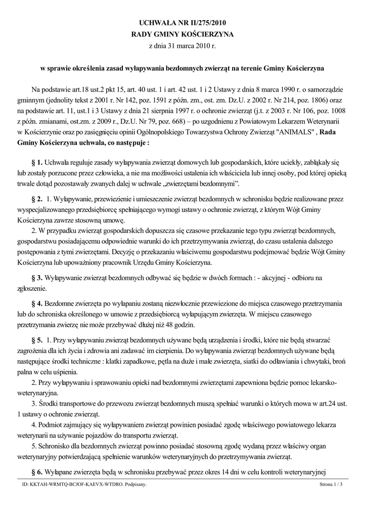 UCHWAŁA NR II/275/2010 RADY GMINY KOŚCIERZYNA z dnia 31 marca 2010 r. w sprawie określenia zasad wyłapywania bezdomnych zwierząt na terenie Gminy Kościerzyna Na podstawie art.18 ust.2 pkt 15, art. 40 ust. 1 i art. 42 ust. 1 i 2 Ustawy z dnia 8 marca 1990 r. o samorządzie gminnym (jednolity tekst z 2001 r. Nr 142, poz. 1591 z późn. zm., ost. zm. Dz.U. z 2002 r. Nr 214, poz. 1806) oraz na podstawie art. 11, ust.1 i 3 Ustawy z dnia 21 sierpnia 1997 r. o ochronie zwierząt (j.t. z 2003 r. Nr 106, poz. 1008 z późn. zmianami, ost.zm. z 2009 r., Dz.U. Nr 79, poz. 668) – po uzgodnienu z Powiatowym Lekarzem Weterynarii w Kościerzynie oraz po zasięgnięciu opinii Ogólnopolskiego Towarzystwa Ochrony Zwierząt "ANIMALS" , Rada Gminy Kościerzyna uchwala, co następuje : § 1. Uchwała reguluje zasady wyłapywania zwierząt domowych lub gospodarskich, które uciekły, zabłąkały się lub zostały porzucone przez człowieka, a nie ma możliwości ustalenia ich właściciela lub innej osoby, pod której opieką trwale dotąd pozostawały zwanych dalej w uchwale „zwierzętami bezdomnymi”. § 2. 1. Wyłapywanie, przewiezienie i umieszczenie zwierząt bezdomnych w schronisku będzie realizowane przez wyspecjalizowanego przedsiębiorcę spełniającego wymogi ustawy o ochronie zwierząt, z którym Wójt Gminy Kościerzyna zawrze stosowną umowę. 2. W przypadku zwierząt gospodarskich dopuszcza się czasowe przekazanie tego typu zwierząt bezdomnych, gospodarstwu posiadającemu odpowiednie warunki do ich przetrzymywania zwierząt, do czasu ustalenia dalszego postępowania z tymi zwierzętami. Decyzję o przekazaniu właściwemu gospodarstwu podejmować będzie Wójt Gminy Kościerzyna lub upoważniony pracownik Urzędu Gminy Kościerzyna. § 3. Wyłapywanie zwierząt bezdomnych odbywać się będzie w dwóch formach : - akcyjnej - odbioru na zgłoszenie. § 4. Bezdomne zwierzęta po wyłapaniu zostaną niezwłocznie przewiezione do miejsca czasowego przetrzymania lub do schroniska określonego w umowie z przedsiębiorcą wyłapującym zwierzęta. W miejscu czasowego przetrzymania zwierzę nie może przebywać dłużej niż 48 godzin. § 5. 1. Przy wyłapywaniu zwierząt bezdomnych używane będą urządzenia i środki, które nie będą stwarzać zagrożenia dla ich życia i zdrowia ani zadawać im cierpienia. Do wyłapywania zwierząt bezdomnych używane będą następujące środki techniczne : klatki zapadkowe, pętla na duże i małe zwierzęta, siatki do odławiania i chwytaki, broń palna w celu uśpienia. 2. Przy wyłapywaniu i sprawowaniu opieki nad bezdomnymi zwierzętami zapewniona będzie pomoc lekarskoweterynaryjna. 3. Środki transportowe do przewozu zwierząt bezdomnych muszą spełniać warunki o których mowa w art.24 ust. 1 ustawy o ochronie zwierząt. 4. Podmiot zajmujący się wyłapywaniem zwierząt powinien posiadać zgodę właściwego powiatowego lekarza weterynarii na używanie pojazdów do transportu zwierząt. 5. Schronisko dla bezdomnych zwierząt powinno posiadać stosowną zgodę wydaną przez właściwy organ weterynaryjny potwierdzającą spełnienie warunków weterynaryjnych do przetrzymywania zwierząt. § 6. Wyłapane zwierzęta będą w schronisku przebywać przez okres 14 dni w celu kontroli weterynaryjnej przechodzą na własność schroniska. a następnie ID: KKTAH-WRMTQ-BCJOF-KAEVX-WTDRO. Podpisany. Schronisko zapewnia opiekę nad zwierzętami do czasu przekazania Strona 1 / 3do adopcji. § 7. Urzędowi Gminy Kościerzyna przysługuje prawo żądania od schroniska, do którego kierowane są bezdomne § 6. Wyłapane zwierzęta będą w schronisku przebywać przez okres 14 dni w celu kontroli weterynaryjnej a następnie przechodzą na własność schroniska. Schronisko zapewnia opiekę nad zwierzętami do czasu przekazania do adopcji. § 7. Urzędowi Gminy Kościerzyna przysługuje prawo żądania od schroniska, do którego kierowane są bezdomne zwierzęta, informacji o postępowaniu z wyłapanymi zwierzętami oraz dokumentów potwierdzających właściwe prowadzenie schroniska. § 8. 1. Informacja o planowanym wyłapywaniu bezdomnych zwierząt w formie akcji będzie podawana do publicznej wiadomości, w sposób zwyczajowo przyjęty , co najmniej 21 dni przed terminem wyłapywania. 2. Informacja zawierać będzie: a) termin wyłapywania bezdomnych zwierząt b) granice terenu, na którym odbywać się będzie wyłapywanie, c) adres schroniska, gdzie umieszczane będą zwierzęta, d) nazwę z danymi teleadresowymi przedsiębiorcy dokonującego wyłapywania zwierząt bezdomnych. § 9. Koszty związane z wyłapaniem i utrzymywaniem zwierzęcia w przypadku, gdy ustalono właściciela, ponosić będzie właściciel zwierzęcia. § 10. Wykonanie uchwały powierza się Wójtowi Gminy Kościerzyna. . § 11. Uchwała podlega podaniu do publicznej wiadomości poprzez publikację w Dzienniku Urzędowym Województwa Pomorskiego oraz wywieszeniu na tablicy ogłoszeń w Urzędzie Gminy Kościerzyna. § 12. Uchwała wchodzi w życie w terminie 14 dni od opublikowania w Dzienniku Urzędowym Województwa Pomorskiego. § 13. Traci moc Uchwała Rady Gminy Kościerzyna nr V/175/04 z dnia 30 czerwca 2004 roku. UZASADNIENIE Ustawa z dnia 21 sierpnia 1997 r. o ochronie zwierząt (Dz.U.nr 111, poz.724 z póź.zm.) w art.11 ust.3 stanowi, że wyłapywanie bezdomnych zwierząt oraz rozstrzyganie o dalszym postępowaniu z tymi zwierzętami odbywa się wyłącznie na mocy uchwały rady gminy. Podjęcie uchwały może nastąpić po uzgodnieniu z powiatowym lekarzem weterynarii oraz po zasięgnięciu opinii upoważnionego przedstawiciela organizacji społecznej, której statutowym celem działania jest ochrona zwierząt. Powiatowy Lekarz Weterynarii w Kościerzynie pismem nr PIW-06-610/9/2010 z dnia 16-03-2010 dokonał uzgodnienia projektu uchwały. Ogólnopolskie Towarzystwo Ochrony Zwierząt Animals pismem z dnia 24-03-2010 roku wyraziło opinię do projektu uchwały. Funkcjo