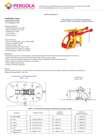 ul.Techniczna 2, 05-500 Piaseczno, tel./fax 22 845 62 75, tel. kom. 501-130-598, email: [email protected], www pergola.com.pl KARTA PRODUKTU Helikopter Cobra Wizualizacja ma charakter pogl¹dowy. Kolory i detale urz¹dzenia mog¹ siê ró¿niæ. system Perfect-Play nr katalogowy PJ.01 Elementy systemu: - podest kwadratowy wys. 590 - kabina helikoptera wys. 400 - zje¿d¿alnia wys. 590 - rura stra¿acka - drabina pozioma Dane techniczne: - rozmiar urz¹dzenia (d³. x szer.): 1430 x 3890 - wysokoœæ urz¹dzenia: 2391 - wysokoœæ upadku: 1900 - strefa bezpieczeñstwa: 4430 x 7160 - rodzaj nawierzchni: zgodnie z Tablic¹ 1 - produkt zgodny z PN-EN 1176-1:2009 MATERIA£Y: - konstrukcja wykonana z belek klejonych z drewna iglastego 90 x 90 mm zabezpieczonych preparatem do drewna, - zakoñczenia belek drewnianych przykryte kapturkami z tworzywa sztucznego, - bariery i elementy ozdobne wykonane z kolorowej sklejki wodoodpornej foliowanej fabrycznie, - dr¹¿ki, os³ony, rura stra¿acka malowane proszkowo, - œruby i nakrêtki ocynkowane, - monta¿ na kotwach stalowych. Monta¿: Wyrób zwi¹zany z gruntem na sta³e poprzez montowanie do fundamentu betonowego na kotwach stalowych ocynkowanych. G³êbokoœæ posadowienia: -500 mm. rzut pionowy skala 1:100 R1500 2391 1900 R1500 250 R1770 590 1770 R1770 1500 1500 890 1430 4430 R1770 1500 R1770 1770 rzut poziomy ze stref¹ bezpieczeñstwa skala 1 : 100 3890 7160 Tablica 1. Powszechnie stosowane materia³y amortyzuj¹ce upadek. gruboœæ minimalna wielkoœæ ziarna materia³ krytyczna wysokoœæ upadku darñ, gleba - - <= 1000 mm kora od 20 do 80 mm 200 mm <= 2000 mm wióry od 5 do 30 mm 200 mm <= 2000 mm piasek od 0,2 do 2 mm 200 mm <= 2000 mm ¿wir od 2 do 8 mm 200 mm <= 2000 mm nawierzchnie syntetyczne zgodnie z HIC zgodnie z HIC wg badania