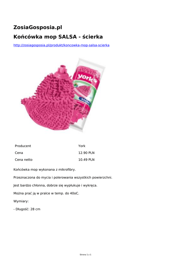 ZosiaGosposia.pl Końcówka mop SALSA - ścierka http://zosiagosposia.pl/produkt/koncowka-mop-salsa-scierka Producent York Cena 12.90 PLN Cena netto 10.49 PLN Końcówka mop wykonana z mikrofibry. Przeznaczona do mycia i polerowania wszystkich powierzchni. Jest bardzo chłonna, dobrze się wypłukuje i wykręca. Można prać ją w pralce w temp. do 40oC. Wymiary: - Długość: 28 cm Strona 1 z 1