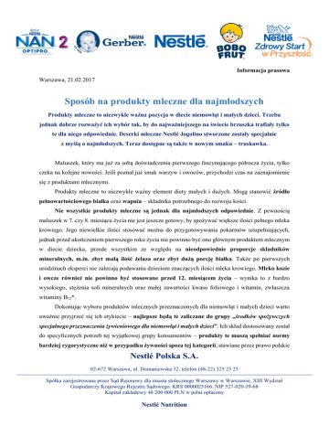 Informacja prasowa Warszawa, 21.02.2017 Sposób na produkty mleczne dla najmłodszych Produkty mleczne to niezwykle ważna pozycja w diecie niemowląt i małych dzieci. Trzeba jednak dobrze rozważyć ich wybór tak, by do najważniejszego na świecie brzuszka trafiały tylko te dla niego odpowiednie. Deserki mleczne Nestlé Jogolino stworzone zostały specjalnie z myślą o najmłodszych. Teraz dostępne są także w nowym smaku – truskawka. Maluszek, który ma już za sobą doświadczenia pierwszego fascynującego półrocza życia, tylko czeka na kolejne nowości. Jeśli poznał już smak warzyw i owoców, przychodzi czas na zaznajomienie się z produktami mlecznymi. Produkty mleczne to niezwykle ważny element diety małych i dużych. Mogą stanowić źródło pełnowartościowego białka oraz wapnia – składnika potrzebnego do rozwoju kości. Nie wszystkie produkty mleczne są jednak dla najmłodszych odpowiednie. Z pewnością maluszek w 7. czy 8. miesiącu życia nie jest jeszcze gotowy, by spożywać większe ilości pełnego mleka krowiego. Jego niewielkie ilości stosować można do przygotowywania pokarmów uzupełniających, jednak przed ukończeniem pierwszego roku życia nie powinno być ono głównym produktem mlecznym w diecie dziecka, przede wszystkim ze względu na nieodpowiednie proporcje składników mineralnych, m.in. zbyt małą ilość żelaza oraz zbyt dużą porcję białka. Także po pierwszych urodzinach eksperci nie zalecają podawania dzieciom znaczących ilości mleka krowiego. Mleko kozie i owcze również nie powinno być stosowane przed 12. miesiącem życia – wynika to z bardzo wysokiego, stężenia soli mineralnych oraz małej zawartości kwasu foliowego i witamin, zwłaszcza witaminy B12*. Dokonując wyboru produktów mlecznych przeznaczonych dla niemowląt i małych dzieci warto uważnie przyjrzeć się ich etykiecie – najlepsze będą te zaliczane do grupy „środków spożywczych specjalnego przeznaczenia żywieniowego dla niemowląt i małych dzieci”. Ich skład dostosowany został do specyficznych potrzeb tej wyjątkowej grupy konsumentów – produkty te muszą spełniać normy bardziej rygorystyczne niż w przypadku żywności spoza tej kategorii, stawiane przez prawo polskie Nestlé Polska S.A. 02-672 Warszawa, ul. Domaniewska 32, telefon (48-22) 325 25 25 Spółka zarejestrowana przez Sąd Rejonowy dla miasta stołecznego Warszawy w Warszawie, XIII Wydział Gospodarczy Krajowego Rejestru Sądowego. KRS 0000025166. NIP 527-020-39-68 Kapitał zakładowy 48 200 000 PLN w pełni opłacony Nestlé Nutrition i europejskie. Maluszek nie jest jeszcze bowiem gotowy na kosztowanie produktów stworzonych z myślą o potrzebach dzieci starszych lub osób dorosłych, dlatego do momentu ukończenia 3. roku życia powinien spożywać żywność dla niego przeznaczoną. Kryterium decydującym o zakupie konkretnego deserku nie powinna być więc zdecydowanie obecność na opakowaniu bajkowych stworków, które przyciągają uwagę maluszka, a właśnie informacja o wieku podawania. Produkty takie znaleźć można w sklepach na półce dedykowanej niemowlętom i małym dzieciom, obok kaszek i słoiczków - to właśnie tam w pierwszej kolejności należy skierować swe kroki. Co ważne, także wielkość porcji tych produktów różni się w stosunku do produktów mlecznych dla dorosłych – opakowanie to 100-gramowy kubeczek, który lepiej odpowiada na potrzeby małych brzuszków. Ciekawą propozycją są mleczne deserki, do których należą Nestlé Jogolino i Nestlé Mleczny deserek. Dostarczą one najmłodszym wapnia, ale także magnezu, potrzebnego do rozwoju kości oraz cynku, potrzebnego do prawidłowego wzrostu oraz funkcjonowania układu odpornościowego. Dzięki możliwości przechowywania w warunkach pokojowych, produkt zawsze ma temperaturę odpowiednią do podania maluszkowi i może towarzyszyć w bliskich i dalekich podróżach. Wapń i magnez powodują, że nam kości się budują. Cynk aktywnie się udziela, w zdrowym wzroście dzielnie wspiera. Fakt, iż produkty te nie muszą być przechowywane w lodówce jest jednak jednocześnie barierą, która nie pozwala wielu mamom po niego sięgnąć, mimo niewątpliwych, wymienionych wyżej jego zalet. Rodzice często obawiają się, że produkty te nie będą bezpieczne, a dodatkowo ich wartość odżywcza nie będzie odpowiednia dla maluszka. By rozwiać te wątpliwości, warto przyjrzeć się bliżej procesom, które powodują, że te produkty mleczne, nawet przechowywane w temperaturze pokojowej, zachowują wysoką jakość, dla której warto uwzględnić je w diecie dziecka. Nikogo nie dziwi, że obiadki czy zupki w słoiczkach na moment, gdy maluszek poczuje głód, czekają nie w lodówce a w kuchennej szafce. Zawdzięczają to m.in. procesowi pasteryzacji, który zapewnia im bezpieczeństwo mikrobiologiczne. Podobny proces pasteryzacji stosowany jest także w przypadku deserków mlecznych Nestlé Jogolino! Oznacza to, iż zostały one poddane działaniu odpowiedniej, dobranej przez specjalistów, temperatury przez odpowiedni, również przez nich określony, czas. Nestlé Polska S.A. 02-672 Warszawa, ul. Domaniewska 32, telefon (48-22) 325 25 25 Spółka zarejestrowana przez Sąd Rejonowy dla miasta stołecznego Warszawy w Warszawie, XIII Wydział Gospodarczy Krajowego Rejestru Sądowego. KRS 0000025166. NIP 527-020-39-68 Kapitał zakładowy 48 200 000 PLN w pełni opłacony Nestlé Nutrition By mamy mogły być jeszcze bardziej spokojne o delikatne brzuszki swoich maluszków, deserki pakowane są w atmosferze ochronnej, zapobiegającej rozwojowi drobnoustrojów. Produkt, umieszczony dodatkowo w hermetycznym, nieprzepuszczającym powietrza opakowaniu, staje się dzięki temu bezpieczny dla maluszka. Dostępne dla rodziców i ich pociech jest kilka wersji smakowych deserków mlecznych Nestlé tak, by maluch mógł poznać już na początku rozszerzania diety jak najwięcej ciekawych 