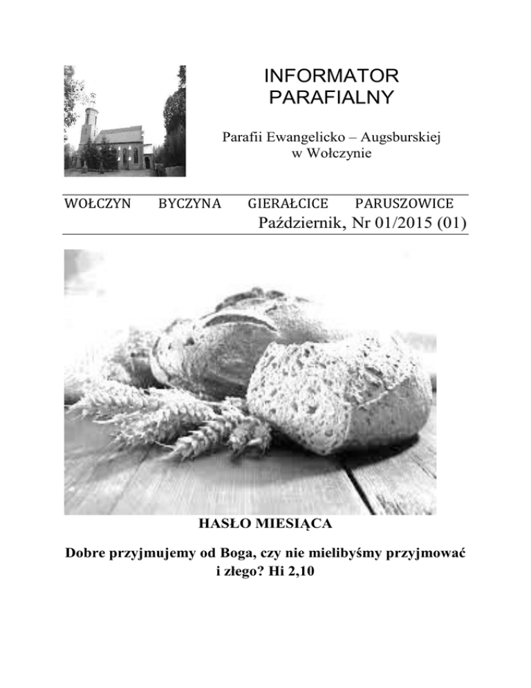 INFORMATOR PARAFIALNY Parafii Ewangelicko – Augsburskiej w Wołczynie WOŁCZYN BYCZYNA GIERAŁCICE PARUSZOWICE Październik, Nr 01/2015 (01) HASŁO MIESIĄCA Dobre przyjmujemy od Boga, czy nie mielibyśmy przyjmować i złego? Hi 2,10 Parafia Ewangelicko-Augsburska w Wołczynie (Wołczyn, Byczyna, Gierałcice, Paruszowice) Pl. Wolności 5, 46-250 Wołczyn Nr konta: 51 88760009 0000 1788 2000 0001 Kontakt: [email protected] Tel.: (77) 414 52 77 Duchowny: Proboszcz: ks. Sebastian Olencki e-mail: [email protected] kom. 533 759 399 Adresy kościołów: Kościół Ewangelicki w Wołczynie – ul. Byczyńska 6. Kościół Ewangelicki w Byczynie – Plac Wolności 1. Kościół Ewangelicki w Gierałcicach – Gierałcice 68a. Kościół Ewangelicki w Paruszowicach – Paruszowice 1 strony internetowe: www.wolczyn.luteranie.pl Słowo od Duszpasterza Drodzy, dziękujemy Wam z całego serca za ciepłe przywitanie w Parafii. Jesteśmy bardzo wdzięczni Panu Bogu, że postawił nas na nowej drodze, w nowej służbie. Nowi ludzie i inna perspektywa. Z wielkomiejskiego tłumu i gwaru, staramy się przyzwyczaić do miejsc, które są obfite w przyrodę i ciszę natury. Czekają nas wyzwania. Na pierwszym planie zapoznanie się z warunkami administracyjnymi i organizacyjnymi. Lekcje religii, nabożeństwa, szkółki, spotkania, odwiedziny. Praca duszpasterska. Rozpoznanie terenu. Nie ukrywam stale w kontakcie z Gliwicami. Pięć lat w jednym miejscu, to nie tak mało. Relacje i więzi ludzkie są bardzo silne. Człowiek bardzo przyzwyczaja się do miejsca, w szczególności do tego, z którego pochodzi. Jeśli będziecie przejeżdżać przez Gliwice, warto zobaczyć wiele wspaniałych miejsc. Może uda nam się wyjechać parafialnie? Cieszymy się, że możemy być wśród Was. Dla nas jest to czas zmian. Córka Noemi poszła do pierwszej klasy by usłyszeć szkolny dzwonek zwiastujący naukę. Żona Ewa będzie nauczać lekcji religii i prowadzić szkółki niedzielne w Wołczynie. Przed nami w październiku Święto Żniw, oraz Pamiątka Reformacji. Zapraszam Was serdecznie by przystąpić do Stołu Pańskiego, który w tych dniach jest szczególnym wydarzeniem, ponieważ zwiastuje on Królestwo Boże, jakże wyczekiwane przez chrześcijan. W tym kontekście należy nadmienić sytuacje prześladowanych chrześcijan na wschodzie, gdzie jak wiemy mają miejsce ataki na Boży Kościół. Dlatego możemy tym bardziej dziękować Bogu, że żyjemy w kraju, gdzie nie ma jak na razie wojny, ani prześladowań. Chrześcijaństwo słabnie na zachodzie, a umacnia się na wschodzie mimo przeciwności. Więcej chrześcijan chodzi w Chinach na tak zwane podziemne nabożeństwa, niż w całej Europie wierzących. A jest ich zaledwie 60 milionów. Są prześladowani, a jednak mają potrzebę wyznawania wiary w Jezusa Chrystusa. Czyżby ci, którzy doświadczają zła potrafią za księgą Hioba powtórzyć słowa „Dobre przyjmujemy od Boga, czy nie mielibyśmy przyjmować i złego?” Hi 2,10. Dlaczego największą wiarę mieli w Biblii tylko ci, którzy borykali się z największymi problemami, przeżywali największe tragedie, uwikłani byli w grzechy, mogli się pochwalić najtrudniejszym życiem? Bo kiedy człowiek przekracza granicę bezsilności wobec wiadomych oznak choroby duszy i ciała, pozostaje mu tylko uwierzyć. Wiara bierze się ze słuchania, więc czego powinniśmy dzisiaj słuchać? Słowa Bożego. Serdeczne podziękowania składam na ręce ks. Bartosza Cieślara i Jego rodzinie za przyjęcie nas na parafii oraz za sumienne przekazanie nam wielu potrzebnych informacji dotyczących życia i struktur poszczególnych miejsc w Parafii. Życzymy Bożego Błogosławieństwa w nowym miejscu służby. z modlitwą ks. Sebastian Olencki Kącik dla dzieci DOLINA CHARIS 1. Narodziny Nad jedną z górskich dolin rozbłysło światło. Drobne jego iskierki powoli zaczęły opadać w różne części doliny. W każdym miejscu gdzie spadła iskierka wyrastał przepiękny, niepowtarzalny kwiat. Dolina przepełniła się tęczą barw i wonią najpiękniejszego zapachu, jaki można sobie wyobrazić. W jeszcze lekko uchylonych kielichach kwiatów zaczęło tętnić życie. Płatki kwiatów rozchyliły się, a w ich wnętrzu siedziały małe uśmiechnięte stworzenia. Każdy z nich był częścią swojego kwiatu. Miał takiego samego kształtu i koloru skrzydła co płatki kielicha, w którym się urodził. Włosy były w tym samym kolorze co pączki kwiatów, a ich ubranka były zielone jak łodygi i liście. Stworzenia te żyły tak długo jak długo kwitły ich kwiaty, a że te kwiaty były w stanie przetrwać najsroższe zimy, to nigdy nie musiały się martwić zmianami pór roku. Gdy wszystkie stworzenia wstały i wyprostowały swoje skrzydełka, pofrunęły na środek doliny. Było tam duże jezioro o krystalicznie czystej wodzie stworzenia unosiły się nad taflą jeziora. Delikatnie muskały powierzchnię wody swoimi stópkami wykonując taniec na cześć swojego stwórcy. Gdy skończyły tańczyć wzbiły się w górę i zaczęły śpiewać przepiękną pieśń pochwalną uwielbiającą tego, który dał im życie. Od tego dnia czyniły tak każdego ranka. Stwórca dał im zadanie, by czyniły dobro wokół siebie, smutek przemieniały w radość, a cierpienie w miłość. „Radośnie wysławiajcie Boga, wszystkie ziemie! Opiewajcie chwałę jego imienia, Śpiewajcie mu pieśń pochwalną!” Ps 66, 1-2 Ewa Olencka Pokoloruj ROZWAŻANIA NA TEMAT KSIĘGI HIOBA Był pewien mąż w ziemi Uz imieniem Job; a mąż ten był nienaganny i prawy, bogobojny i stroniący od złego. Hi 2,10 Księga Hioba jest księgą ponadczasową, dlatego że odwołuje się do ludzkiego problemu, którym jest cierpienie. Człowiek cierpi na wielu płaszczyznach, choćby tych społecznych w których jest mu wmawiane, że wszystko jest w porządku, że nie grozi mu żadne niebezpieczeństwo, że życie jest łatwe. Księga Hioba sta