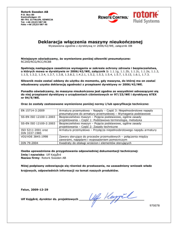 Rotork Sweden AB P.O. Box 80 Kontrollvägen 15 SE-791 22 FALUN, SZWECJA Tel. +46 (0)23 587 00 Faks +46 (0)23 587 45 Deklaracja włączenia maszyny nieukończonej Wystawiona zgodnie z dyrektywą nr 2006/42/WE, załącznik IIB Niniejszym oświadczamy, Ŝe wymienione poniŜej siłowniki pneumatyczne: RC200/RCG/RCC/RC88 Spełniają następujące zasadnicze wymagania w zakresie ochrony zdrowia i bezpieczeństwa, o których mowa w dyrektywie nr 2006/42/WE, załącznik 1: 1.1.1g, 1.1.2b, 1.1.2c, 1.1.2e, 1.1.3, 1.1.5, 1.3.2, 1.3.4, 1.3.7, 1.3.8, 1.3.8.2, 1.4.2.1, 1.5.2, 1.5.3, 1.5.4, 1.5.7, 1.5.13, 1.6.1, 1.7.3. Siłownik moŜe zostać oddany do uŜytku do momentu, gdy maszyna, do której ma on zostać wbudowany uzyska deklarację zgodności z przepisami dyrektywy nr 2006/42/WE. Ponadto oświadczamy, Ŝe maszyna nieukończona jest zgodna ze wszystkimi odnoszącymi się do niej przepisami dyrektywy o urządzeniach ciśnieniowych nr 97/23/WE i dyrektywy ATEX nr 94/9/WE. Oraz Ŝe zostały zastosowane wymienione poniŜej normy i/lub specyfikacje techniczne: EN 15714-3:2009 SS-EN ISO 12100-1:2003 SS-EN ISO 12100-2:2003 ISO 5211:2001 oraz DIN 3337:1985 VDI/VDE 3845:1998 DIN 79:2004 Armatura przemysłowa – Napędy – Część 3: Niepełnoobrotowe napędy pneumatyczne do armatury przemysłowej – Wymagania podstawowe Bezpieczeństwo maszyn – Pojęcia podstawowe, ogólne zasady projektowania – Część 1: Podstawowa terminologia, metodyka Bezpieczeństwo maszyn – Pojęcia podstawowe, ogólne zasady projektowania – Część 2: Zasady techniczne Armatura przemysłowa – Przyłącza niepełnoobrotowego napędu armatury Zawory sterujące do procesów przemysłowych – połączenia między zaworami, napędami i wyposaŜeniem pomocniczym Kwadraty do obsługi wrzecion i elementów sterujących Osoba upowaŜniona do przygotowania odpowiedniej dokumentacji technicznej: Imię i nazwisko: Ulf Kajgård Nazwa firmy: Rotork Sweden AB NiŜej podpisany zobowiązuje się równieŜ do przekazania, na uzasadniony wniosek władz krajowych, odpowiednich informacji na temat naszych produktów. Falun, 2009-12-29 Ulf Kajgård, dyrektor ds. projektowych ___________________________________ 970078