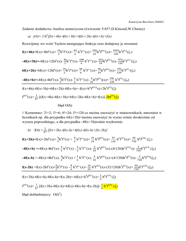 Katarzyna Burchart,204681 Zadanie dodatkowe Analiza numeryczna (ćwiczenie 5/457-D.Kincaid,W.Cheney) a) f(4)≈ 1/h4[f(x+4h)-4f(x+3h)+6f(x+2h)-4f(x+h)+f(x) Rozwijamy we wzór Taylora następujące funkcje oraz dodajemy je stronami: f(x+4h)=f(x)+4hf’(x)+ h2 f”(x)+ h3f”’(x)+ h4 f(IV)(x)+ -4f(x+3h)=-4f(x)-12hf’(x)- h2 f”(x)- h3 f”’(x)- 6f(x+2h)=6f(x)+12hf’(x)+ h2 f”(x)+ h3 f”’(x)+ -4f(x+h)=-4f(x)-4hf’(x)- h2 f”(x)- h3 f”’(x)- h5 f(V)(ξ1) h4 f(IV)(x)h4 f(IV)(x)+ h4 f(IV)(x)+ h5 f(V) (ξ2) h5 f(V) (ξ3) h5 f(V) (ξ4) f(x+4h)-4f(x+3h)+6f(x+2h)-4f(x+h)=-f(x)+h4 f(IV)(x)+2h5 f(V)(ξ) f(IV)(x)= [(f(x+4h)-4f(x+3h)+6f(x+2h)-4f(x+h)+f(x)]-2hf(V)(ξ) błąd O(h) // Komentarz: 2!=2; 3!=6; 4!=24; 5!=120 co można zauważyć w mianownikach, natomiast w licznikach np. dla przypadku 6f(x+2h)=można zauważyć że wyraz rośnie dwukrotnie od wyrazu poprzedniego, a dla przypadku -4f(x+3h)rośnie trzykrotnie. b) f(4) ≈ [f(x+2h)-4f(x-h)+6f(x)-4f(x-h)+f(x-2h)] f(x+2h)=f(x)+2hf’(x)+ h2 f”(x) + h3 f”’(x)+ h4 f(IV)(x)+ h5 f(V)(x)+ h6 f(VI) (ξ1) -4f(x+h) =-4f(x)-4hf’(x)- h2 f”(x) - h3 f”’(x)- h4 f(IV)(x)-(4/120)h5 f(V)(x)- h6 f(VI) (ξ2) -4f(x-h) =-4f(x)+4hf’(x)- h2 f”(x) + h3 f”’(x)- h4 f(IV)(x)+(4/120)h5 f(V)(x)- h6 f(VI)(ξ3) f(x-2h) =f(x)-2hf’(x)+ h2 f”(x) - h3 f”’(x)+ h4f(IV)(x)-(32/120)h5f(V)(x)+ f(x+2h)-4f(x+h)-4f(x-h)+f(x-2h)=-6f(x)+h4 f(IV)(x)+ h6 f(VI) (ξ) f(IV)(x)= [f(x+2h)-4f(x-h)+6f(x)-4f(x-h)+f(x-2h)]- h2 f(VI) (ξ) błąd dokładniejszy: O(h2) h6 f(VI) (ξ4)