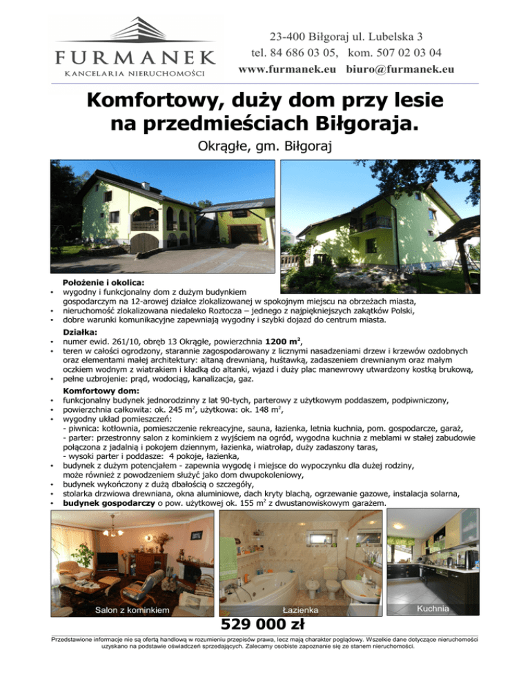 23-400 Biłgoraj ul. Lubelska 3 tel. 84 686 03 05, kom. 507 02 03 04 www.furmanek.eu [email protected] ________________________________________________________________________________________________________________________ Komfortowy, duży dom przy lesie na przedmieściach Biłgoraja. Okrągłe, gm. Biłgoraj • • • • • • • • • • • • • Położenie i okolica: wygodny i funkcjonalny dom z dużym budynkiem gospodarczym na 12-arowej działce zlokalizowanej w spokojnym miejscu na obrzeżach miasta, nieruchomość zlokalizowana niedaleko Roztocza – jednego z najpiękniejszych zakątków Polski, dobre warunki komunikacyjne zapewniają wygodny i szybki dojazd do centrum miasta. Działka: numer ewid. 261/10, obręb 13 Okrągłe, powierzchnia 1200 m2, teren w całości ogrodzony, starannie zagospodarowany z licznymi nasadzeniami drzew i krzewów ozdobnych oraz elementami małej architektury: altaną drewnianą, huśtawką, zadaszeniem drewnianym oraz małym oczkiem wodnym z wiatrakiem i kładką do altanki, wjazd i duży plac manewrowy utwardzony kostką brukową, pełne uzbrojenie: prąd, wodociąg, kanalizacja, gaz. Komfortowy dom: funkcjonalny budynek jednorodzinny z lat 90-tych, parterowy z użytkowym poddaszem, podpiwniczony, powierzchnia całkowita: ok. 245 m2, użytkowa: ok. 148 m2, wygodny układ pomieszczeń: - piwnica: kotłownia, pomieszczenie rekreacyjne, sauna, łazienka, letnia kuchnia, pom. gospodarcze, garaż, - parter: przestronny salon z kominkiem z wyjściem na ogród, wygodna kuchnia z meblami w stałej zabudowie połączona z jadalnią i pokojem dziennym, łazienka, wiatrołap, duży zadaszony taras, - wysoki parter i poddasze: 4 pokoje, łazienka, budynek z dużym potencjałem - zapewnia wygodę i miejsce do wypoczynku dla dużej rodziny, może również z powodzeniem służyć jako dom dwupokoleniowy, budynek wykończony z dużą dbałością o szczegóły, stolarka drzwiowa drewniana, okna aluminiowe, dach kryty blachą, ogrzewanie gazowe, instalacja solarna, budynek gospodarczy o pow. użytkowej ok. 155 m2 z dwustanowiskowym garażem. Salon z kominkiem Łazienka Kuchnia 529 000 zł ____________________________________________________________________________________________________________________________________________________________________________________________ Przedstawione informacje nie są ofertą handlową w rozumieniu przepisów prawa, lecz mają charakter poglądowy. Wszelkie dane dotyczące nieruchomości uzyskano na podstawie oświadczeń sprzedających. Zalecamy osobiste zapoznanie się ze stanem nieruchomości.