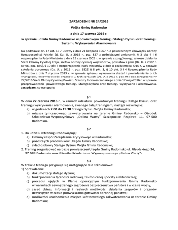ZARZĄDZENIE NR 24/2016 Wójta Gminy Radomsko z dnia 17 czerwca 2016 r. w sprawie udziału Gminy Radomsko w powiatowym treningu Stałego Dyżuru oraz treningu Systemu Wykrywania i Alarmowania Na podstawie art. 17 ust. 6 i 7 ustawy z dnia 21 listopada 1967 r. o powszechnym obowiązku obrony Rzeczpospolitej Polskiej (tj. Dz. U. z 2015 r., poz. 827 z późniejszymi zmianami), § 3 pkt 4 i 6 rozporządzenia Rady Ministrów z dnia 25 czerwca 2002 r. w sprawie szczegółowego zakresu działania Szefa Obrony Cywilnej Kraju, szefów obrony cywilnej województw, powiatów i gmin (Dz. U. z 2002 r. Nr 96, poz. 850), § 10 pkt 7 Rozporządzenia Rady Ministrów z dnia 8 października 2015 r. w sprawie szkolenia obronnego (Dz. U. z 2015 r. poz. 1829) § 8 pkt. 3, § 10 pkt. 3 i 4 Rozporządzenia Rady Ministrów z dnia 7 stycznia 2013 r. w sprawie systemu wykrywania skażeń i powiadamiania o ich wystąpieniu oraz właściwości organów w tych sprawach (Dz. U. z 2013 r. poz. 96) oraz Zarządzenia Nr 27/2016 Szefa Obrony Cywilnej Powiatu Starosty Radomszczańskiego z dnia 17 maja 2016 r. w sprawie przeprowadzenia powiatowego treningu Stałego Dyżuru oraz treningu wykrywania i alarmowania, zarządzam, co następuje: §1 W dniu 22 czerwca 2016 r., w ramach udziału w powiatowym treningu Stałego Dyżuru oraz treningu wykrywania i alarmowania, zwanego dalej treningiem, nastąpi rozwinięcie: a) w godzinach 7.00 do 19.30 Stałego Dyżuru Wójta Gminy Radomsko; b) miejsca tymczasowego zakwaterowania na terenie Gminy Radomsko – Ośrodek Szkoleniowo-Wypoczynkowy „Dolina Warty” Szczepocice Rządowe 11, 97-500 Radomsko. §2 1. Do udziału w treningu zobowiązuję: a) Gminny Zespół Zarządzania Kryzysowego w Radomsku; b) pozostałych pracowników Urzędu Gminy Radomsko; c) skład osobowy Stałego Dyżuru Wójta Gminy Radomsko; 2. Trening zorganizować na bazie pomieszczeń Urzędu Gminy Radomsko ul. Piłsudskiego 34, 97-500 Radomsko oraz Ośrodka Szkoleniowo-Wypoczynkowego „Dolina Warty”. §3 W trakcie treningu przyjmuje się następujące cele szkoleniowe: 1) Sprawdzenie: a) dokumentacji stałego dyżuru; b) funkcjonowania łączności radiowej, telefonicznej i poczty elektronicznej; c) procedur ujętych w Planie operacyjnym funkcjonowania Gminy Radomsko w warunkach zewnętrznego zagrożenia bezpieczeństwa państwa i w czasie wojny; d) zasad obiegu informacji i realnych możliwości działania zespołów i organów decyzyjnych w czasie podwyższania gotowości obronnej państwa; e) możliwości uruchomienia miejsca krótkotrwałego zakwaterowania na terenie Gminy Radomsko; 2) Doskonalenie: a) umiejętności działania oraz współdziałania członków zespołu oraz składu osobowego stałego Dyżuru Wójta Gminy Radomsko, w ramach systemu kierowania obronnego; b) umiejętności posługiwania się sprzętem łączności w czasie dużej dynamiki działań. §4 Do opracowania i przesłania sprawozdania z treningu Szefowi Obrony Cywilnej Powiatu Staroście Radomszczańskiemu zobowiązuję Inspektora ds. ewidencji działalności gospodarczej i obrony cywilnej, w terminie do dnia 30 czerwca 2016 r. §5 Koordynowanie całokształtu przedsięwzięć i nadzór nad przygotowaniem i przeprowadzeniem treningu powierzam Sekretarzowi Gminy oraz inspektorowi ds. ewidencji działalności gospodarczej i obrony cywilnej. §6 Zarządzenie wchodzi w życie z dniem podpisania. Wójt Gminy Radomsko mgr inż. Marian Zaborowski