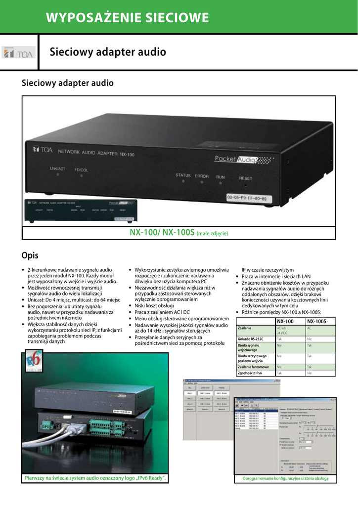 WYPOSAŻENIE SIECIOWE Sieciowy adapter audio Sieciowy adapter audio NX-100/ NX-100S (małe zdjęcie) Opis • 2-kierunkowe nadawanie sygnału audio przez jeden moduł NX-100. Każdy moduł jest wyposażony w wejście i wyjście audio. • Możliwość równoczesnej transmisji sygnałów audio do wielu lokalizacji • Unicast: Do 4 miejsc, multicast: do 64 miejsc • Bez pogorszenia lub utraty sygnału audio, nawet w przypadku nadawania za pośrednictwem internetu • Większa stabilność danych dzięki wykorzystaniu protokołu sieci IP, z funkcjami zapobiegania problemom podczas transmisji danych • Wykorzystanie zestyku zwiernego umożliwia rozpoczęcie i zakończenie nadawania dźwięku bez użycia komputera PC • Niezawodność działania większa niż w przypadku zastosowań sterowanych wyłącznie oprogramowaniem • Niski koszt obsługi • Praca z zasilaniem AC i DC • Menu obsługi sterowane oprogramowaniem • Nadawanie wysokiej jakości sygnałów audio aż do 14 kHz i sygnałów sterujących • Przesyłanie danych seryjnych za pośrednictwem sieci za pomocą protokołu Pierwszy na świecie system audio oznaczony logo „IPv6 Ready”. IP w czasie rzeczywistym • Praca w internecie i sieciach LAN • Znaczne obniżenie kosztów w przypadku nadawania sygnałów audio do różnych oddalonych obszarów, dzięki brakowi konieczności używania kosztownych linii dedykowanych w tym celu • Różnice pomiędzy NX-100 a NX-100S: NX-100 NX-100S Zasilanie AC lub 24 V DC AC Gniazdo RS-232C Tak Nie Dioda sygnału wejściowego Nie Tak Dioda szczytowego poziomu wejścia Nie Tak Zasilanie fantomowe Nie Tak Zgodność z IPv6 Tak Nie Oprogramowanie konfiguracyjne ułatwia obsługę Sieciowy adapter audio Widok z tyłu NX-100/ NX-100S (małe zdjęcie) PC Baza Centrala Linia dedykowana Źródło dźwięku LAN Router Sieciowy adapter audio Linia dedykowana Sprzęt Wzmacniacz Linia dedykowana MIKSER LAN Router Głośnik PC Oddział Internet Sieciowy adapter audio Wzmacniacz Oprogramowanie konfiguracyjne/do obsługi dołączone do NX-100 ADSL lub ISDN Modem router LAN Sieciowy adapter audio Głośnik Przykład zastosowania Specyfikacje NX-100 NX-100S Zasilanie 24 V DC (odłączalna płytka zaciskowa, 3 wtyki) lub zasilacz AC AD-246 (opcjonalny) lub odpowiednik Pobór mocy 4,8 W (zasilanie DC) 7 W (zasilanie DC) Wejście audio 1 kanał (separowany transformatorem), –58 dBV do 0 dBV, symetryczne (przełączalne MIC/LINE, regulowana głośność), 2 kΩ, odłączalna płytka zaciskowa 1 kanał (separowany transformatorem), –58 dBV do 0 dBV, symetryczne (przełączalne MIC/LINE, regulowana głośność), 2 kΩ, odłączalna płytka zaciskowa, zasilanie fantomowe 24 V Wyjście audio 1 kanał (separowany transformatorem), symetryczne, 600 Ω, odłączalna płytka zaciskowa, 3 wtyki Charakterystyka częstotliwościowa 50-14 000 Hz (przy częstotliwości próbkowania 32 kHz) Zniekształcenia Poniżej 0,3% (1 kHz, przy częstotliwości próbkowania 32 kHz) Wejście sterowania 8 kanałów, wejście – beznapięciowy zestyk zwierny, napięcie otwarcia: 12 V DC, prąd zwarciowy: 10 mA, odłączalna płytka zaciskowa, 9 styków Wyjście sterowania 8 kanałów, wyjście - otwarty kolektor, maksymalne napięcie: 30 V DC, prąd sterujący: maks. 50 mA, odłączalna płytka zaciskowa, 9 styków Interfejs sieciowy 10BASE-T/ 100BASE-TX, auto-negotiation Protokół sieciowy TCP/IP, UDP, HTTP, RTP, ARP, ICMP, IGMP System transmisji pakietów audio Unicast (do 4 równoczesnych transmisji), Multicast (do 64 równoczesnych transmisji) Temperatura pracy 0°C do +50°C (0°C do +40°C przy korzystaniu z zasilacza AC) Wilgotność Poniżej 90% wilgotności względnej (bez kondensacji) Wykończenie Blacha stalowa, czarne, połysk 30% Wymiary (Sz. x W x Gł.) 210 x 45 x 188 mm Waga 1,2 kg 0°C do +40°C (0°C do +40°C przy korzystaniu z zasilacza AC)