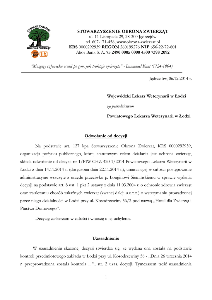 STOWARZYSZENIE OBRONA ZWIERZĄT ul. 11 Listopada 29, 28-300 Jędrzejów tel. 607-171-458, www.obrona-zwierzat.pl KRS 0000292939 REGON 260199276 NIP 656-22-72-801 Alior Bank S. A. 75 2490 0005 0000 4500 7398 2092 “Możemy człowieka ocenić po tym, jak traktuje zwierzęta” - Immanuel Kant (1724-1804) Jędrzejów, 06.12.2014 r. Wojewódzki Lekarz Weterynarii w Łodzi za pośrednictwem Powiatowego Lekarza Weterynarii w Łodzi Odwołanie od decyzji Na podstawie art. 127 kpa Stowarzyszenie Obrona Zwierząt, KRS 0000292939, organizacja pożytku publicznego, której statutowym celem działania jest ochrona zwierząt, składa odwołanie od decyzji nr 1/PIW-CHZ-420-1/2014 Powiatowego Lekarza Weterynarii w Łodzi z dnia 14.11.2014 r. (doręczona dnia 22.11.2014 r.), umarzającej w całości postępowanie administracyjne wszczęte z urzędu przeciwko p. Longinowi Siemińskiemu w sprawie wydania decyzji na podstawie art. 8 ust. 1 pkt 2 ustawy z dnia 11.03.2004 r. o ochronie zdrowia zwierząt oraz zwalczaniu chorób zakaźnych zwierząt (zwanej dalej: u.o.z.z.) o wstrzymaniu prowadzonej przez niego działalności w Łodzi przy ul. Kosodrzewiny 56/2 pod nazwą „Hotel dla Zwierząt i Ptactwa Domowego”. Decyzję zaskarżam w całości i wnoszę o jej uchylenie. Uzasadnienie W uzasadnieniu skażonej decyzji stwierdza się, że wydana ona została na podstawie kontroli przedmiotowego zakładu w Łodzi przy ul. Kosodrzewiny 56 - „Dnia 26 września 2014 r. przeprowadzona została kontrola ....”, str. 2 uzas. decyzji. Tymczasem treść uzasadnienia 1 decyzji nie odwołuje się do wyników własnych kontroli, a opiera wyłącznie na ustnych i pisemnych informacjach od Longina Siemińskiego („Mając na uwadze fakty przedstawione przez właściciela firmy Pana Longina Siemińskiego kontrola nie wykazała prowadzenia schroniska przez firmę Hotel dla Zwierząt i Ptactwa Domowego na terenie posesji przy ul. Kosodrzewiny 56”, str. 3 uzas.), w tym także nieprawdziwych, co do których organ I instancji był zobowiązany mieć wiedzę, że nie noszą one waloru prawdy. Szczególnie dotyczy to informacji, które okazują się nieprawdziwe w konfrontacji z informacjami powszechnie i od dawna znanymi. W rezultacie, uzasadnione domniemanie skarżącego, że zakład w Łodzi przy ul. Kosodrzewiny 56, prowadzi działalność z zakresu podlegającego nadzorowi Inspekcji Weterynaryjnej, nie zostało obalone wynikami kontroli tego zakładu, bo organ faktycznie nie przeprowadził żadnej kontroli w tym kierunku. Nie skonfrontował też oświadczeń Longina Siemińskiego z bogatą instytucjonalną wiedzą organu, zgromadzoną przez co najmniej 10 lat zajmowania się problemem jego zakładu w Łodzi. 1. Uzasadnienie decyzji sugeruje, że z powodu zmiany nazwy przedmiotowy zakład nie istnieje, w takim sensie, że nie dotyczy go zgromadzona dotąd na jego temat wiedza, a jest to jakiś nowy byt prawny, nie mający żadnego związku organizacyjno-funkcjonalnego z Hotelem dla Zwierząt i Ptactwa Domowego Longin Siemiński. Jak wynika z ewidencji działalności gospodarczej, w dniu 06.03.2013 r. dokonana została zmiana oznaczenia (firmy) przedsiębiorcy, poprzez rozszerzenie nazwy w sposób następujący: stare oznaczenie: „LONGIN ALEKSY SIEMIŃSKI HOTEL DLA ZWIERZĄT I PTACTWA DOMOWEGO” nowe oznaczenie: „HOTEL DLA ZWIERZĄT I PTACTWA DOMOWEGO LONGIN SIEMIŃSKI GABINET WETERYNARYJNY, SCHRONISKO, CENTRUM REHABILITACYJNO-SZKOLENIOWO-ADOPCYJNE” Dokonanie takiej zmiany w żadnym razie nie oznacza jednak – jak to przyjmuje organ I instancji – że „przedsiębiorstwo o nazwie Hotel dla Zwierząt i Ptactwa Domowego nie istnieje”, str. 2 2 uzas. Choćby dlatego, że zmiana taka nie miała wypływu na zawarte wcześniej umowy tego przedsiębiorcy z licznymi gminami, a ponadto funkcjonuje on nadal w obrocie gospodarczym także pod starą nazwą. Tak samo figuruje w niektórych rejestrach urzędowych, np. rejestrze zakładów leczniczych dla zwierząt prowadzonym przez Łódzką Izbę Lekarsko-Weterynaryjną (vide rejestr publikowany pod adresem: http://izbalodz.pl/wp- content/uploads/2014/06/rejestr.pdf) - „Gabinet Weterynaryjny Hotelu Dla Zwierząt i Ptactwa Domowego” (treść w dniu składania niniejszego odwołania). Informacja o tym, że pod wcześniejszą nazwą „prowadzona była działalność nieżyjącej już żony Pana Longina Siemińskiego Pani Marioli Siemińskiej” jest nieprawdziwa, o ile sugeruje, że przed dniem zmian nazwy było to inne przedsiębiorstwo innego właściciela. Faktycznie zaś, Longin Siemiński od dnia 13.10.2009 r. ze współwłaściciela stał się wyłącznym właścicielem tego przedsiębiorstwa w wyniku zawarcia między nim a Mariolą Siemińską umowy o częściowy podział majątku wspólnego (vide zał. nr 1). Przedsiębiorstwo to było zresztą wówczas, jak to wynika z treści w/w umowy, rejestrowane przez Powiatowego Lekarza Weterynarii w Łodzi od dnia 12.11.2003 r. 2. O tym, że działalność zakładu w Łodzi przy ul. Kosodrzewiny 56 należy przedmiotowo do zakresu działalności schroniska dla zwierząt świadczy wymownie choćby regulamin wewnętrzny tego zakładu, publikowany pod adresem: http://hotelzwierzat.com/regulamin.php (vide zał. nr 2 – treść regulaminu aktualna na dzień składania niniejszego odwołania). Z piętnastu punktów tego regulaminu pierwszych siedem dotyczy czynności wyłapywania zwierząt, co zasadniczo nie należy do działalności nadzorowanej przez Inspekcję Weterynaryjną, natomiast pozostałe osiem dotyczą stricte czynności przewidzianych wymaganiami weterynaryjnymi dla schronisk i należących przedmiotowo do sfery działalności nadzorowanej. Skarżący daleki jest od stanowiska, że to z wymagań weterynaryjnych wynika zakres przedmiotowy działalności prowadzenia schroniska. Nie twierdzi też, że konkretne czynności muszą być wykonywane wyłącznie w schronisku (np. badanie, leczenie). O działaniu zakładu ja