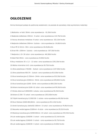 Serwis Samorządowy Miasta i Gminy Koniecpol OGŁOSZENIE Gmina Koniecpol podaje do publicznej wiadomości, że posiada do sprzedaży niżej wymienione materiały: 1.Bednarka- w ilości 30mb -cena wywoławcza – 61,50zł brutto 2.Nadproże żelbetowe 150mm - 6 sztuk- cena wywoławcza-110,70zł brutto 3.Futryny drzwiowe metalowe -9 sztuk- cena wywoławcza- 332,10zł brutto 4.Nadproże żelbetowe 200mm- 1sztuka – cena wywoławcza -24,60zł brutto 5.Rura PE Q 32mm- 30m- cena wywoławcza-18,45złbrutto 6.Drzwi 90 x 200mm- 1sztuka – cena wywoławcza- 307,50zł brutto 7.Nadproża L-19- 30 sztuk- cena wywoławcza- 442,80zł brutto 8.Kabel Net-40mb - cena wywoławcza-24,60zł brutto 9.Rury miedziane 35 x 1,5 – 12 sztuk- cena wywoławcza-1291,50zł brutto 10.Wełna mineralna-1m3 -cena wywoławcza-30,75zł brutto 11.Okna plastikowe 170/206 – 3sztuki- cena wywoławcza-1107,00zł brutto 12.Okna plastikowe 90/170 – 2sztuki- cena wywoławcza-615,00zł brutto 13.Rura kanalizacyjna Q 250mm- 24mb- cena wywoławcza-553,50zł brutto 14.Rura kanalizacyjna Q160mm- 34mb -cena wywoławcza-639,60zł brutto 15.Rura kanalizacyjna Q200- 32mb -cena wywoławcza-664,20zł brutto 16.Kolano kanalizacyjne Q160- 61 sztuk -cena wywoławcza-676,50zł brutto 17.Kineta zbiorcza Q-600/200-1 sztuka -cena wywoławcza-92,25zł brutto 18.Kolano Q 200 -72 sztuki -cena wywoławcza-1353,00zł brutto 19.Trójnik kanalizacyjny Q 200/150- 1 sztuka -cena wywoławcza-49,20zł brutto 20.Rura Stalowa Q168-484,60mb - cena wywoławcza-911,43zł brutto 21.Korek kanalizacyjny (dekiel)Q 160mm- 13 sztuk -cena wywoławcza-79,95zł brutto 22.Nasuwka wodociągowa Q160mm -6 sztuk - cena wywoławcza-29,52zł brutto 23.Redukcja kanalizacyjna Q200/160mm -22 sztuki -cena wywoławcza-243,54zł brutto 24.Łuk wodociągowy Q160/90 -3 sztuki - cena wywoławcza-22,14zł brutto 25.Łuk wodociągowy Q160/45 -5 sztuki - cena wywoławcza-30,75zł brutto 26.Łuk wodociągowy Q160/30- 4 sztuki- cena wywoławcza-24,60zł brutto 1 Serwis Samorządowy Miasta i Gminy Koniecpol 27.Rura wodociągowa PE Q110 -54mb - cena wywoławcza-664,20zł brutto 28.Rura wodociągowa PCV Q 225 -36mb- cena wywoławcza-664,20zł brutto 29.Trójnik PE 160/63- 2sztuki- cena wywoławcza-86,10zł brutto 30.Kołnierz stalowy docisk Q100mm -6 sztuk- cena wywoławcza-147,60zł brutto 31.Króciec jedno kołnierzowy Q200-4 sztuki- cena wywoławcza-172,20zł brutto 32.Trójnik PE 160/110mm – 2 sztuki- cena wywoławcza-86,10zł brutto 33.Studnia Q1000mm -1 sztuka- cena wywoławcza-1230,00zł brutto 34.Trójnik kanalizacyjny PCV 500/200-5 sztuk- cena wywoławcza-615,00zł brutto 35.Trójnik kanalizacyjny PCV200/160 -22 sztuki- cena wywoławcza-1894,20zł brutto 36.Trójnik kanalizacyjny PCV 300/200-7sztuk- cena wywoławcza-668,80zł brutto 37.Kineta przelotowa 400/300- 9sztuk- cena wywoławcza-1217,70zł brutto 38.Rura Arota Q 160mm-21,49mb- cena wywoławcza-787,20zł brutto 39.Studnia kanalizacyjna 630/200mm - 5sztuk- cena wywoławcza-1537,50zł brutto 40.Rura kanalizacyjna 160 x 4,3 x 3 – 41,5mb- cena wywoławcza-765,06zł brutto 41.Rura PE SDR 11 110x 10 – 108mb- cena wywoławcza-1328,40zł brutto 42.Stal z rozbiórki mostu-4000kg- cena wywoławcza-1353,00zł brutto Gmina zastrzega, że osoba zainteresowana kupnem materiałów z pozycji : 1; 5; 8; 9; 10;13; 15; 22; 27; 38; 42: musi zakupić całą ilość asortymentu, pozostałe materiały można kupować pojedynczo. Osoby zainteresowane kupnem prosimy o składanie ofert pisemnych w kancelarii ogólnej Urzędu Miasta i Gminy Koniecpol ul. Chrząstowska 6A pok. nr 15A w terminie do dnia 4.11. 2016r godz.8.30 z dopiskiem „Sprzedaż materiałów”. W dniu 31.10.2016r w godzinach 11.00 do 13.00 można obejrzeć materiały, które w pozycji od 1 do 12 znajdują się przy Urzędzie Miasta i Gminy Koniecpol ul. Chrząstowska 6A, natomiast pozostałe od pozycji 13 do 42 znajdują się w MPK Koniecpol ul. Zachodnia 30/40. Oferta powinna zawierać proponowaną cenę brutto danego materiału, nazwę materiału, ewentualną ilość danego materiału oraz dane zainteresowanej kupnem strony. Otwarcie ofert oraz sprzedaż nastąpi w dniu 4.11.2016r godz.9.00. W przypadku zainteresowania kupnem tej samej rzeczy przez przynajmniej dwóch chętnych decydować będzie cena zaproponowana w negocjacjach ustnych. Gmina zastrzega sobie prawo do unieważnienia sprzedaży na każdym etapie postępowania. 2