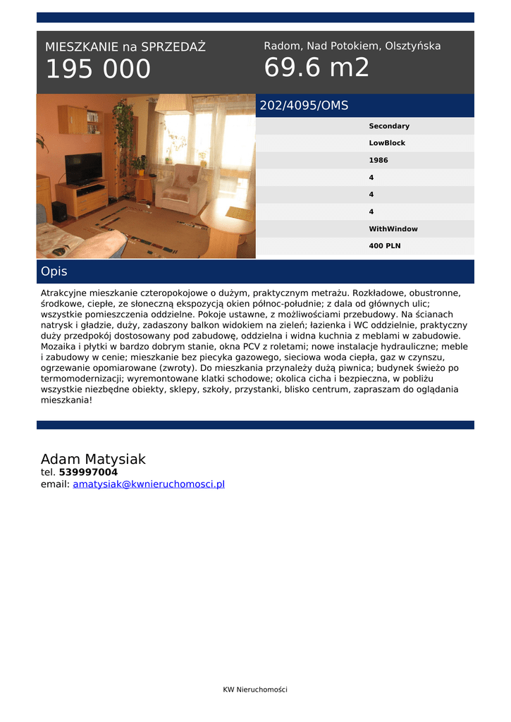 Radom, Nad Potokiem, Olsztyńska MIESZKANIE na SPRZEDAŻ 69.6 m2 195 000 202/4095/OMS Secondary LowBlock 1986 4 4 4 WithWindow 400 PLN Opis Atrakcyjne mieszkanie czteropokojowe o dużym, praktycznym metrażu. Rozkładowe, obustronne, środkowe, ciepłe, ze słoneczną ekspozycją okien północ-południe; z dala od głównych ulic; wszystkie pomieszczenia oddzielne. Pokoje ustawne, z możliwościami przebudowy. Na ścianach natrysk i gładzie, duży, zadaszony balkon widokiem na zieleń; łazienka i WC oddzielnie, praktyczny duży przedpokój dostosowany pod zabudowę, oddzielna i widna kuchnia z meblami w zabudowie. Mozaika i płytki w bardzo dobrym stanie, okna PCV z roletami; nowe instalacje hydrauliczne; meble i zabudowy w cenie; mieszkanie bez piecyka gazowego, sieciowa woda ciepła, gaz w czynszu, ogrzewanie opomiarowane (zwroty). Do mieszkania przynależy dużą piwnica; budynek świeżo po termomodernizacji; wyremontowane klatki schodowe; okolica cicha i bezpieczna, w pobliżu wszystkie niezbędne obiekty, sklepy, szkoły, przystanki, blisko centrum, zapraszam do oglądania mieszkania! Adam Matysiak tel. 539997004 email: [email protected] KW Nieruchomości Powered by TCPDF (www.tcpdf.org)